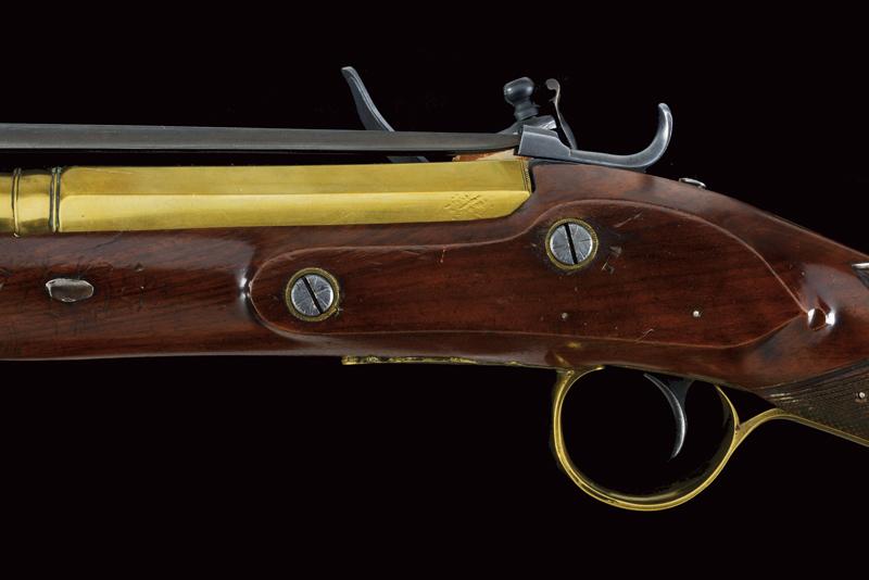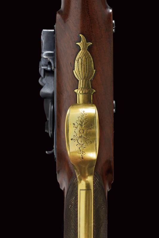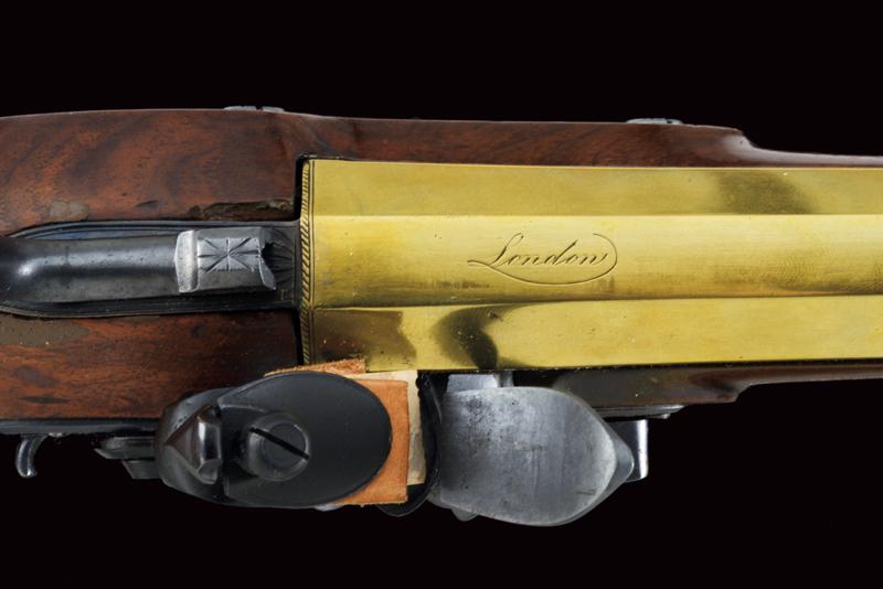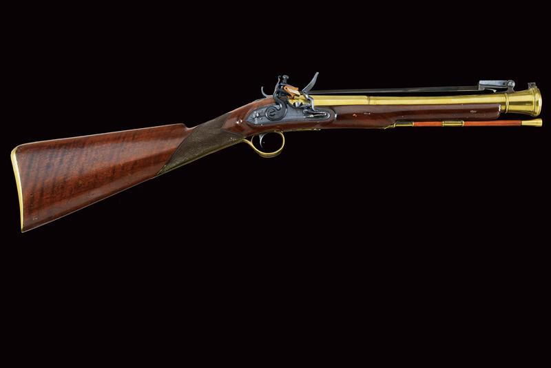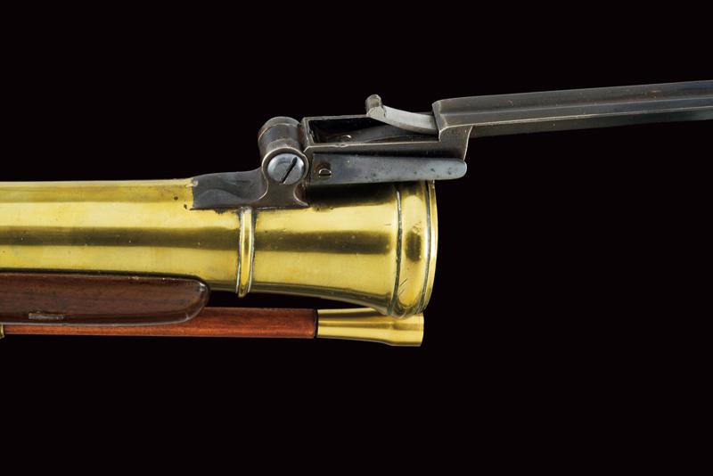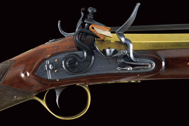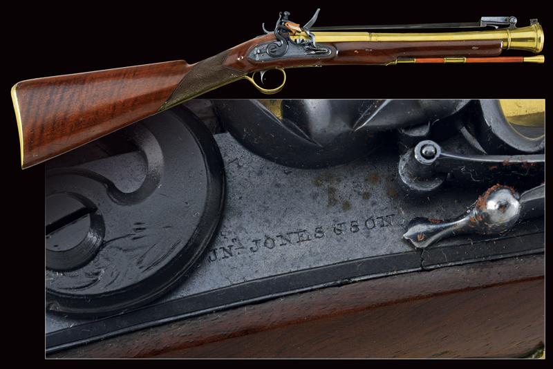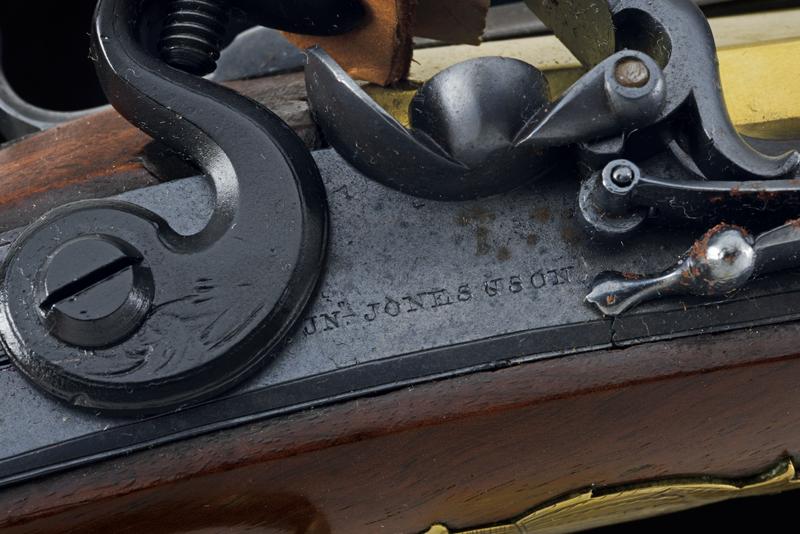 Trombone a pietra focaia da marina con baionetta firmato Jones & Son, datazione: Inizio del XIX Secolo provenienza: Inghilterra, Canna liscia a due ordini, in ottone, prima ottagonale poi tonda, con anellatura al cambio. Il segmento iniziale con inscrizione 'London'. La volata a strombatura circolare, con gioia di bocca. Montata sopra alla canna una baionetta a scatto con lama triangolare in ferro. Il fermo a scorrimento, montato sopra al codolo della canna. Batteria ribrunita dotata di sicura esterna al cane, firma 'J.N. JONES & SON', dotata di scodellino a tenuta stagna e rotellina antifrizione. Il cane probabilmente sostituito. La meccanica ben funzionante. Cassa intera liscia in legno con collo zigrinato. Fornimenti in ottone. Calciolo e ponticello con incisioni floreali. Bacchetta in legno chiaro con battipalla in ottone. Scudetto dorsale liscio. 'Der Neue Stoeckel' riporta Jones & Son (John) come commerciante a Londra nel 1825-1830, presso il 146 a Minories (Vol. 1 pag. 598) lunghezza closed 76,3 cm.