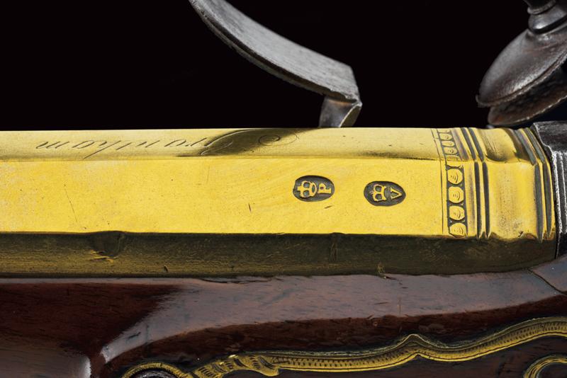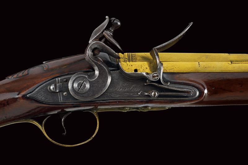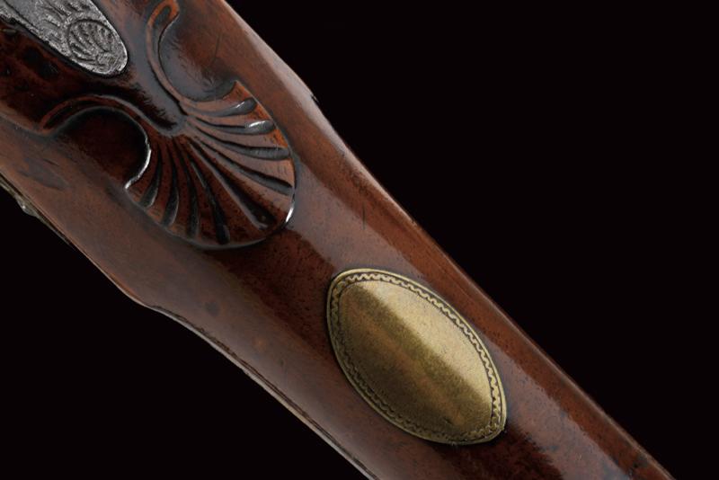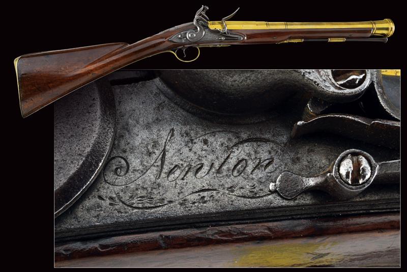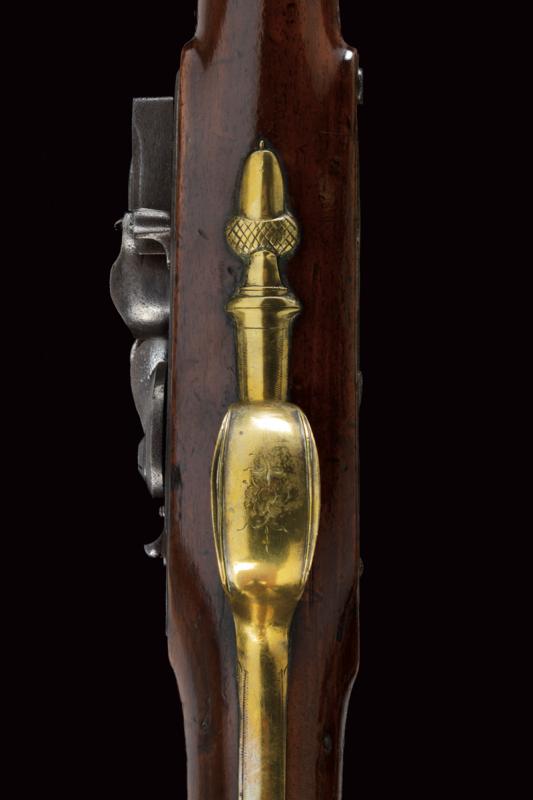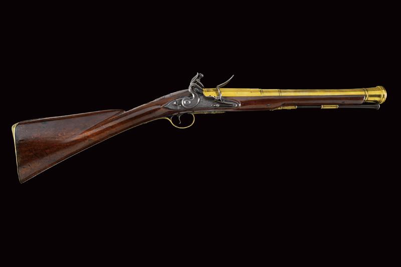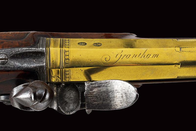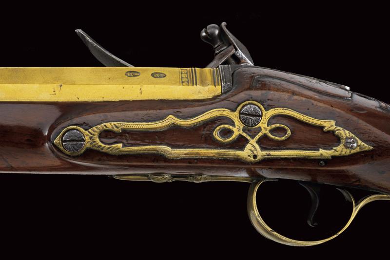 Trombone a pietra focaia da marina firmato Newton, datazione: 1800 circa provenienza: Inghilterra, Canna liscia a tre ordini, in ottone, prima ottagonale con decoro modanato e cornicetta alla base, marcatura 'Grantham' e punzoni del banco di Londra, poi con due segmenti tondi delimitati da anellature. Al termine del tratto ottagonale una breve fascia faccettata. La volata a strombatura circolare, con gioia di bocca e anellatura alla base. Codolo in ferro con intaccature, resti di incisioni e traguardo a sella. Batteria firmata 'Newton', con cane dotato di sicura esterna. La meccanica ben funzionante. Cassa intera liscia in legno con intaglio a conchiglia attorno al codolo della canna. Fornimenti in ottone. Calciolo con incisione a rocaille, il ponticello lavorato a ghianda al codolo anteriore. Contropiastra traforata. Bacchetta in ferro. Newton è documentato a Grantham nel Lincolnshire fra il 1781 e il 1815. Vedi 'Der neue Stoeckel', vol. 2 pag. 867. lunghezza 78,8 cm.