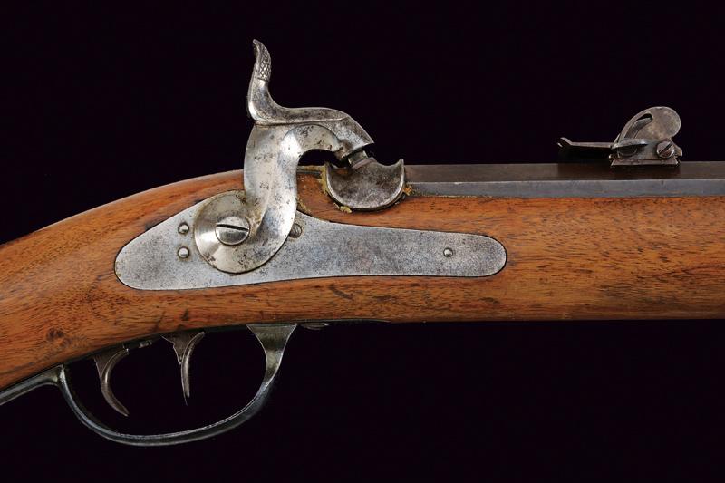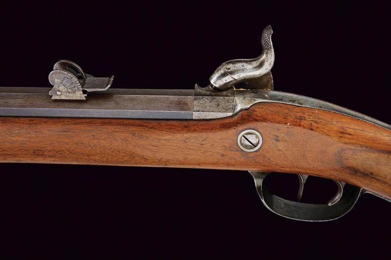 Carabina da tiro a luminello sul tipo Federale Mod. 1851 - premio di gara, datazione: Metà del XIX Secolo provenienza: Svizzera, Robusta canna ottagonale rigata (anima pulita rigatura visibile), dotata di mirino e con alzo regolabile, marcata 'TICINO * 94 PREMIO' dotata di alloggiamento per baionetta del tipo '51, cal. 12 mm. in volata. Culatta e codolo lisci. Batteria a molla in avanti. Meccanica con grilletto e stecher ben funzionante. Cassa intera in legno chiaro, pala con poggiaguancia. Fornimenti in ferro con tracce di brunitura antica e qualche intaccatura. bacchetta in ferro. lunghezza 122,5 cm.