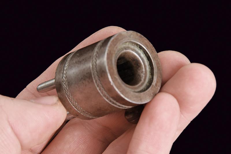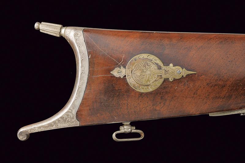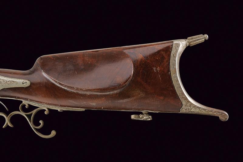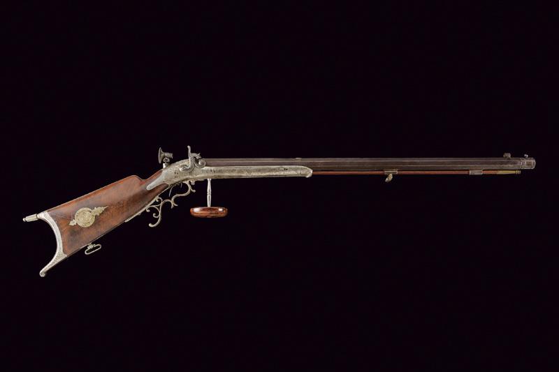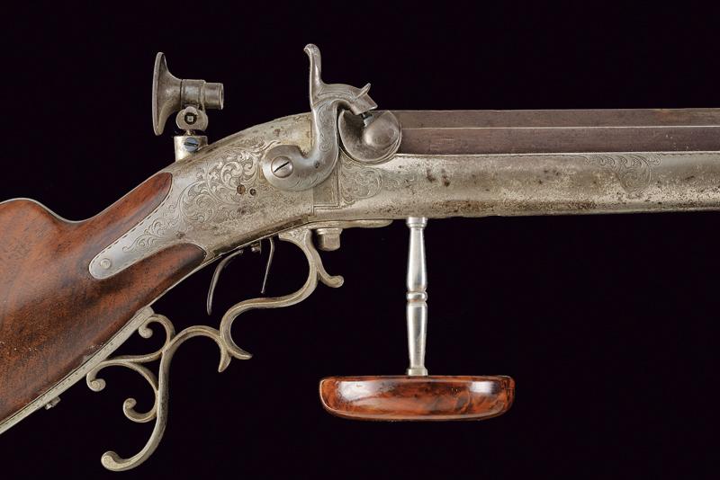 Rara ed elegante carabina da tiro firmata R. Flocke, datazione: Metà del XIX Secolo provenienza: USA, Pesante canna ottagonale rigata, con firma 'R. FLOCKE' al dorso, resti di antica brunitura, la tacca di mira rimossa, il mirino con guaina tubulare. Cal. 10 mm. in volata. Anima con qualche segno d'uso e del tempo, la rigatura visibile. La culatta con incisioni a racemi e il pistone con parascintille. Dotata di meccanica con castello in ferro finemente inciso a racemi su fondo a cerchietti con resti di antica finitura nichelata. Anche il cane con incisioni. L'astina sempre in ferro con resti di finitura e incisioni a racemi en suite. Calcio in legno con ampio poggiaguancia. Il lato destro della pala con patchbox dotato di coperchio in ottone argentato (piccolissimo lo scomparto interno, recante una vite). Fornimenti in ferro. Tutta la pala bordata con bande in ferro. Il calciolo munito di code e con incisioni a racemi en suite. Ponticello a guardia riccamente ornato a ricci. Grilletto e stecher ben funzionanti. Bacchetta in legno con battipalla e cavastracci in ottone. La carabina è dotata di una manopola di presa (più tarda?) con collo in ferro a balaustro e base in legno con bottone in osso, avvitabile in tre posizioni diverse tramite gli appositi fori filettati presenti sotto all'astina. Completa anche del rarissimo prerigatore originale in ferro innestabile sulla volata tramite gli appositi spinotti e dell'apposito avviatore per la pallottala, in ottone. lunghezza 120,5 cm.