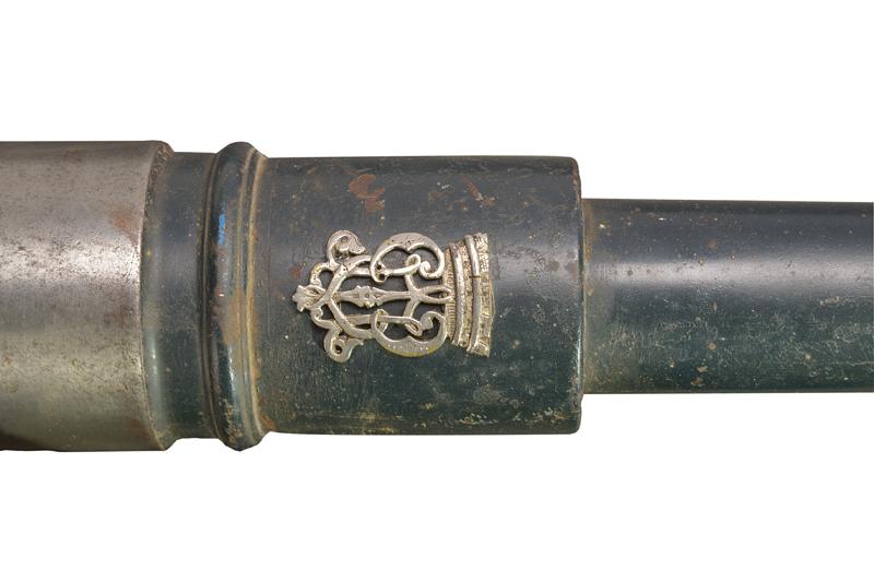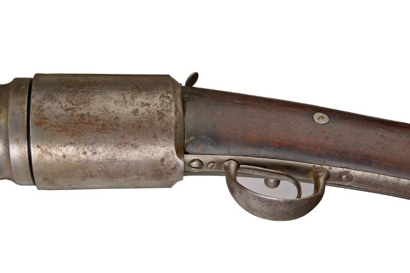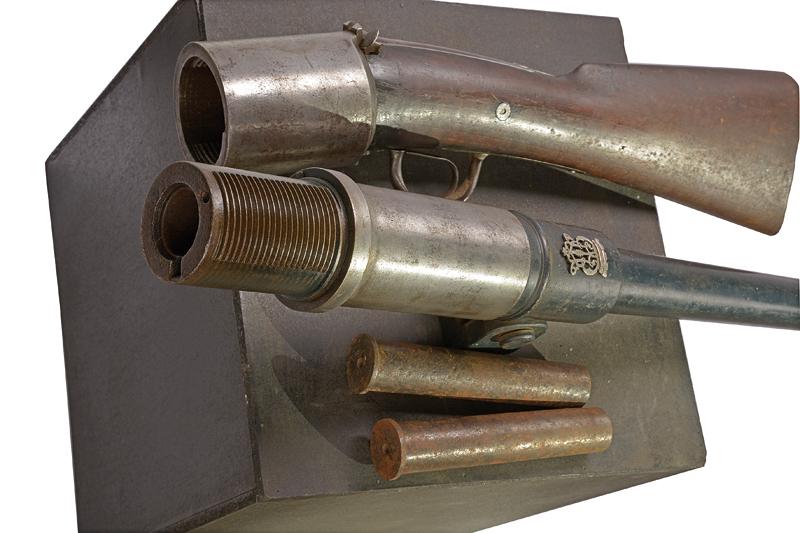 Rara spingarda a retrocarica a percussione centrale, datazione: 1880 circa provenienza: Europa, Canna tonda, liscia, annerita, cal. 27 mm; la base a due ordini, entrambi tondi, il primo svitabile, il secondo con monogramma speculare sotto corona, che ospita una forcella con base troncoconica. Il calcio in legno, con grande camera da scoppio svitabile con meccanismo interno. Insieme a due grandi bossoli (vuoti) in ferro. Base non inclusa. Interessante e rara arma, probabilmente sperimentale, che sembra difficile da caricare, per inserire la cartuccia deve essere svitato il calcio che possiede una lunghissima camera filettata. lunghezza 235 cm.