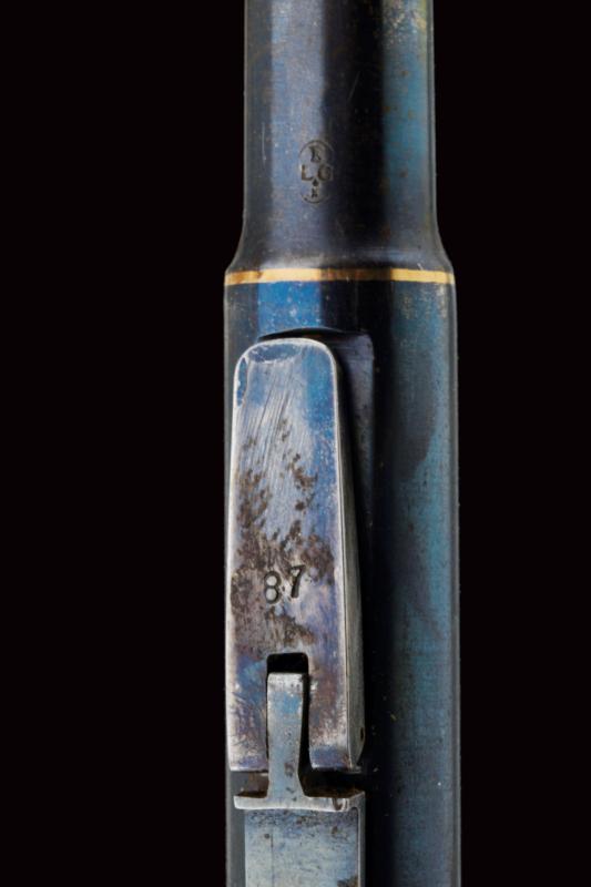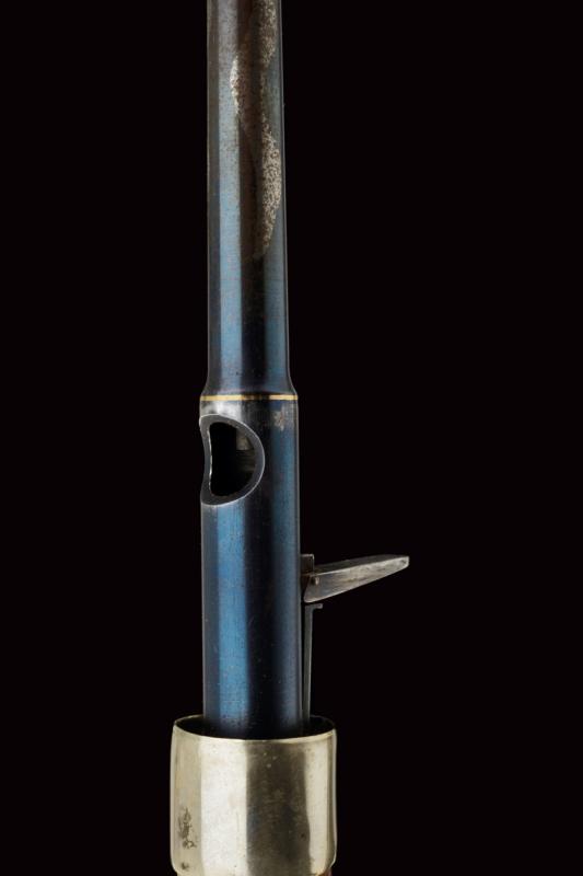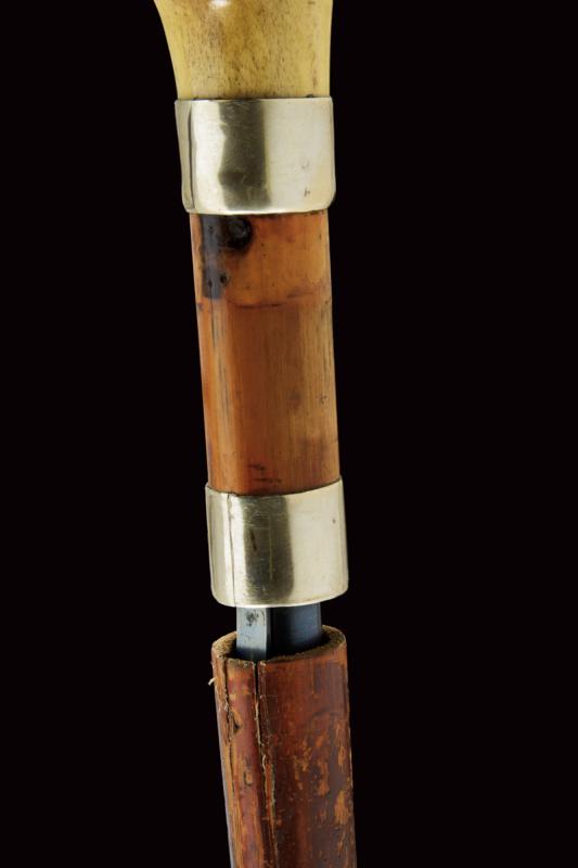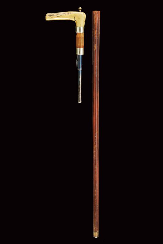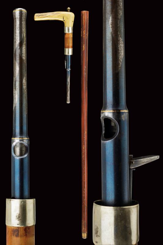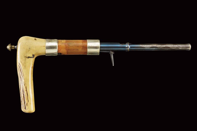 Raro bastone pistola a luminello, datazione: 1860 circa provenienza: Francia, Fusto cilindrico in legno (qualche crepa) con puntale in metallo. Impugnatura angolata in corno di cervo con base in legno e doppia ghiera in metallo bianco. Estratta l'impugnatura, si libera una pistola a luminello con canna tonda, con volata leggermente a cannoncino, brunita, al cambio apertura per inserire il luminello, grilletto pieghevole. Il percussore a molla (fermo da rivedere). lunghezza 29.5 cm.