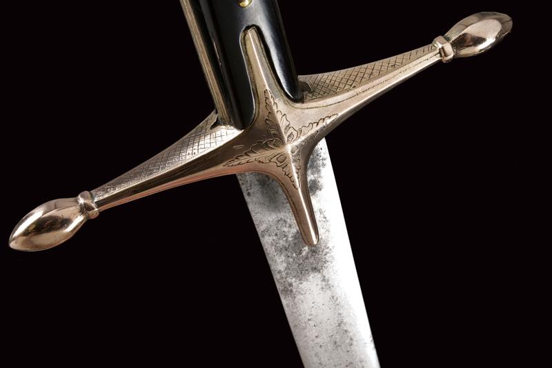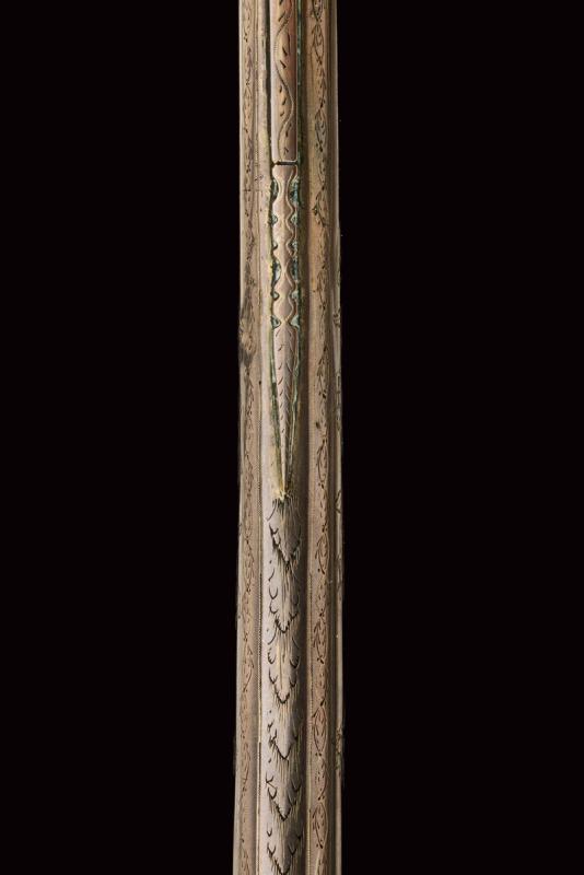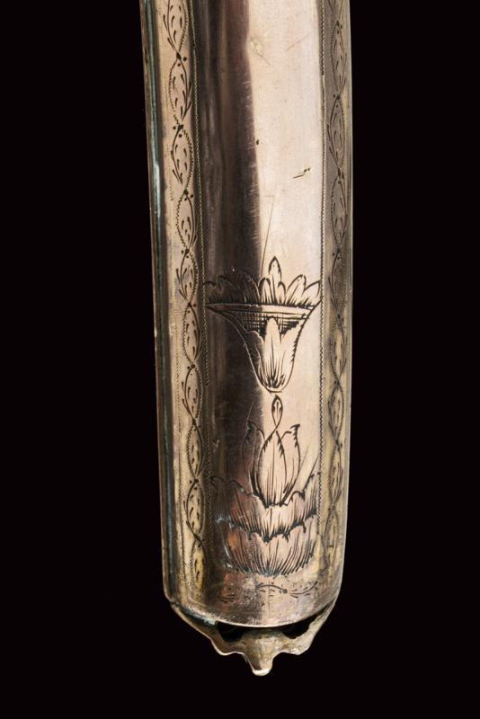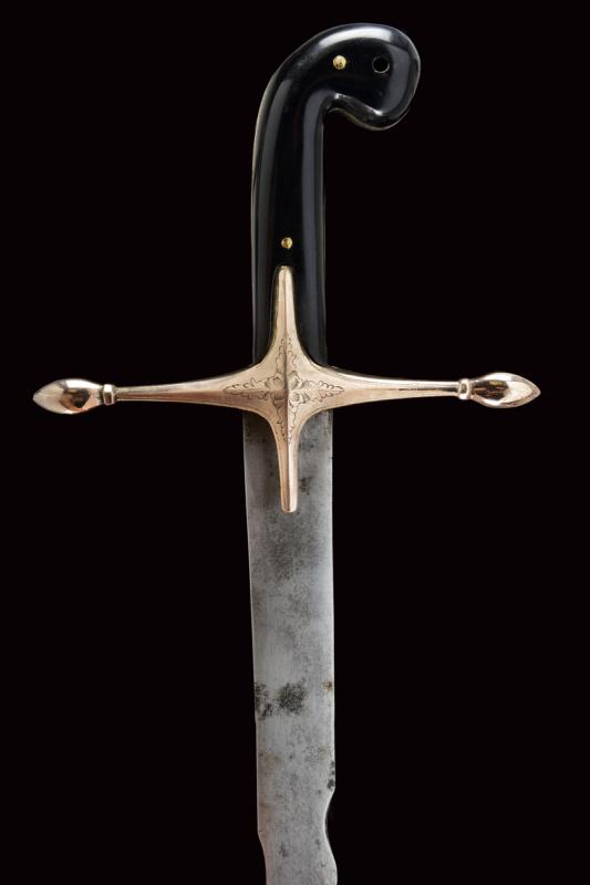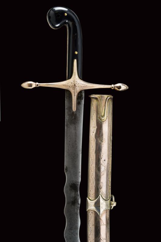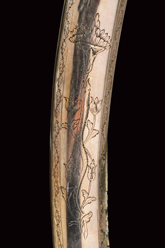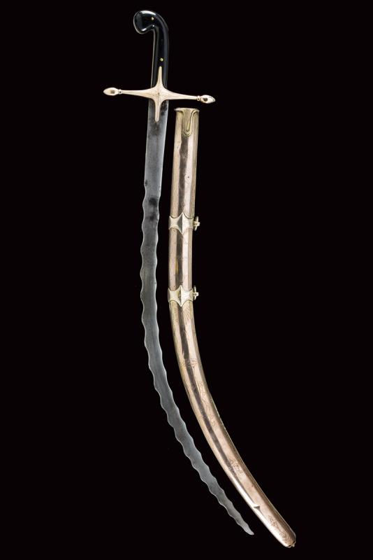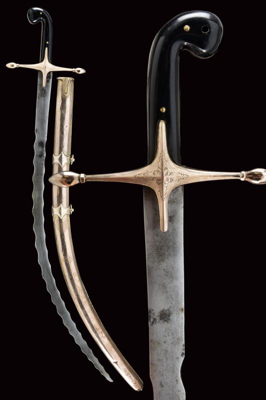 Shamshir, datazione: 1700 circa provenienza: Persia, Lama curva ondulata, elso in argento alla mamelucca inciso, impugnatura a pistola con guance di corno bruno, fodero rivestito in argento inciso a fiorame. lunghezza 92 cm.