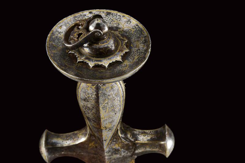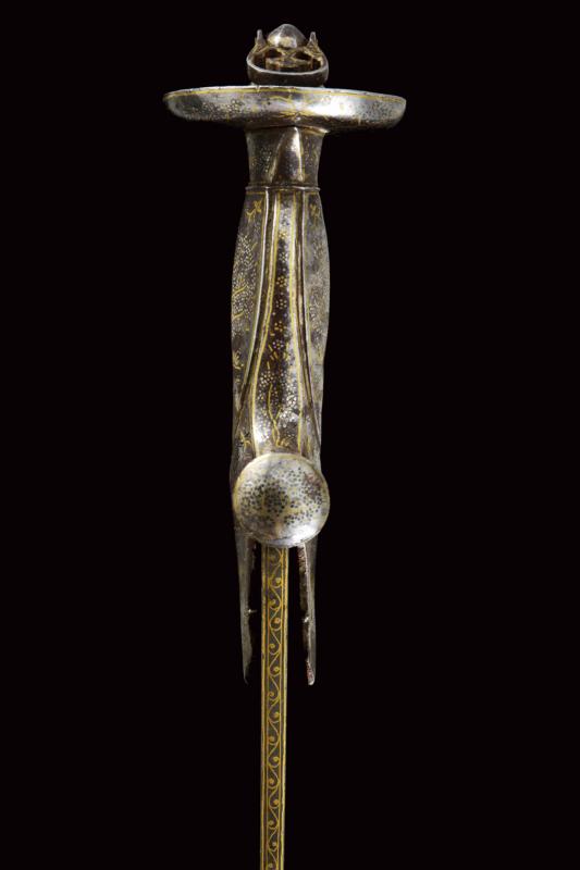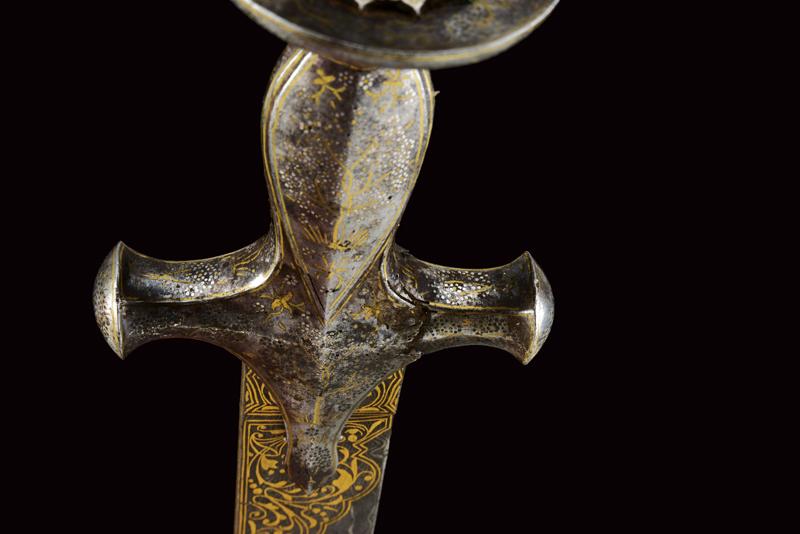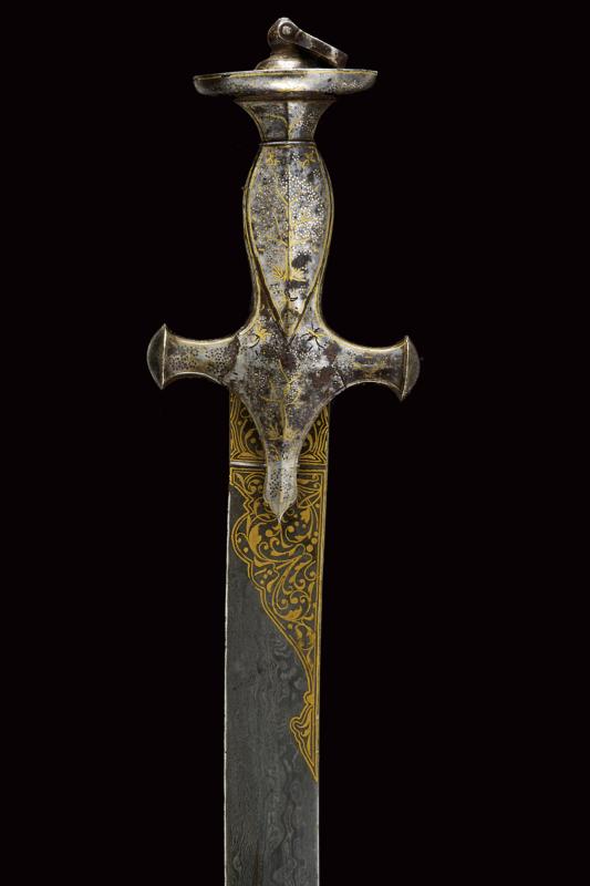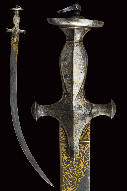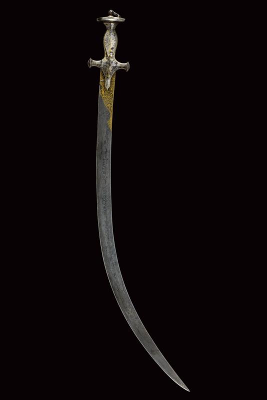 Tulvar, datazione: XIX/XX secolo provenienza: India, Bellissima lama curva piatta a un filo in fine damasco (molto probabilmente anni '70/'80 di Gopilal aus Udaipur, Rajasthan), la base decorata in oro a motivi floreali. Tipico fornimento in ferro (qualche danno probabilmente successo durante l'inserimento della lama) finemente ageminato in oro e argento a motivi floreali. lunghezza 88.5 cm.