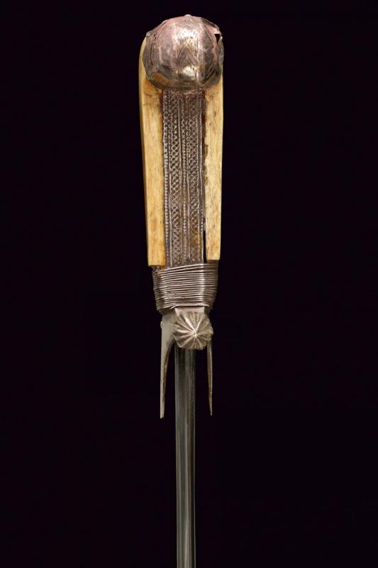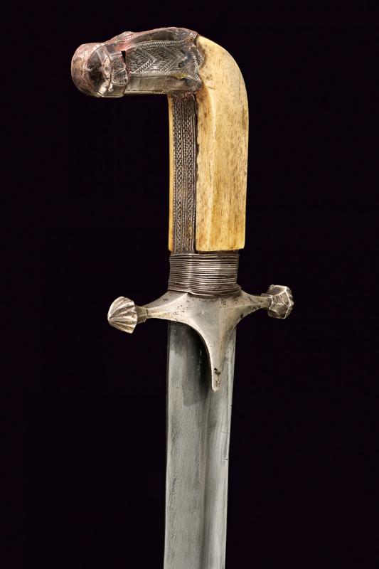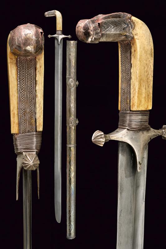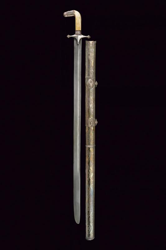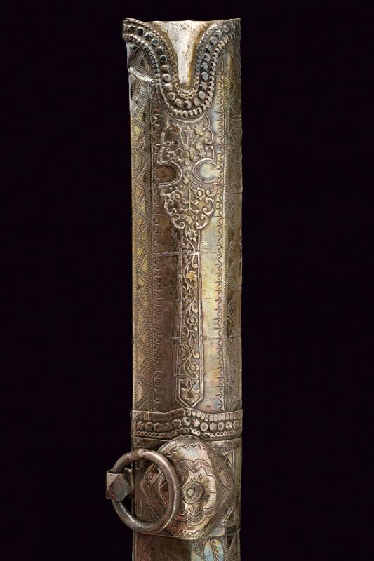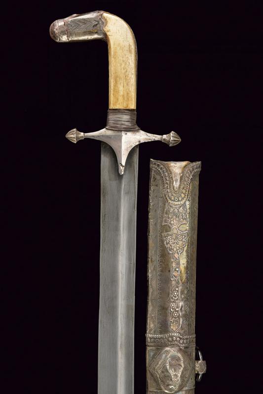 Saif, datazione: XIX Secolo provenienza: Penisola Araba, Lama dritta a un filo con scanalatura dorsale, probabilmente in damasco; fornimento con elso a croce in argento, pomo angolato ricoperto d'argento ed inciso a motivi geometrici, guancette in osso con ghiera in filo d'argento; fodero in legno ricoperto di lamina d'argento finemente inciso a motivi floreali e geometrici. Due anelli di sospensione in ferro. lunghezza 92.5 cm.