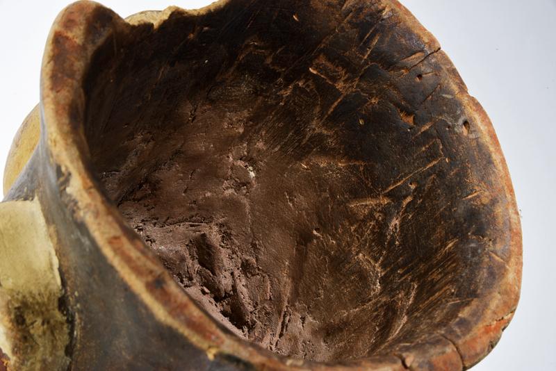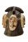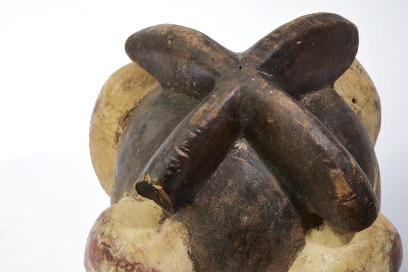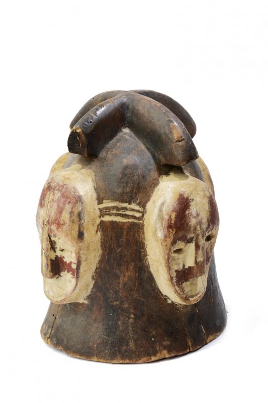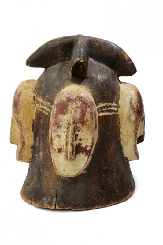 Elmo da capo tribù, datazione: XIX Secolo provenienza: Africa, Scolpito in legno con una croce alla sommità e con quattro facce antropomorfe a rilievo sui quattro lati dipinti in bianco. Mancanze e piccoli difetti. altezza 25 cm.
