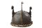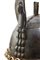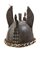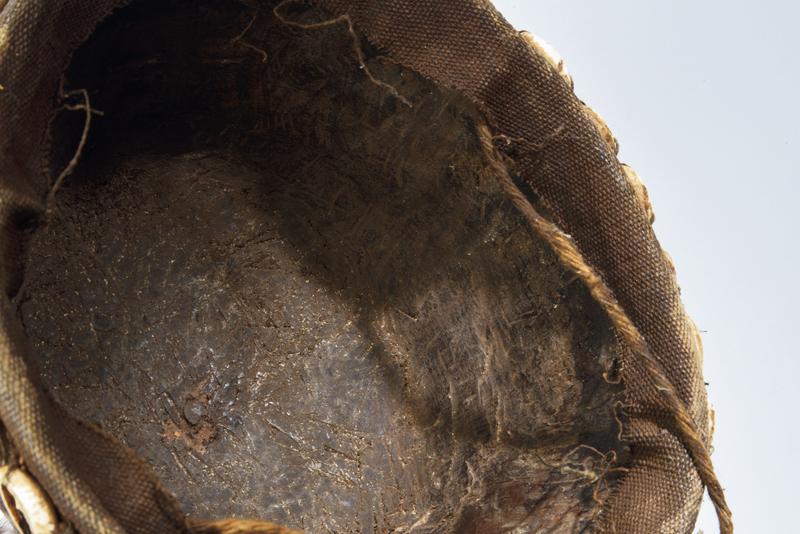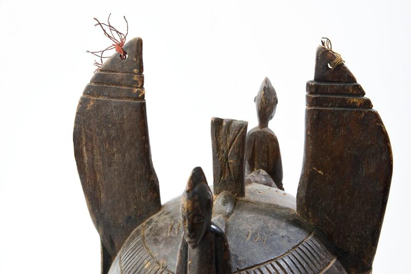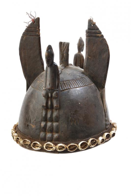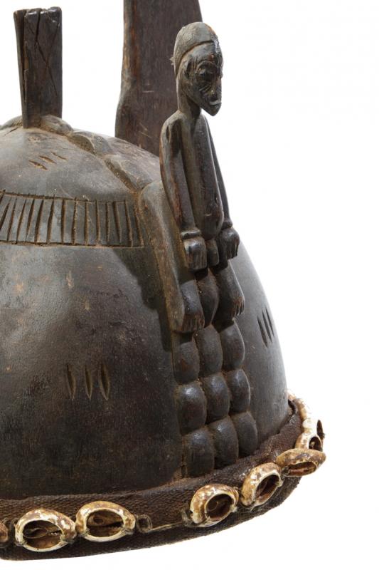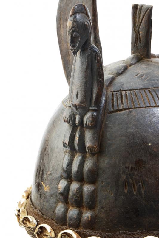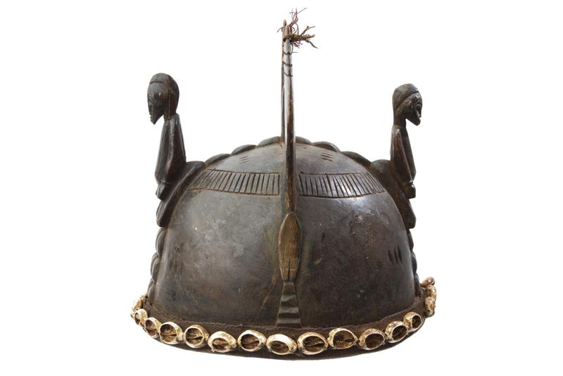 Elmo in legno da capo tribù, datazione: Fine XIX inizio XX Secolo provenienza: Africa, In legno scolpito di forma emisferico, le parti anteriore e posteriore con raffigurazioni di figure antropomorfe a tuttotondo, unite da una bassa cresta a onde con un piccolo rettangolo alla sommità, lateralmente due grande orecchie. La superficie decorata con vari scanalature, la base con banda in tessuto di fibra vegetale decorata con conchiglie bianche (una mancante). Interessante. altezza 23.5 cm.