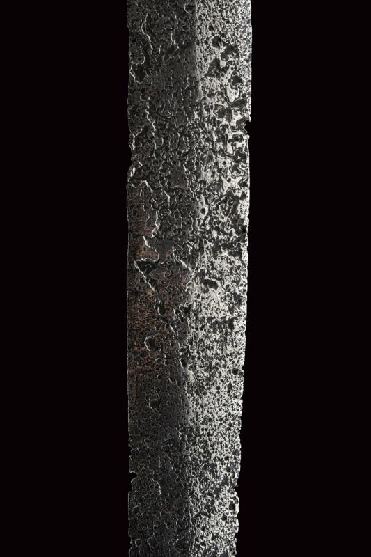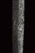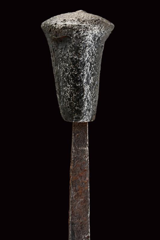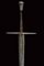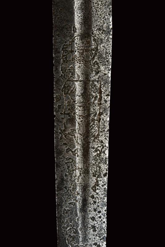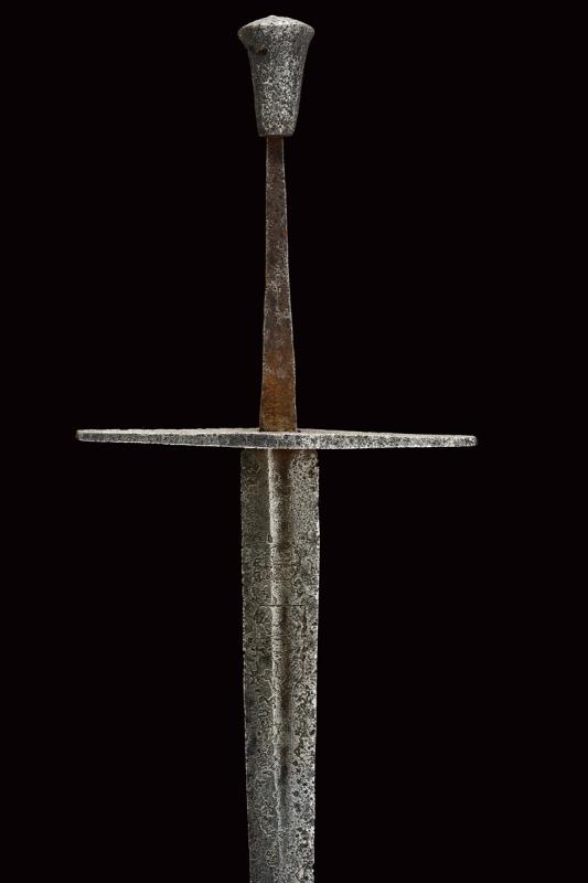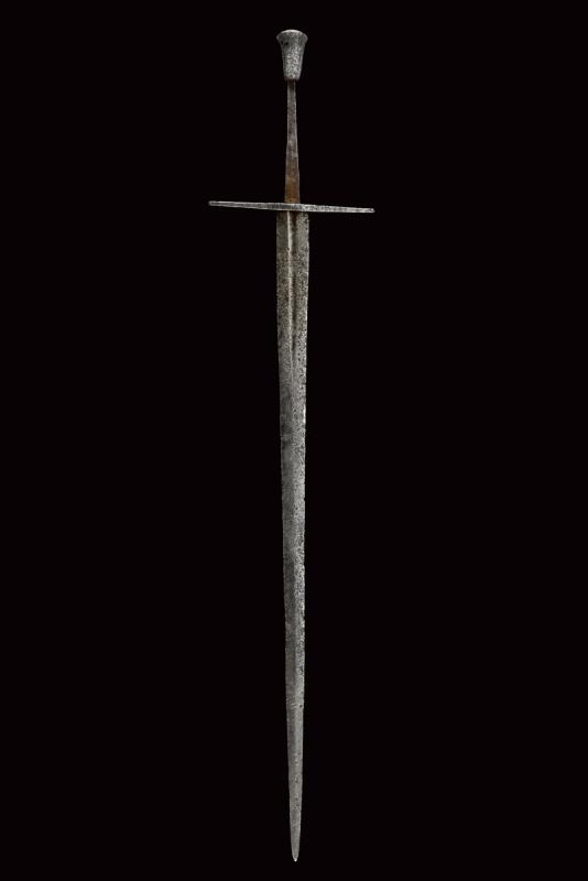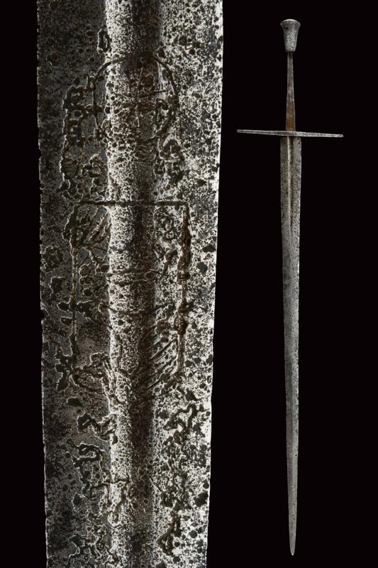 Rara spada da cavaliere, datazione: XIV - XV Secolo provenienza: Germania del Nord, Lama a due fili, la prima parte scanalata, in seguito leggermente costolata, sul lato di terza ancora ben visibile la sagoma di uno stemma sotto un cartiglio circolare. Elso dritto di sezione rettangolare. Pomo troncoconico con la parte superiore ingrossata e ben pronunciata. lunghezza 118.5 cm.
