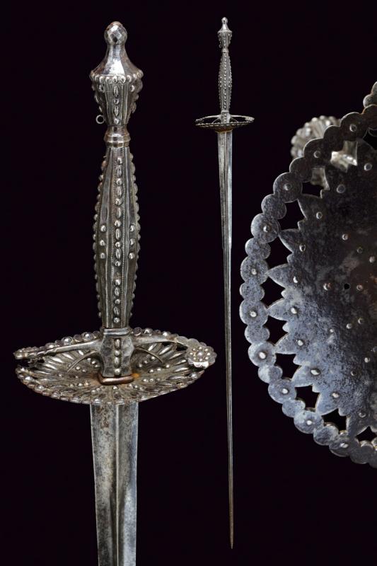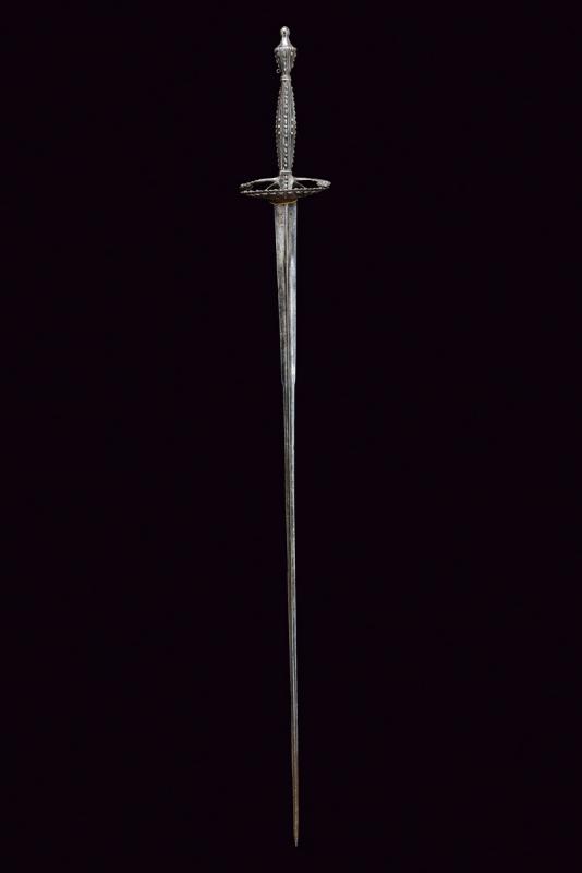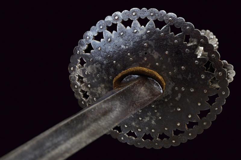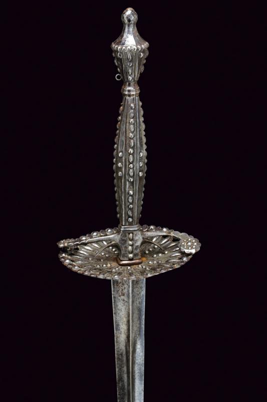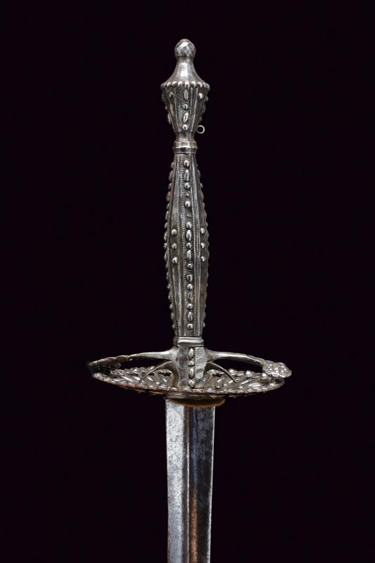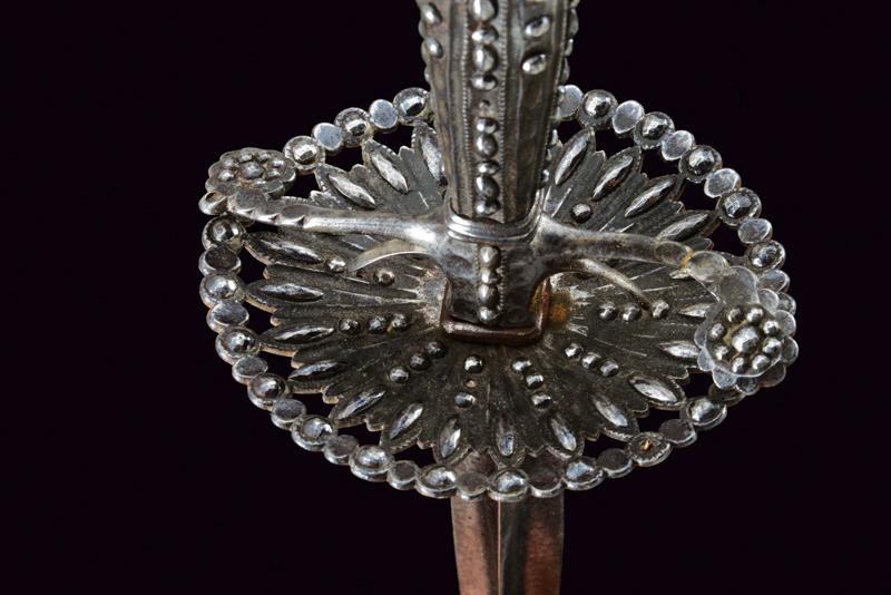 Spadino, datazione: 1800 circa provenienza: Napoli, Lama di sezione triangolare con facce incavate, la base allargata; bellissimo fornimento in acciaio riccamente decorato con perline d'acciaio, la coccia ovale anch'essa traforata. lunghezza 91 cm.