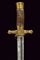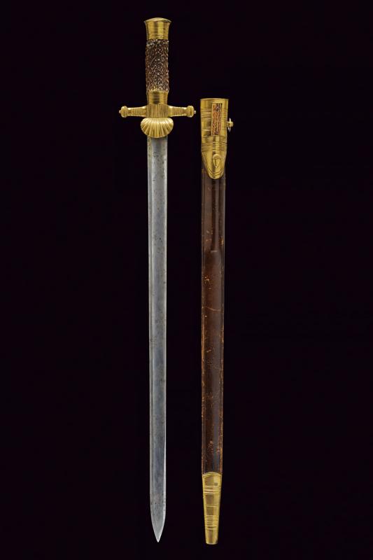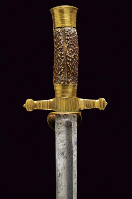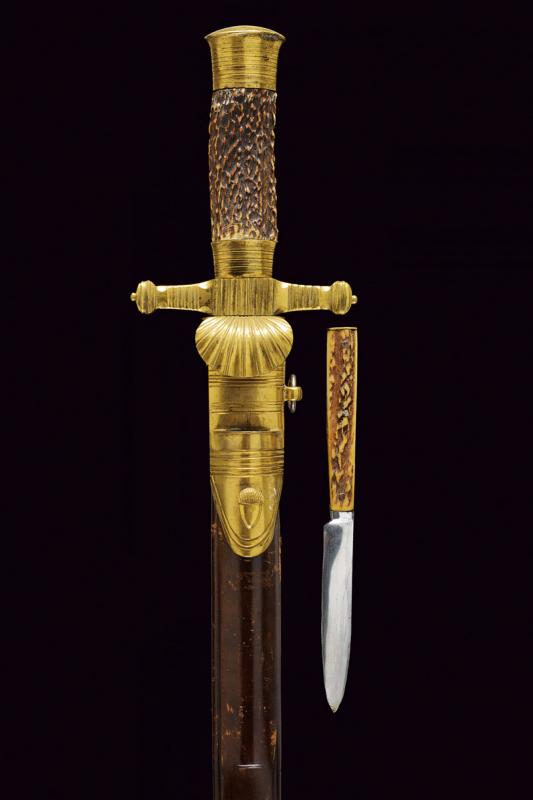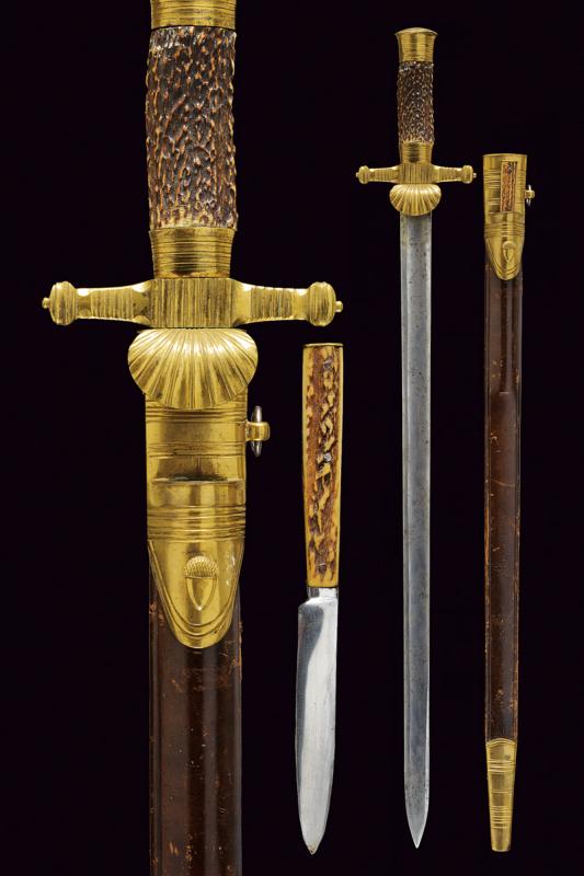 Grande paloscio da caccia, datazione: XIX Secolo provenienza: Germania, Lama dritta a un filo, punta a breve controfilo. Fornimento in ottone con resti di doratura. Elso a bracci dritti decorati a scanalature. Pelta lavorata en suite. Impugnatura in corno di cervo con ghiera e cappellotto recanti anellature. Fodero in cuoio marrone con fornimenti in ottone lavorati en suite con i fornimenti del paloscio. Un coltellino d'accompagno in ferro, con guancette in corno di cervo. Bottoncino a ghianda, una campanella in ferro. lunghezza 80 cm.