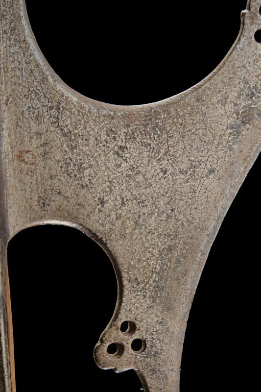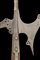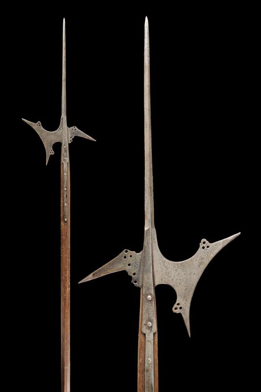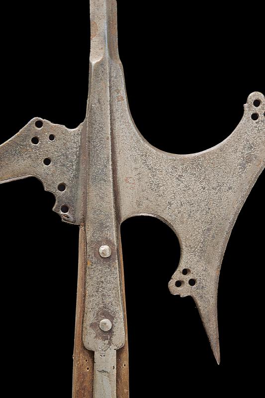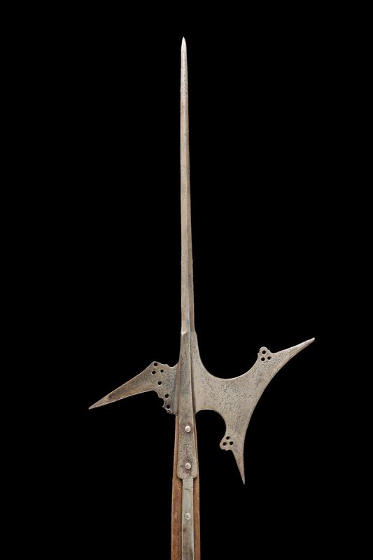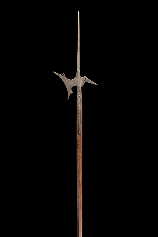 Alabarda incisa, datazione: 1600 circa provenienza: Italia, Cuspide di sezione a losanga; scure con taglio concavo, le gobbe traforate; bacco obliquo verso il basso con punta rinforzata e trafori alla base. Resti di incisioni su entrambi i lati. Bandelle piatte. Fusto ottagonale. altezza 243.5 cm.