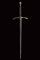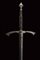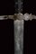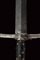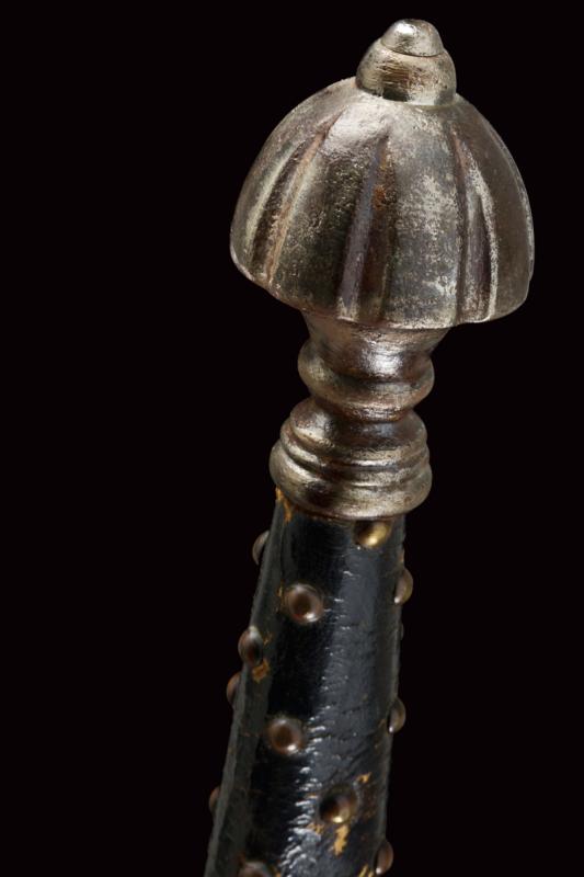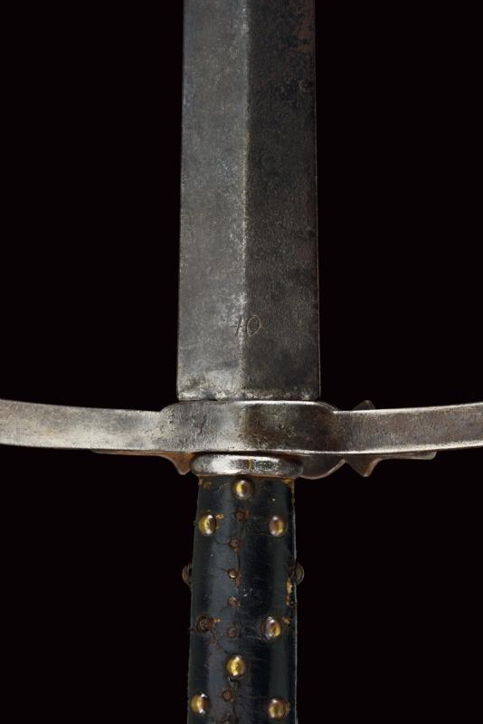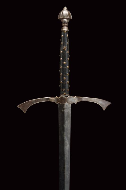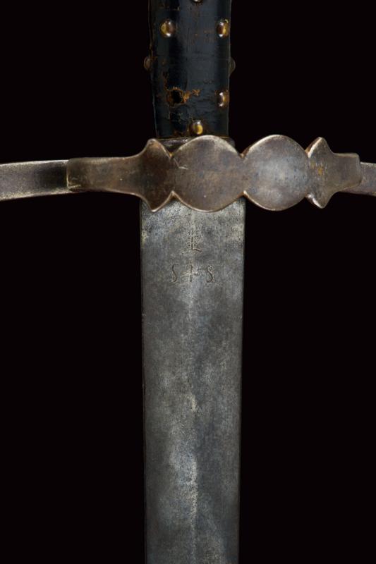 Spada a una mano e mezzo, datazione: XIX Secolo provenienza: Germania, Lama dritta a due fili costolata in mezzeria, la base marcata 'S + S' sotto un simbolo. Fornimento in ferro con grande anello di parata decorato al centro con due ovali. Pomo a fungo con scanalature verticali. Impugnatura in legno rivestito di cuoio e con rivetti in ottone (piccole mancanze). lunghezza 135.5 cm.