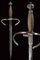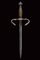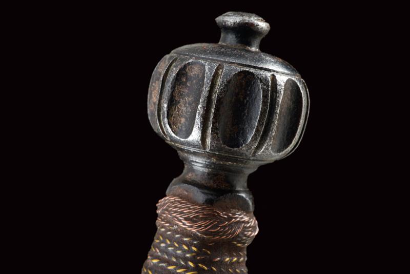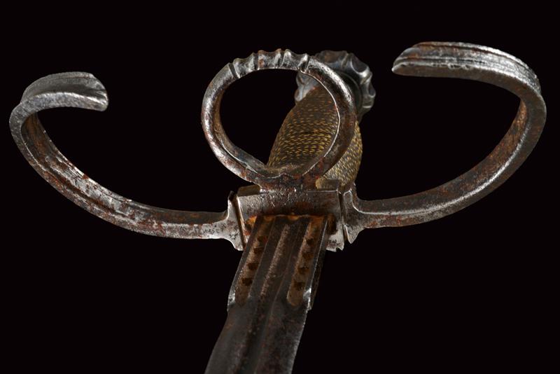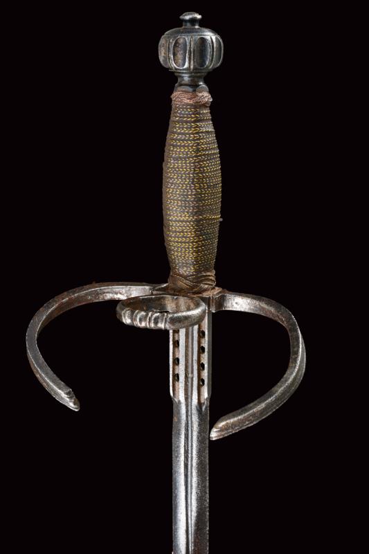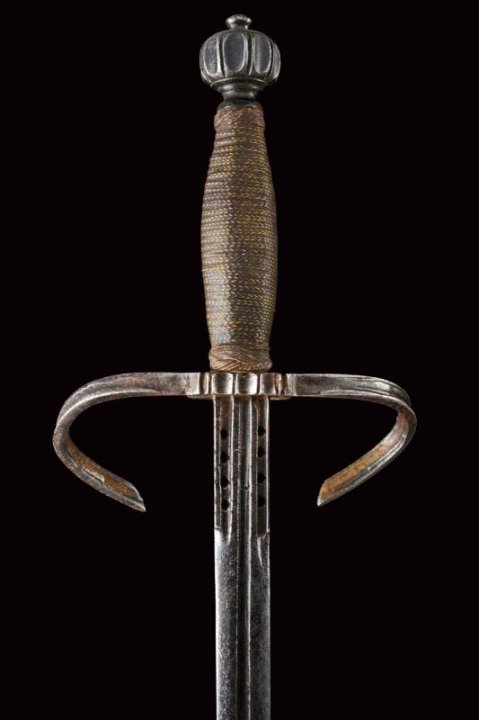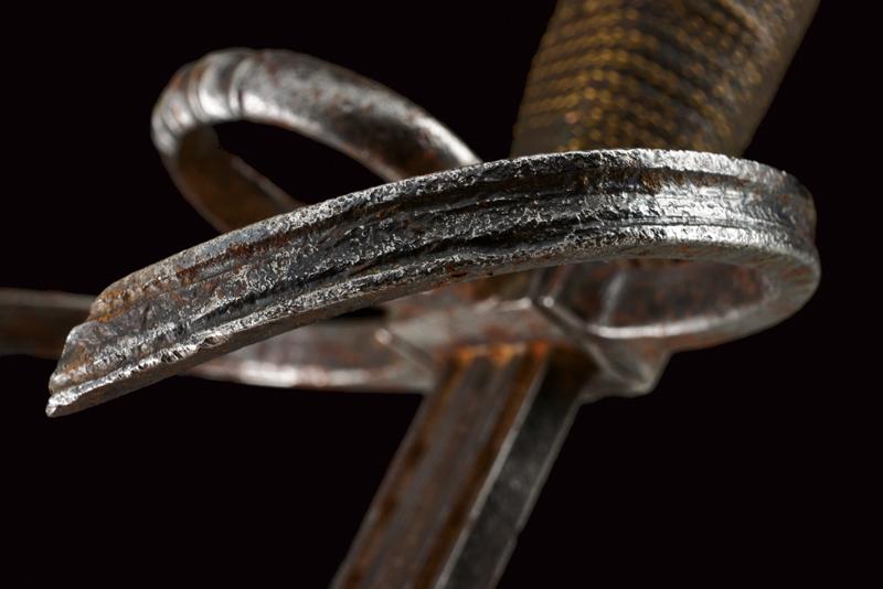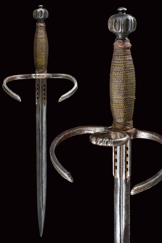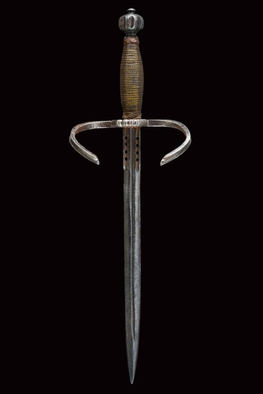 Mano sinistra, datazione: XIX Secolo provenienza: Germania, Bel pugnale in stile sassone del 1600 circa. Lama a due fili con scanalatura centrale e tallone traforato. Fornimento in ferro con bracci curvi, scanalati, inclinati verso il basso. Anello di parata e pomo con scanalature. Impugnatura in legno rivestito di trecciola e teste di moro in filo di rame. lunghezza 44.5 cm.