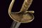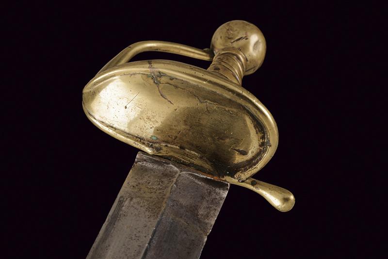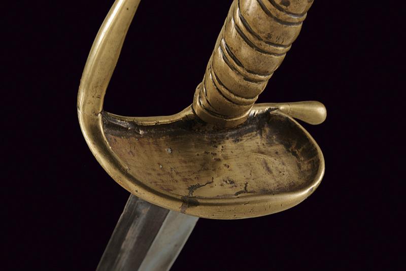 Spada da cavalleria mod. 1695, datazione: 1700 circa provenienza: Francia, Larga lama dritta a due fili con nervatura centrale e piccolo tallone. Fornimento massiccio in ottone con valva anteriore, ramo di guardia, pomo a prugna e impugnatura a spire. Provenienza: Collezione R. Brooker, n. inventario S - 63 lunghezza 111 cm.