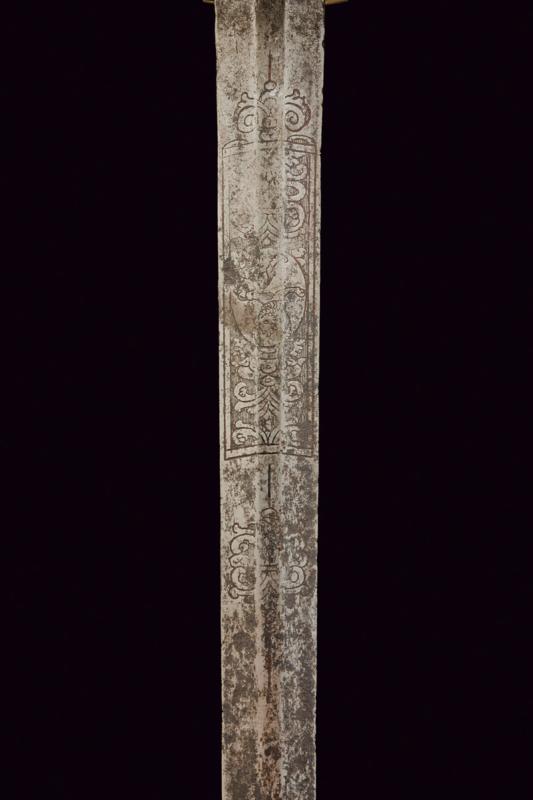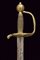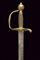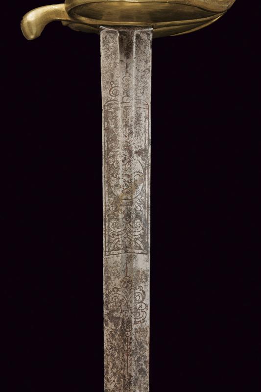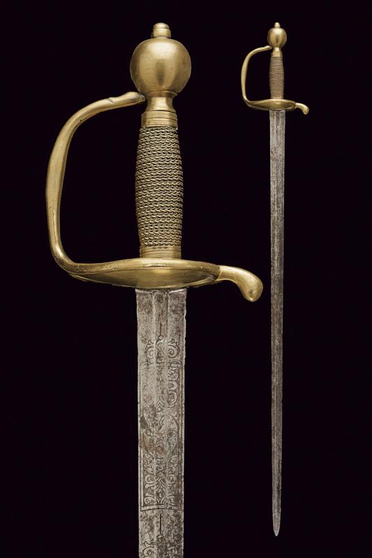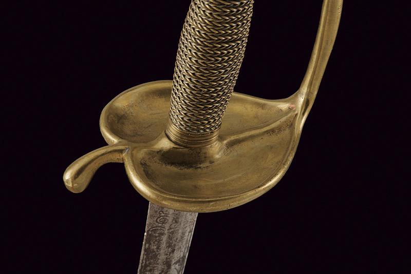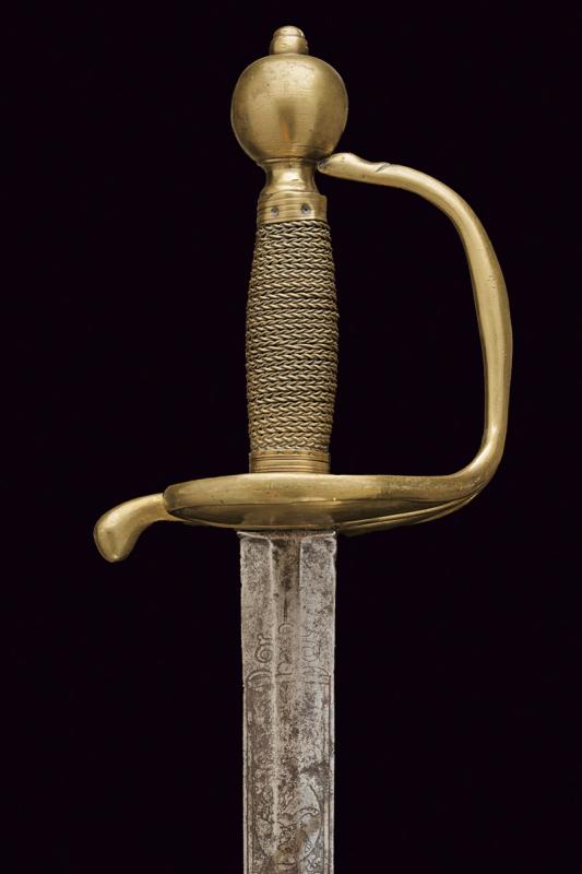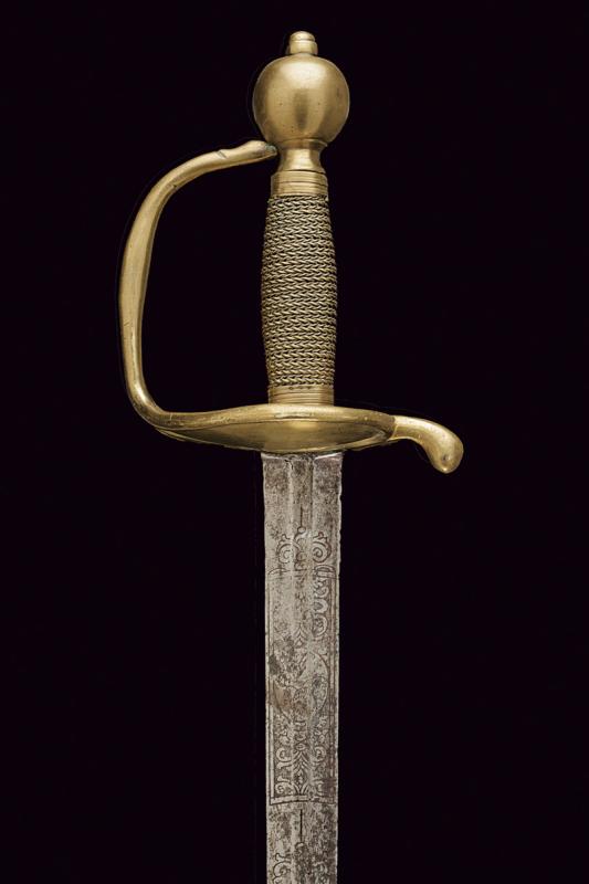 Spada da ufficiale di cavalleria mod. 1734, datazione: secondo quarto del XVIII Sec. provenienza: Francia, Lama dritta a due fili di sezione esagonale, danni da ruggine, la prima parte incisa con leone sotto corona e motivi floreali su entrambi i lati. Fornimento in ottone con valva a cuore, ramo di guardia, grande pomo quasi sferico ed impugnatura rivestita di trecciola in filo d'ottone e ghiere in lamina d'ottone. Provenienza: Collezione R. Brooker, n. inventario S - 480. lunghezza 104 cm.