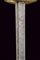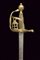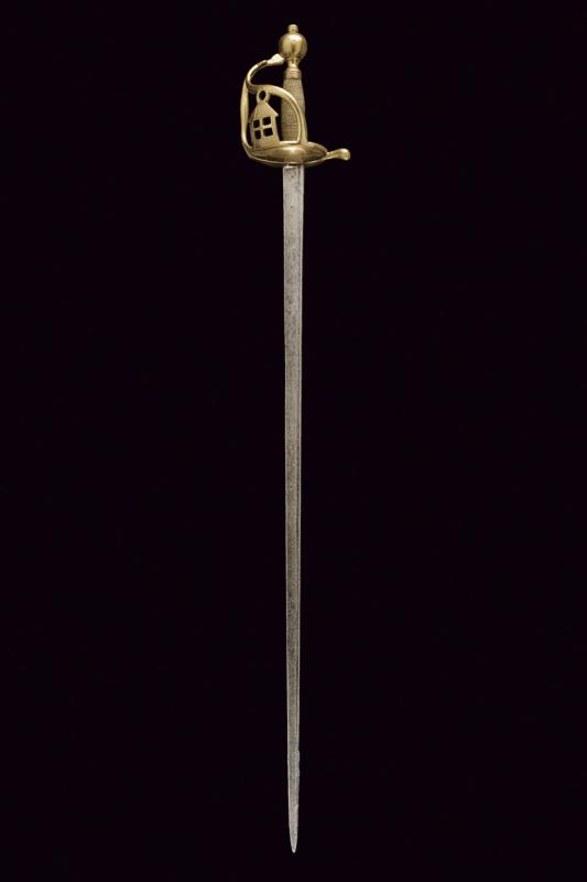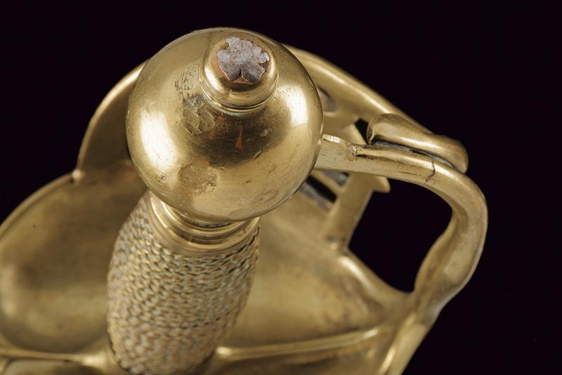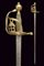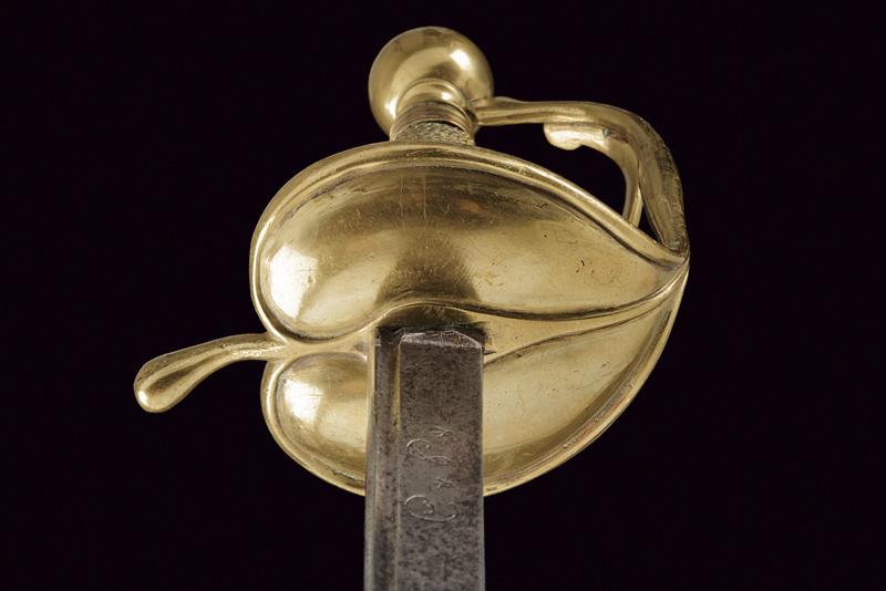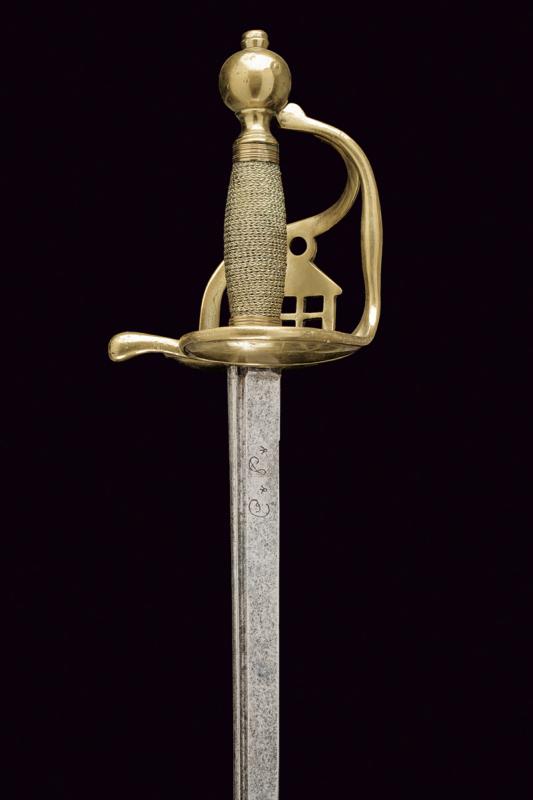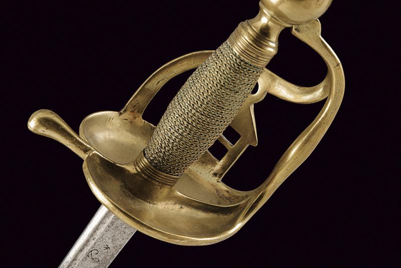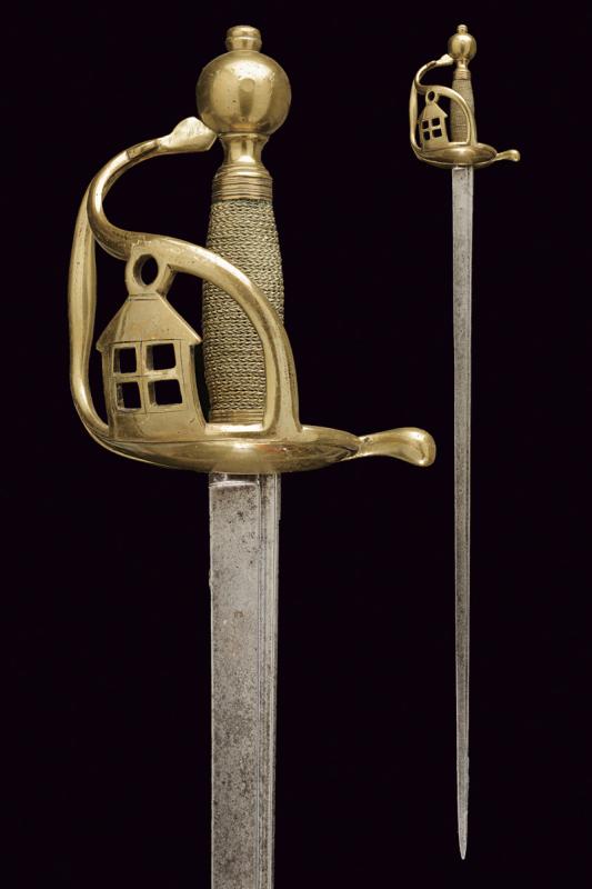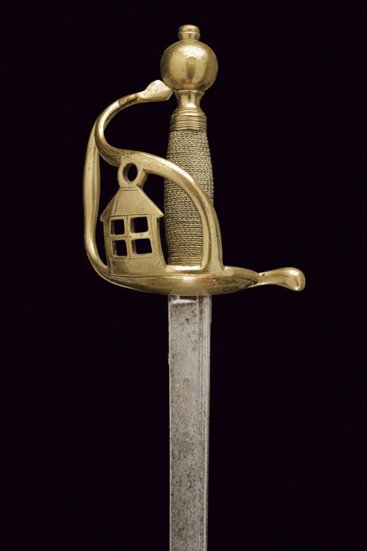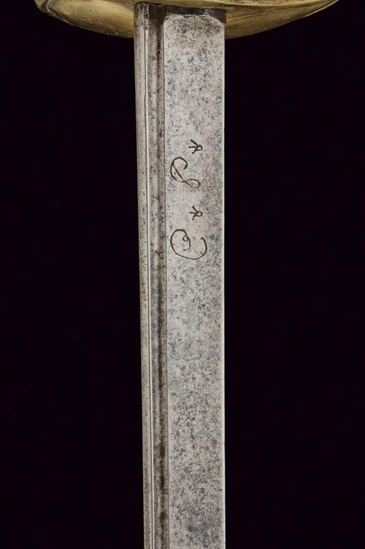 Rarissima sciabola da Garde du Paris 'A la Lanterne', datazione: 1760 circa provenienza: Francia, Lama dritta a un filo e controfilo, piatta, con una scanalatura dorsale. La base incisa con monogramma 'S D' (?), probabilmente del fabbricante. Fornimento i ottone con valva a cuore, tra i due rami di guardia una lanterna stilizzata. Pomo sferico. Impugnatura in legno rivestita di trecciola in filo d'ottone e con ghiere lavorate ad anellature. Provenienza: Collezione R. Brooker, n. inventario S - 587. lunghezza 104 cm.