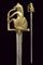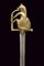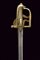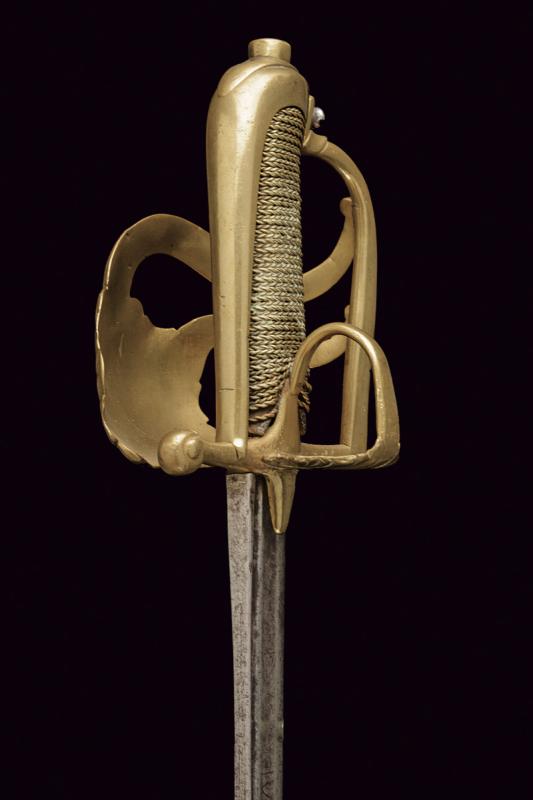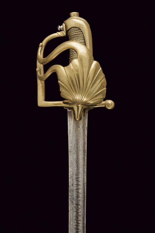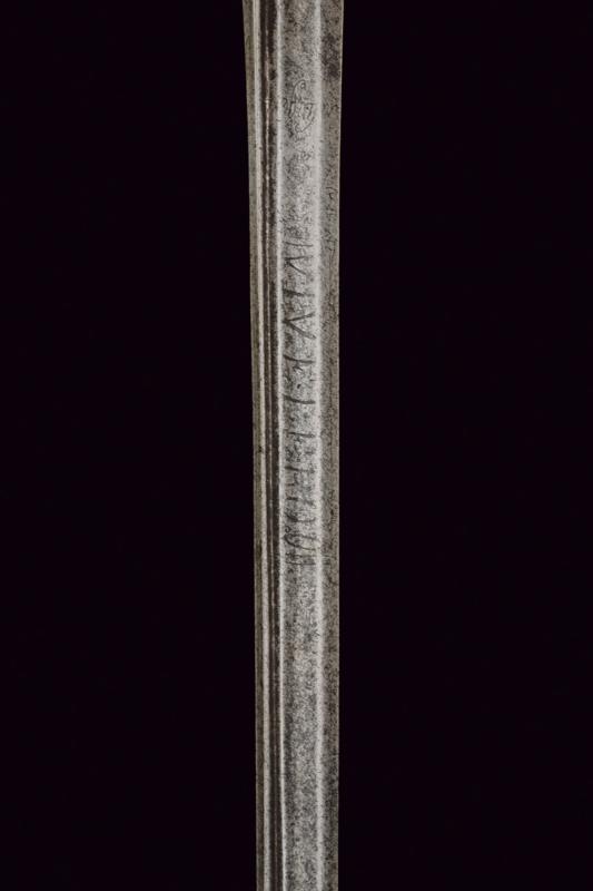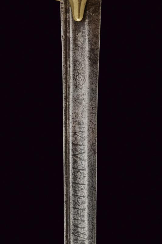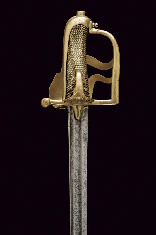 Rara spada da ufficiale, datazione: 1760 circa provenienza: Francia, Lama dritta a un filo e controfilo con sguscio centrale e scanalatura dorsale. La base con iscrizione 'VIVE LE ROY' e 'Solingen'. Bel fornimento in ottone con guardia a conchiglia, alette fermafodero, tre rami di guardia e cappetta lunga. Impugnatura rivestita di trecciola in filo d'ottone. Provenienza: Collezione R. Brooker, n. inventario S - 190. lunghezza 104.5 cm.