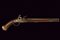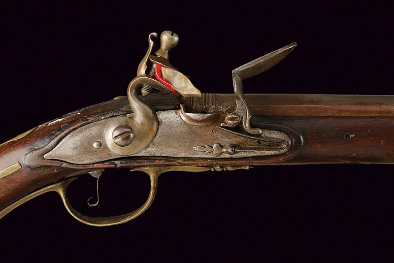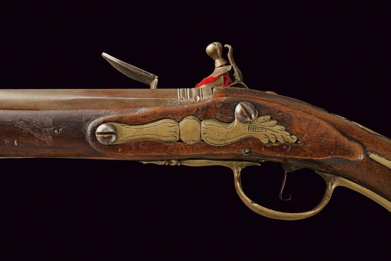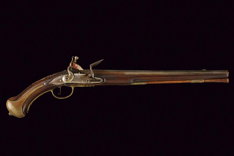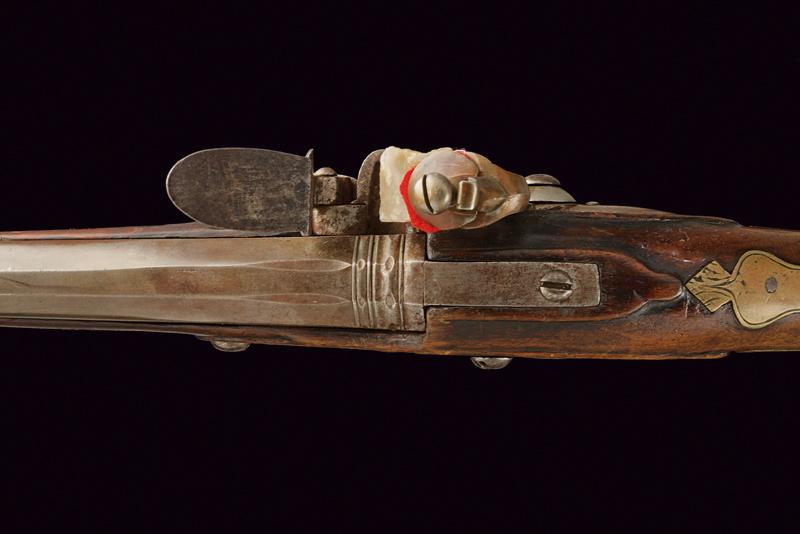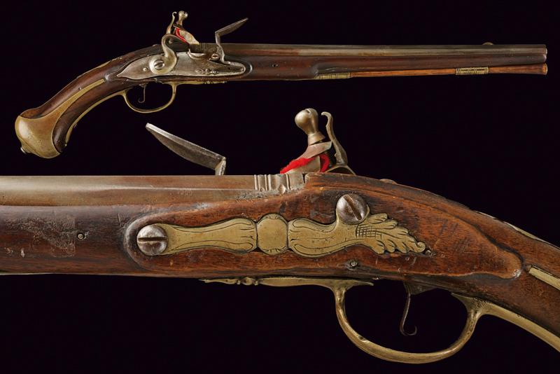Pistola militare a pietra focaia, datazione: inizio del XVIII Sec. provenienza: Francia, Canna liscia a due ordini, ottagonale e tonda, con decorazioni modanate alla base e mirino in ottone vicino alla volata, il dorso piatto per tutta la lunghezza, cal. 15 mm. Batteria a cartella leggermente tondeggiante, cane a collo di cigno. Meccanica funzionante. Cassa intera in legno (piccola crepa su un lato). Fornimenti lisci in ottone, scudetto dorsale e contropiastra leggermente incisi. Bacchetta semplice in legno chiaro con battipalla in ottone. Provenienza: Collezione R. Brooker, n. inventario 324. lunghezza 58,5 cm.
