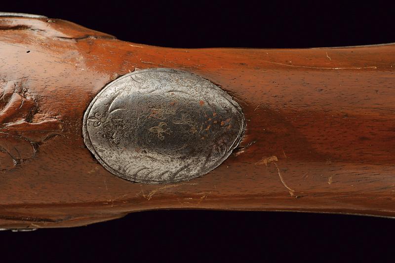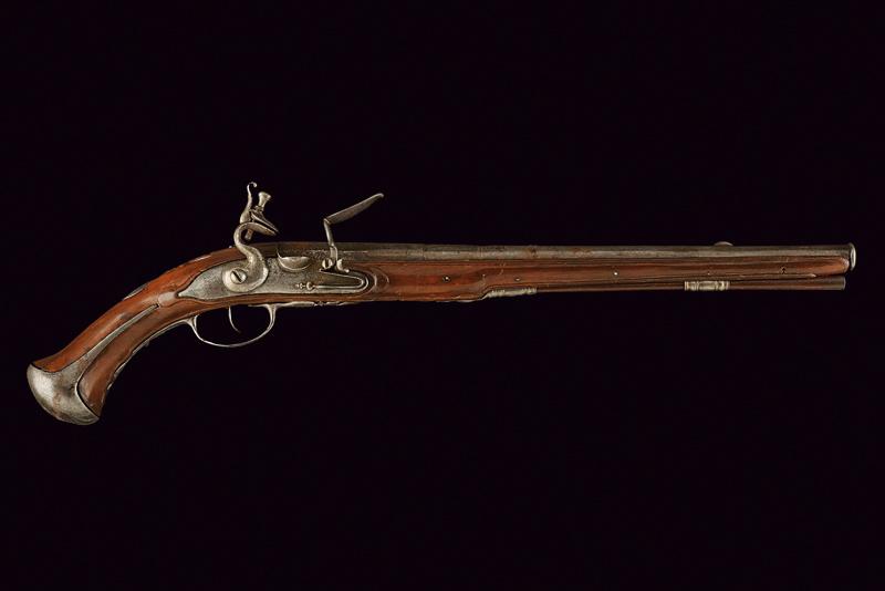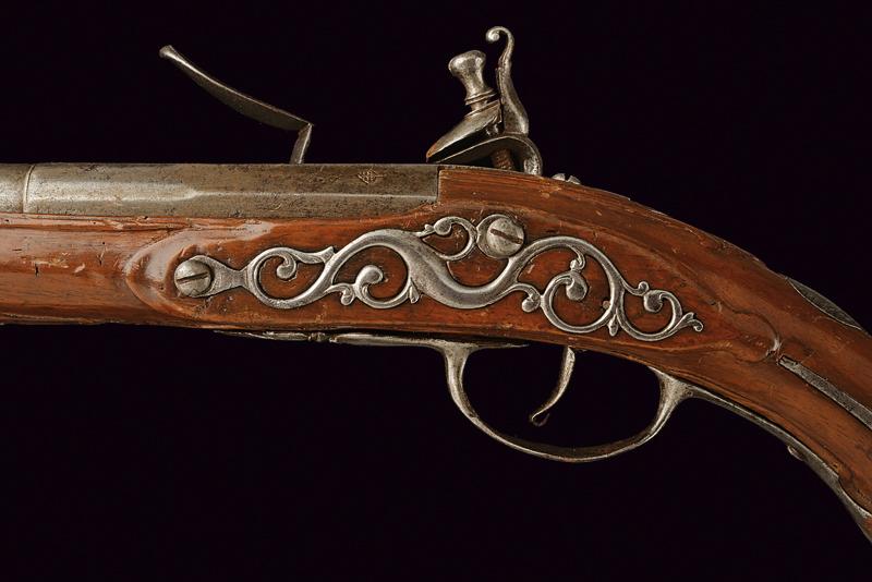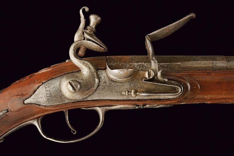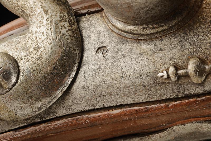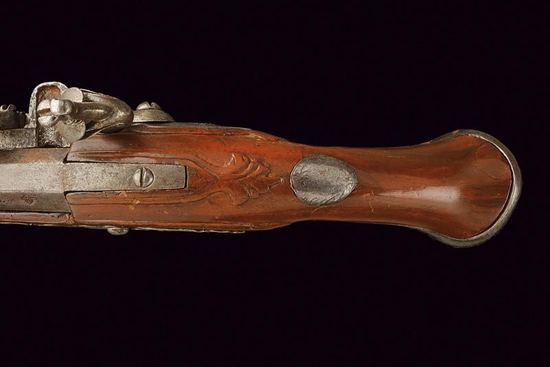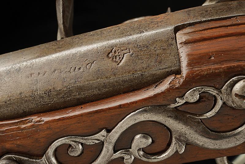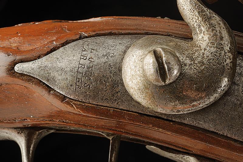 Pistola militare a pietra focaia firmata Louis Carrier, datazione: inizio del XVIII Sec. provenienza: Francia, Canna liscia a quattro ordini: ottagonale, faccettata e poi con due segmenti tondi. Anellature agli ultimi due cambi. Mirino e gioia di bocca. Punzone alla base e tracce di marcatura. Batteria a cartella leggermente tondeggiante firmata 'LOUIS CARRIER'. Resti di un punzone. Cassa intera in legno. Fornimenti in ferro. Contropiastra traforata. Bacchetta in legno con battipalla in ferro. Provenienza: Collezione R. Brooker, n. inventario 284. lunghezza 59 cm.