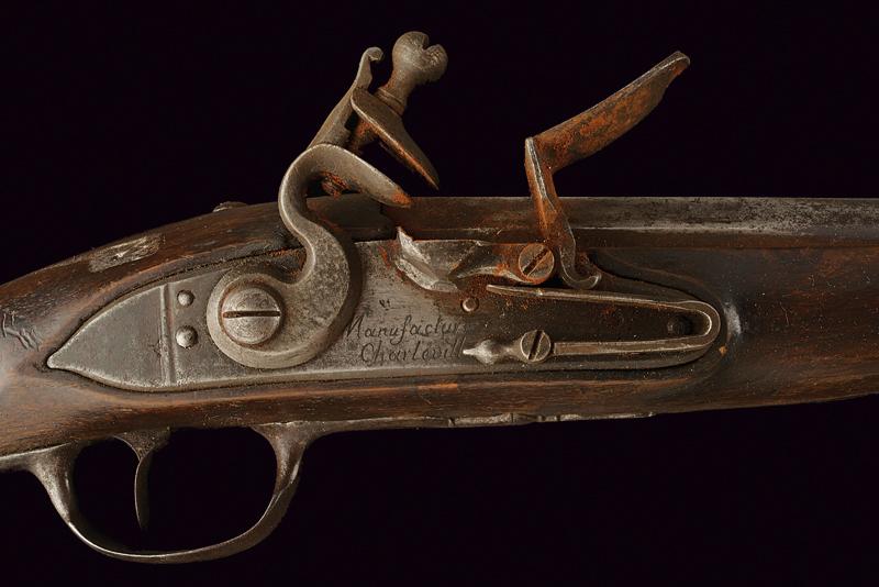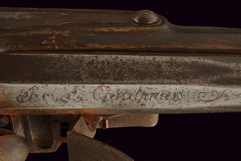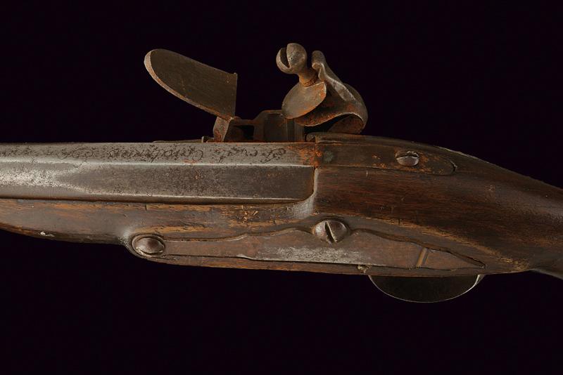 Pistola a pietra focaia Mod. 1733 da Carabinieri Reali, datazione: Terzo quarto del XVIII Secolo provenienza: Francia, Canna liscia a due ordini, con resti di marcatura 'Roy.l Carabiniers', dotata di mirino, cal. 18 mm. Batteria con marcatura 'Manufacture de Charleville'. Cassa intera in legno. Fornimenti in ferro. Bacchetta in legno con battipalla in ferro. Provenienza: Collezione R. Brooker, n. inventario 382. lunghezza 42 cm.