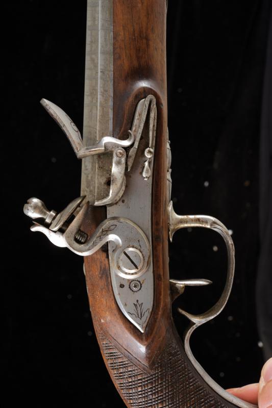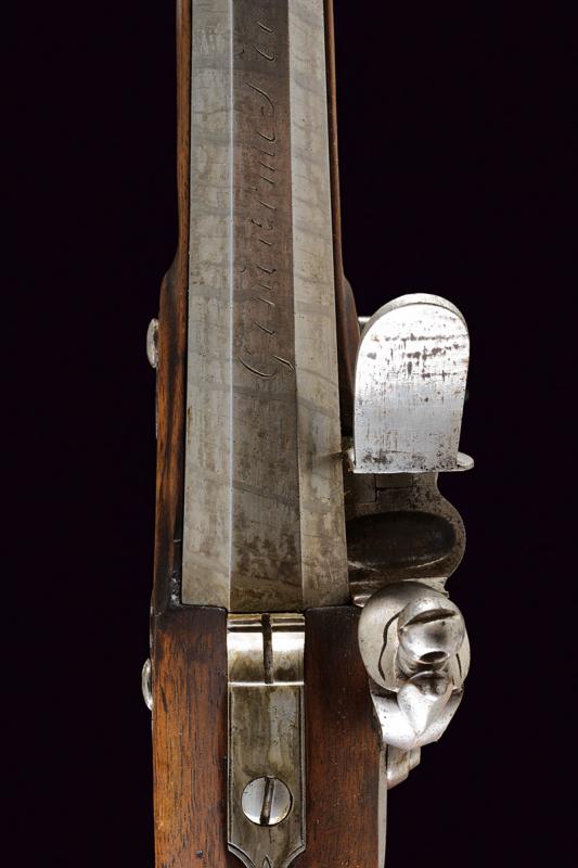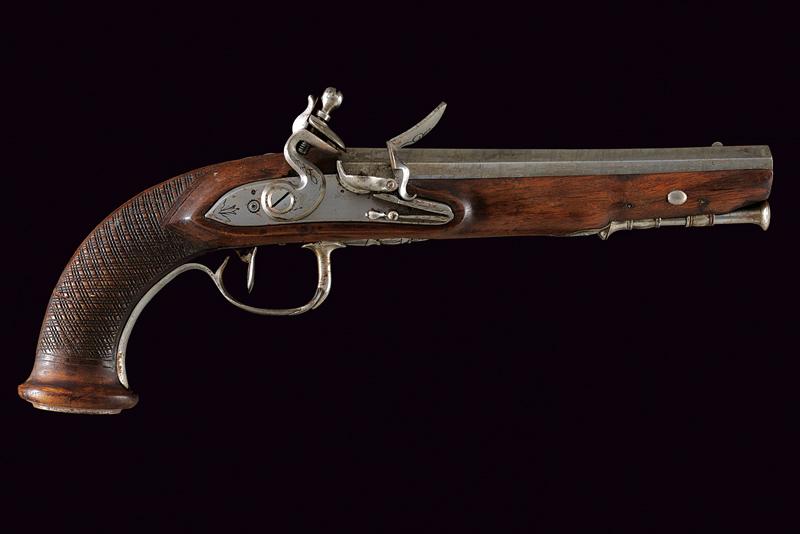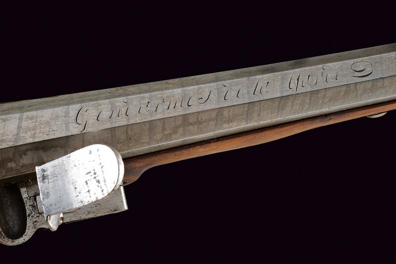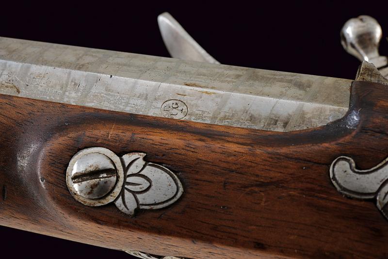 Pistola a pietra focaia Mod. 1814 per Gendarmerie de la Garde, datazione: primo quarto del XIX Sec. provenienza: Francia, Canna liscia ottagonale, con tracce di damasco, punzone del banco di Liegi, marcatura 'Gendarmerie de la Garde', mirino, cal. 18 mm. Batteria a cartella piatta con piccole incisioni. Cassa intera in legno con impugnatura zigrinata. Fornimenti e bacchetta in ferro. Provenienza: Collezione R. Brooker, n. inventario 399. lunghezza 34,5 cm.
