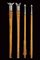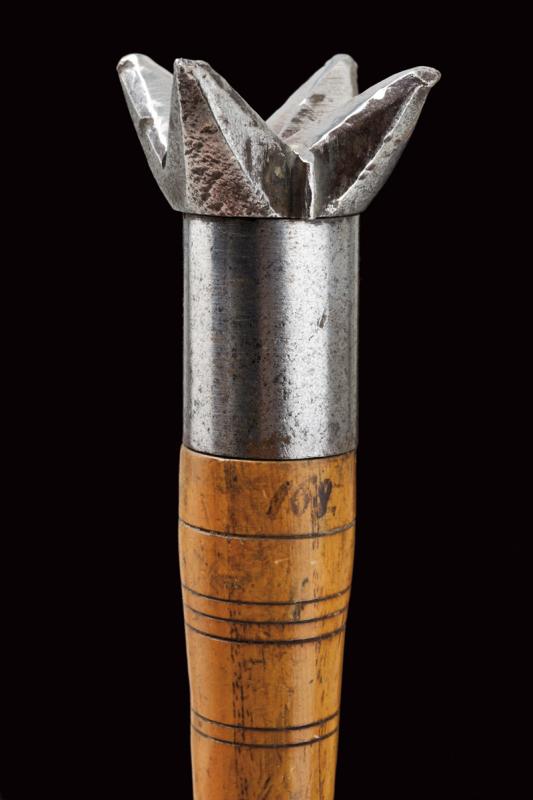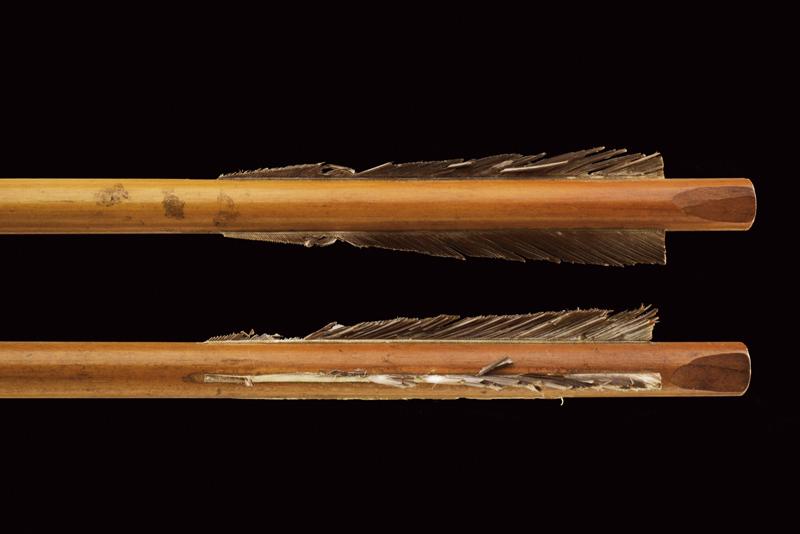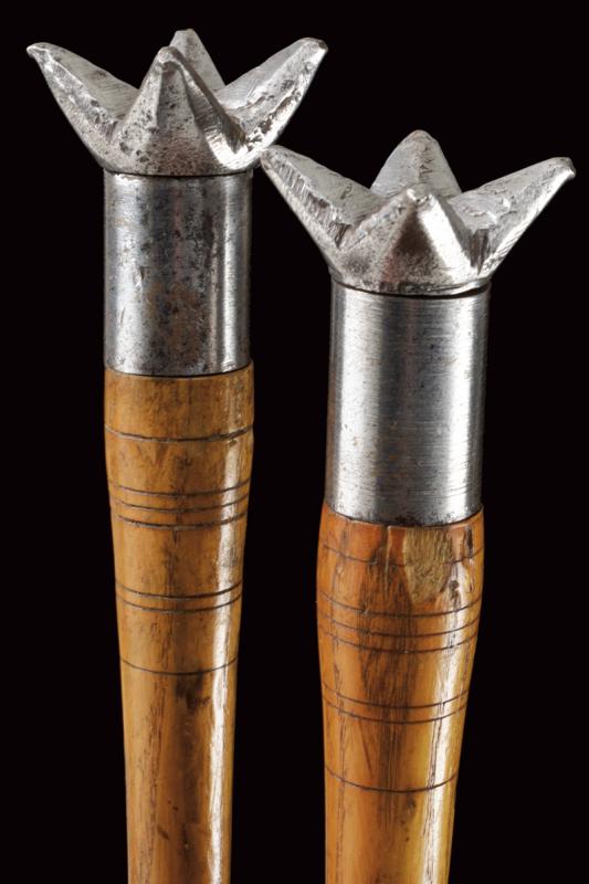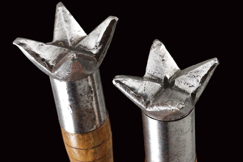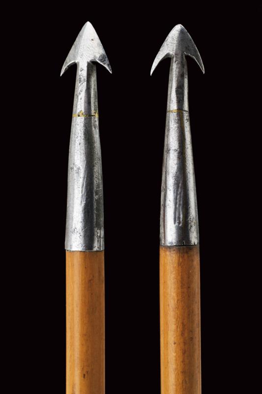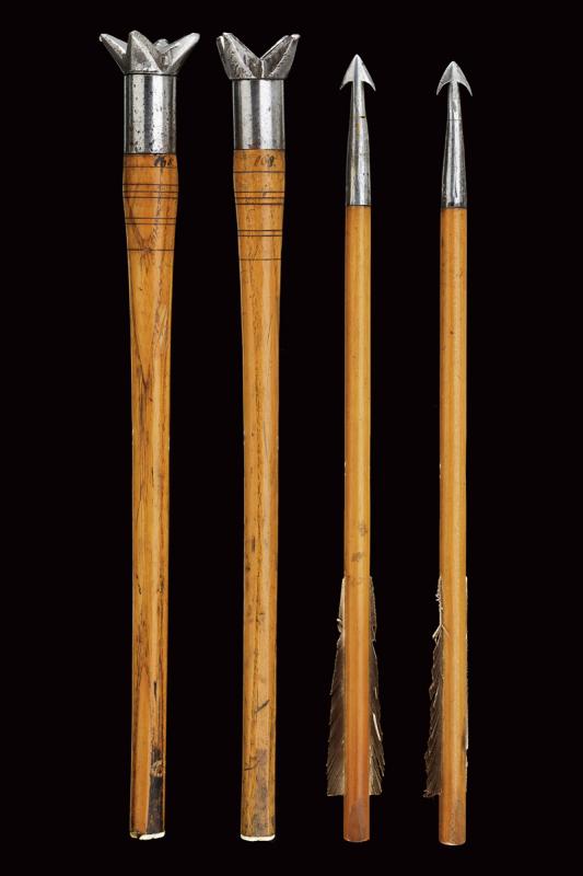 Quatto dardi da balestra, datazione: XVI - XVII Secolo provenienza: Germania, Due con punte in ferro formate da quattro cuspidi e con mirino, fusto in legno (uno con piccolissima mancanza) e base con disco in osso. Due con punta in ferro con cuspide a triangolo con alette appuntite e con gorbia troncoconica. La base con resti di piume. Rari. lunghezza 33.5 - 34 cm.