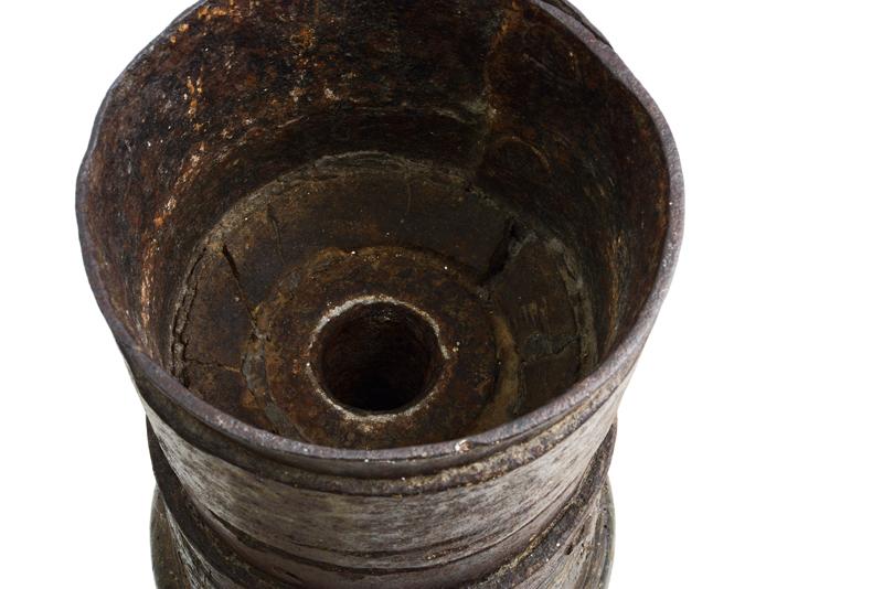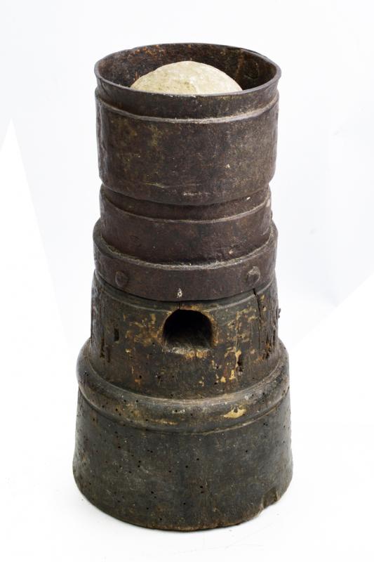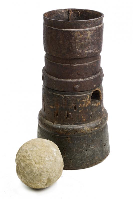 Piccola bombarda con mascolo, datazione: XIV Sec. provenienza: Europa, La canna in ferro, tenuta da bande metalliche. Il mortaio incassato all'interno della base lignea, probabilmente coeva. Rara e interessante struttura. Completa di una palla in pietra da bombarda. altezza 1 cm.
