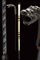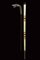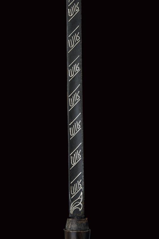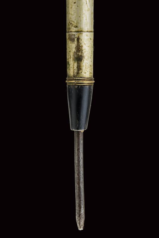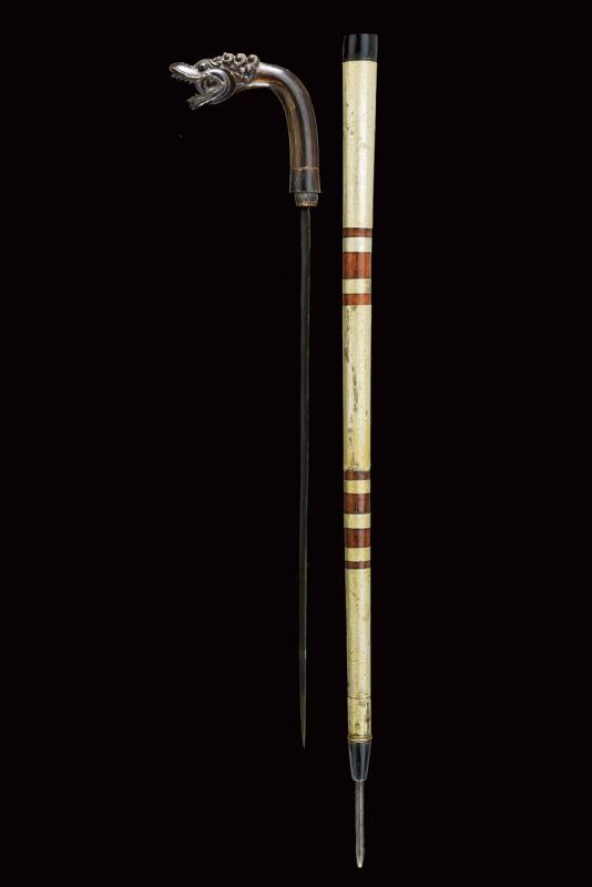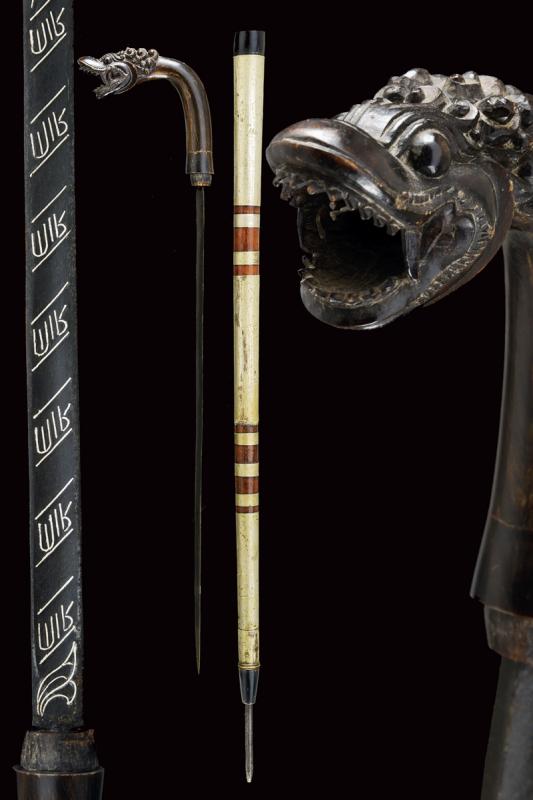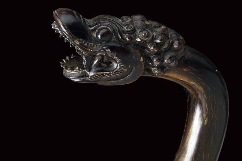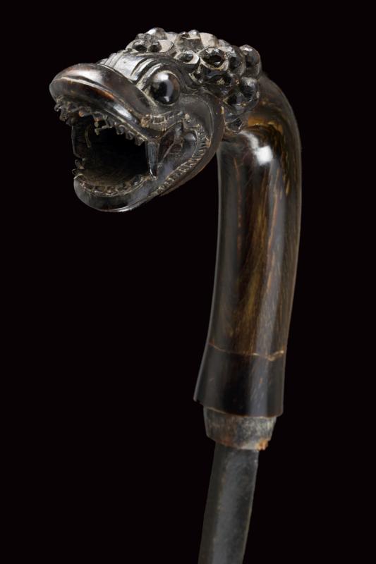 Bel bastone animato, datazione: 1900 circa provenienza: Indonesia, Lama dritta di sezione triangolare, brunita e con decorazioni in argento. Bella impugnatura in corno scolpito a testa di drago. Fodero in legno rivestito con foglia d'argento con puntale in ferro e cappa in corno. lunghezza 62 cm.