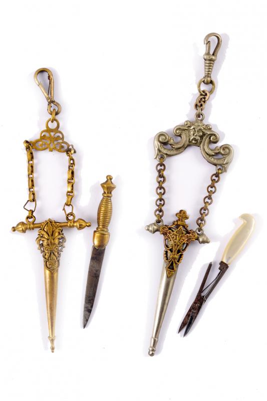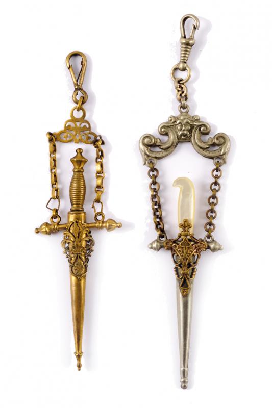Lotto di due pendenti a forma di spada, datazione: 1900 circa provenienza: Italia, Uno in metallo con impugnatura in madreperla, estraibile, all'interno una piccola forbice, l'altro pendente simile con impugnatura in ottone e con piccolo coltello. lunghezza 12.5 - 14 cm.
