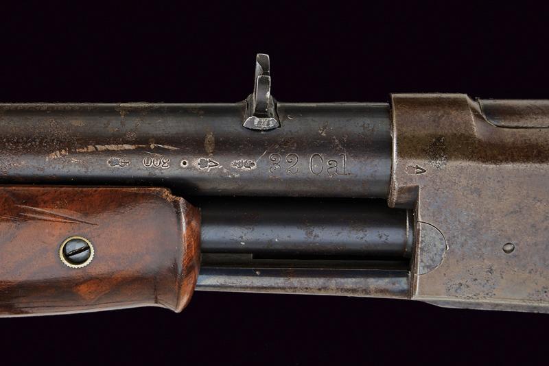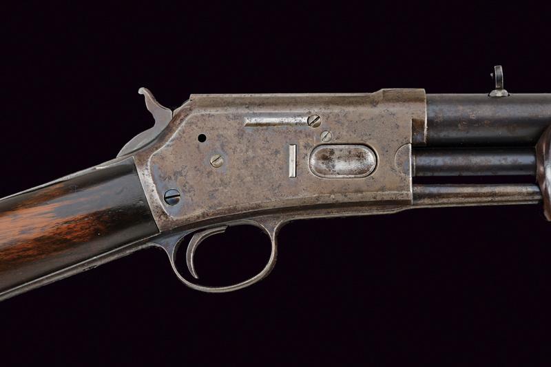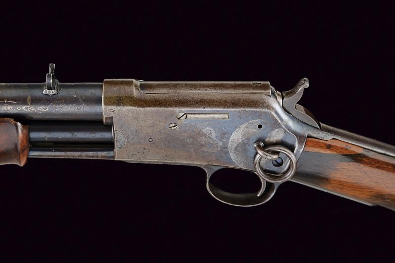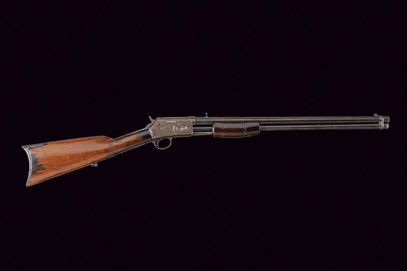 Colt Lightning Slide Action Carbine, Medium Frame, datazione: 1889 provenienza: USA, Canna tonda rigata, da 20', con mirino e munita di un alzo fisso a foglietta, recante marcatura della ditta e brevetti sino al 1883 in due righe, dicitura del calibro alla base sul lato sinistro '32 Cal.' e recante punzoni del banco di prova di Londra. Anima pulita, rigatura visibile, qualche intaccatura. Castello con cavallino rampante inciso, punzone del banco di Londra, codolo inferiore recante matricola '39xxx'. Resti di brunitura rinfrescata, qualche intaccatura. Astina e calcio lisci, la pala con due tasselli restaurati. Anello da sella sul fianco sinistro. Meccanica funzionante. lunghezza 95,3 cm.