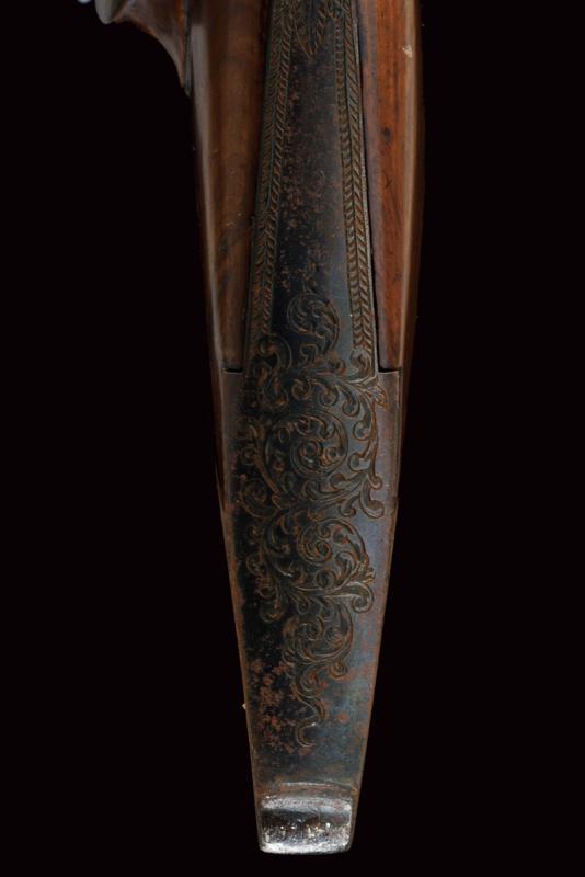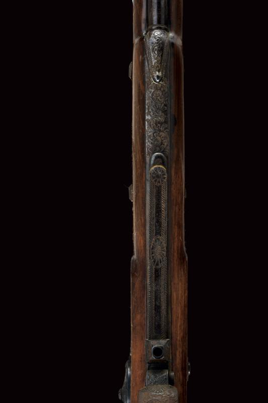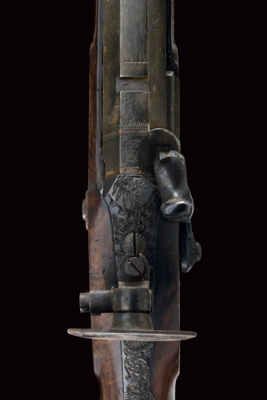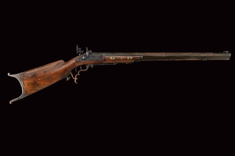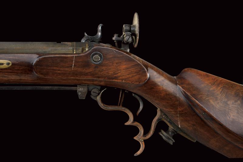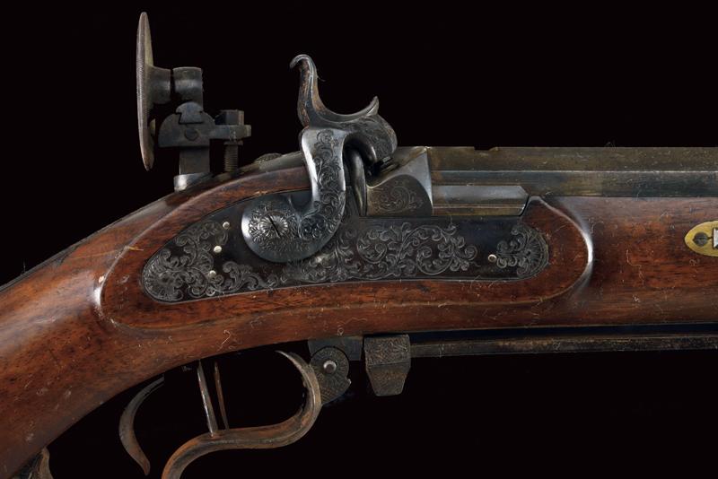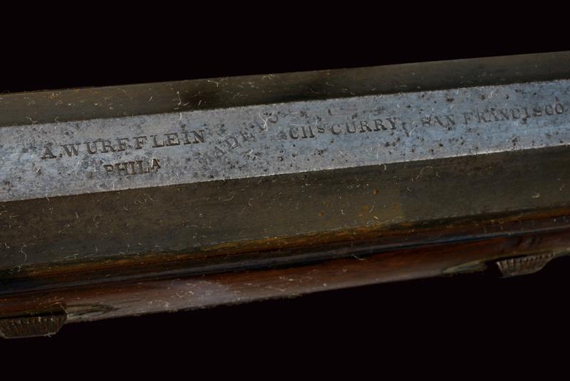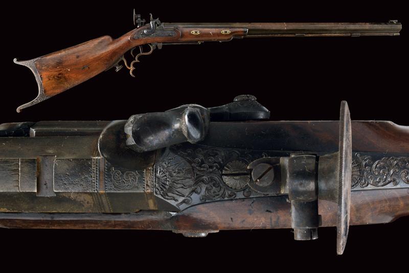 Fucile da tiro a luminello, datazione: Metà del XIX Secolo provenienza: USA, Pesante canna ottagonale, rigata, decorata alla base con cornici ed incisioni, firmata 'A. WURFFLEIN PHIL.A MADE FOR CH.S CURRY SAN FRANCISCO', due innesti per un alzo, mirino di precisione, cal. 12 mm; larga codetta brunita e finemente incisa, munita di diottra; batteria a molla in avanti decorato a motivi floreali; mezza cassa in legno con fornimenti in ferro decorato en suite. Prima del ponticello anatomico, dotato di vite per smontaggio rapido, un fornimento a cursore regolabile per un pomo di supporto; il muso in corno. Le parti in ferro con ruggine superficiale facile da pulire. Bacchetta in legno con battipalla in metallo. Raro fucile del tipo svizzero realizzato negli Stati Uniti. Per Wurfflein vedi 'Der Neue Stöckel' Vol. II, pag. 1413. per Curry Vol. I, pag. 258. lunghezza 127 cm.