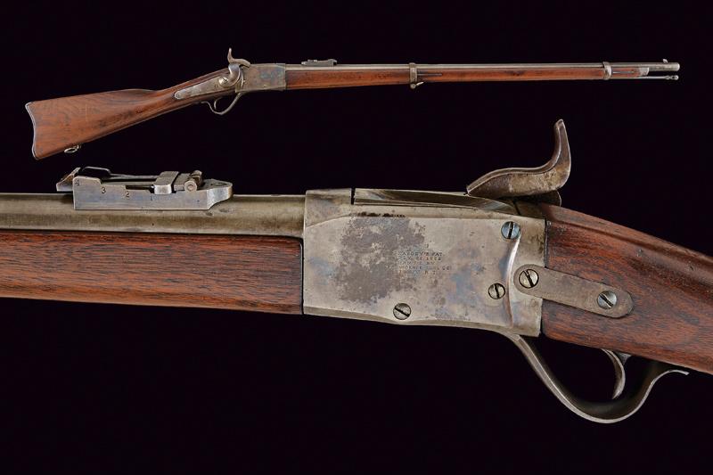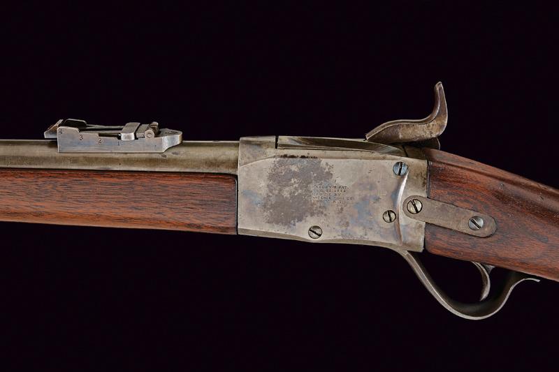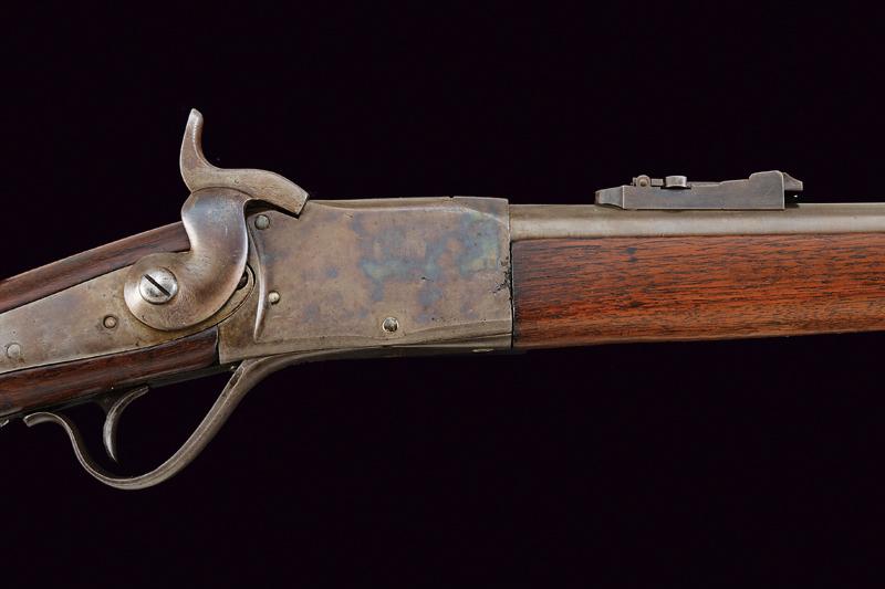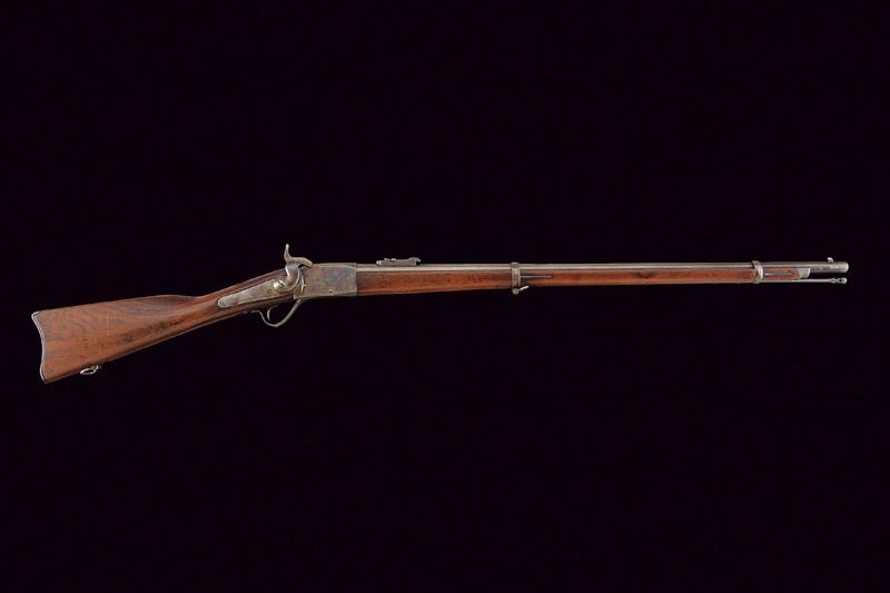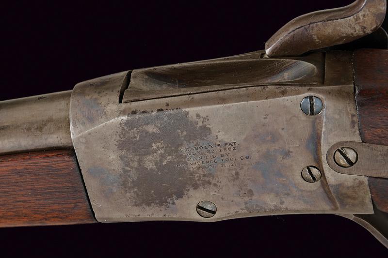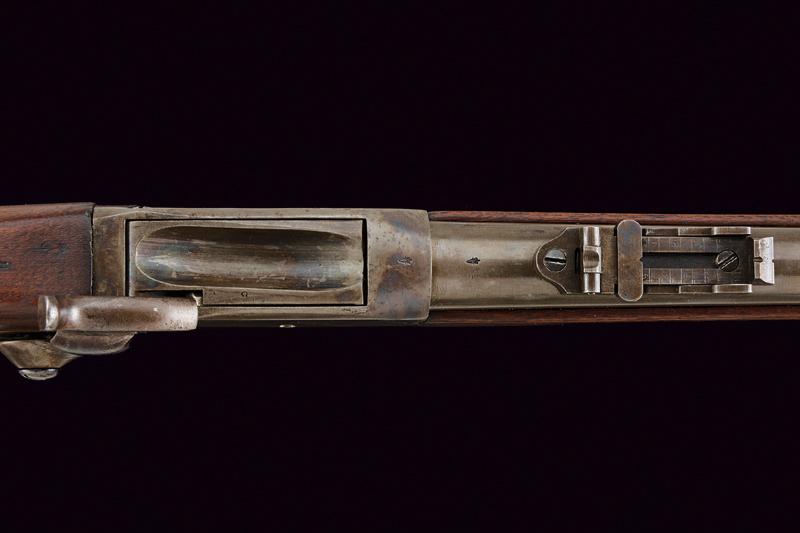 Fucile Peabody mod. 1867/77, datazione: 1880 circa provenienza: USA & Inghilterra, Canna rigata (anima pulita con rigatura appena visibile), tonda, con base marcata con il punzone del banco di prova di Londra, alzo variabile e mirino, cal. 10.4, resti di brunitura, il castello ha la marcatura di Peabody In Providence con brevetto ed il punzone londinese. Batteria a molla indietro. Cane a percussione anulare. Cassa in due parti in legno con fornimenti in ferro. Bacchetta in ferro. lunghezza 131.5 cm.