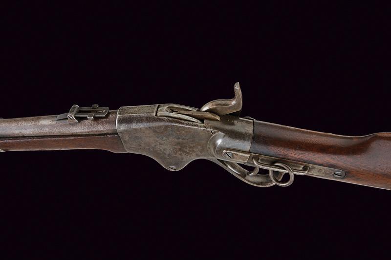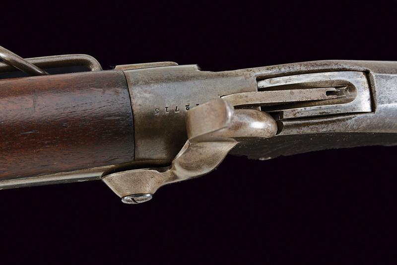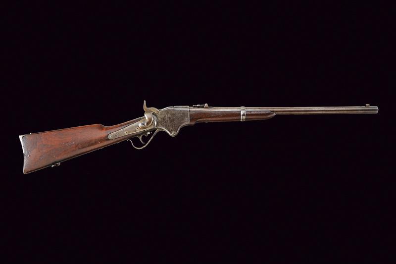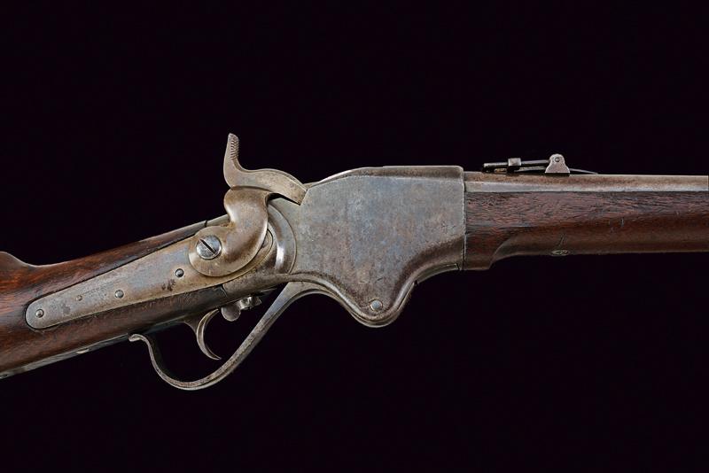 Spencer Repeating Carbine, datazione: Terzo quarto del XIX Secolo provenienza: USA, Canna tonda rigata (anima pulita, rigatura visibile, tre righe) dotata di mirino e con alzo abbattibile e regolabile, cal. 50 in volata. Castello in ferro con tracce di tartarugatura, al dorso resti di marcatura non più leggibili. Meccanica funzionante. Calcio ed astina lisci in legno, la pala con tracce di timbri 'Y' e 'C'. Matr. '42xxx'. Fornimenti in ferro. lunghezza 99,3 cm.
