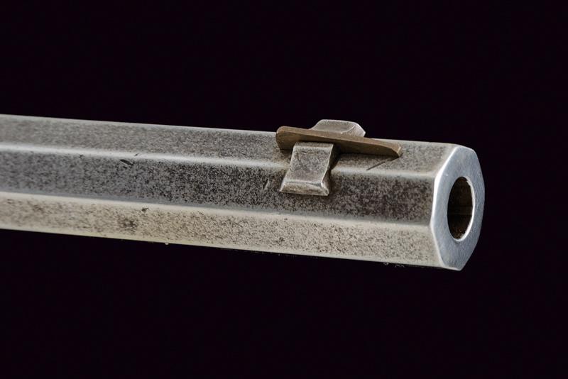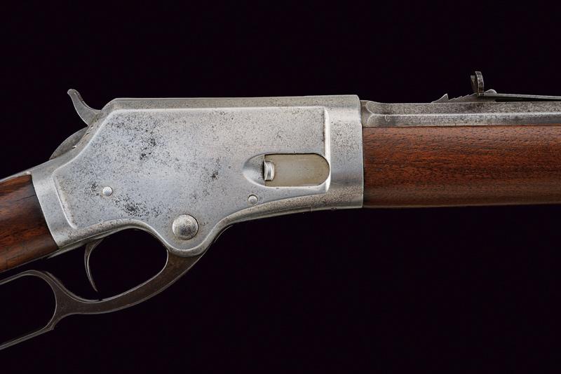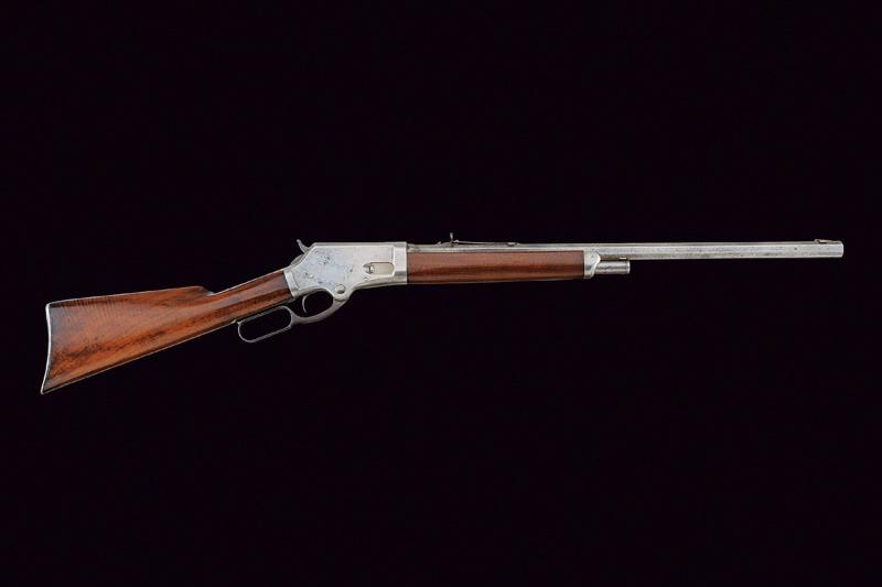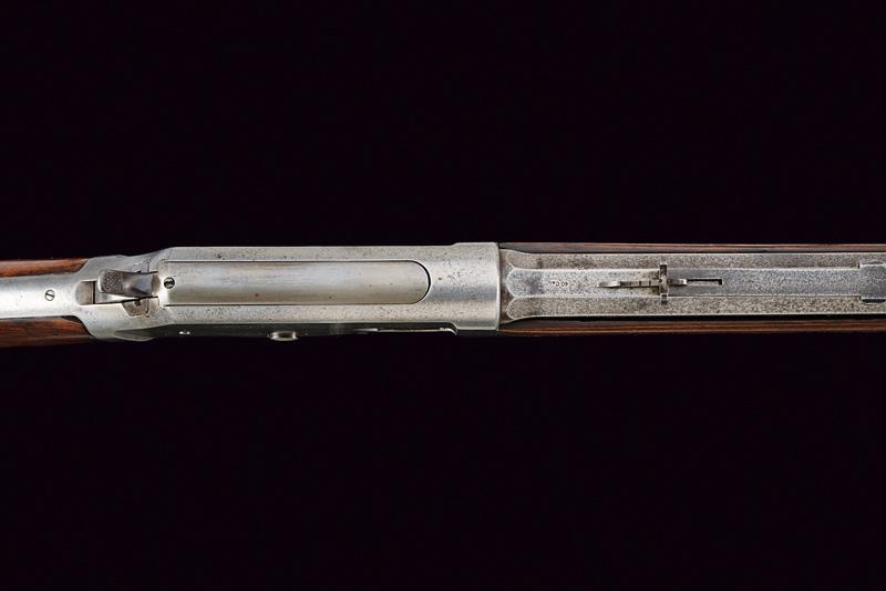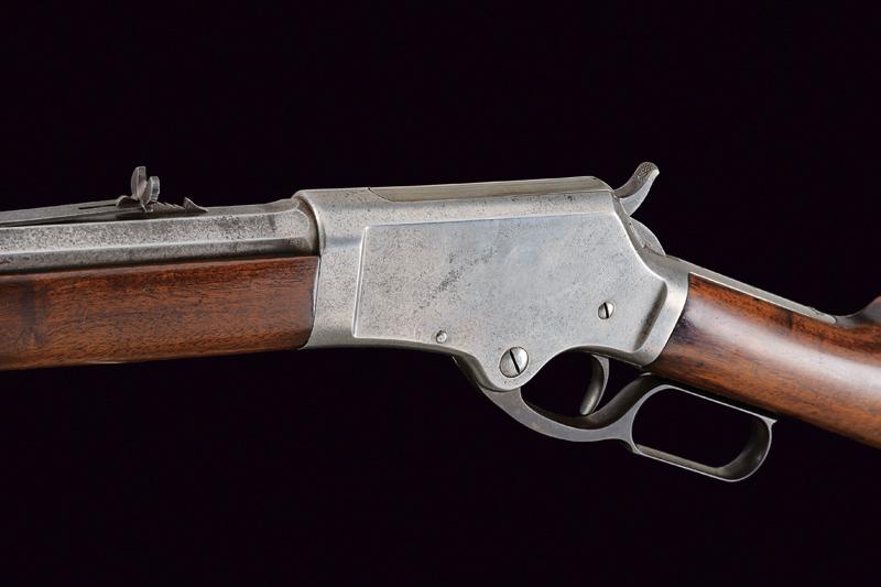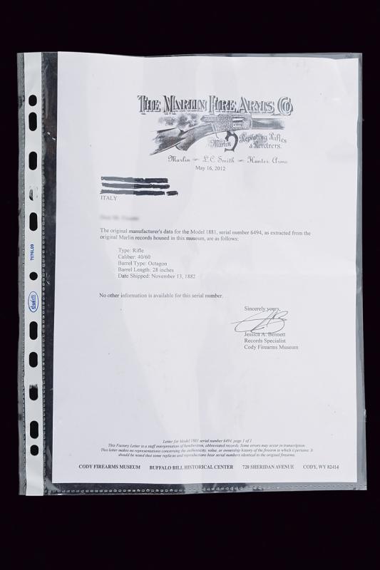 Marlin Model 1881 Lever Action Rifle, datazione: 1882 provenienza: USA, Canna rigata (anima con piccoli macchie con rigatura visibile), ottagonale, con indirizzo e brevetti fino al 1880, alzo variabile e mirino, alla base marcata '40 CAL'. Sotto la canna serbatoio tubolare. Castello liscio, sotto con matricola '64xx', meccanica funzionante. Cassa ed astina in legno con fornimenti in ferro. Pitting. La leva brunita. Con fotocopia di una lettera intestata 'The Marlin Fire Arms Co.' che conferma calibro 40/60, canna ottagonale, lunghezza 28 inches, spedita il 13 Novembre 1882. lunghezza 102.5 cm.