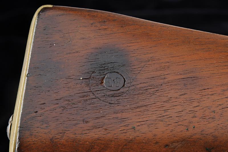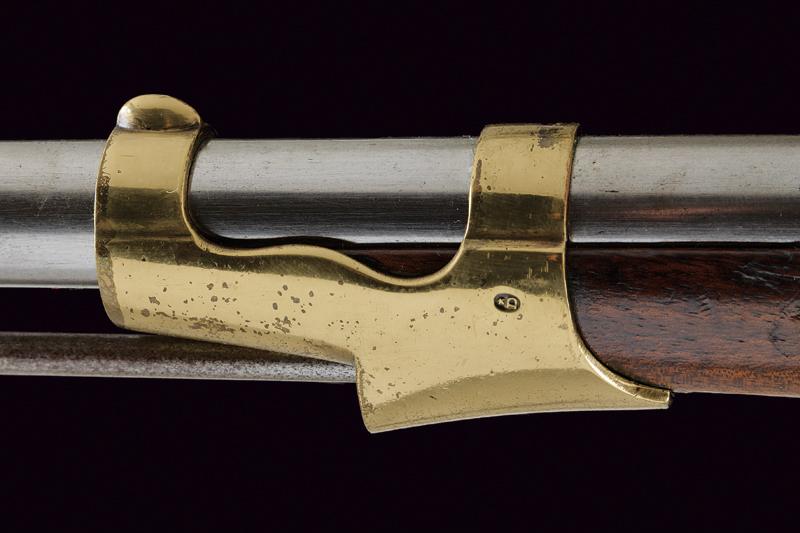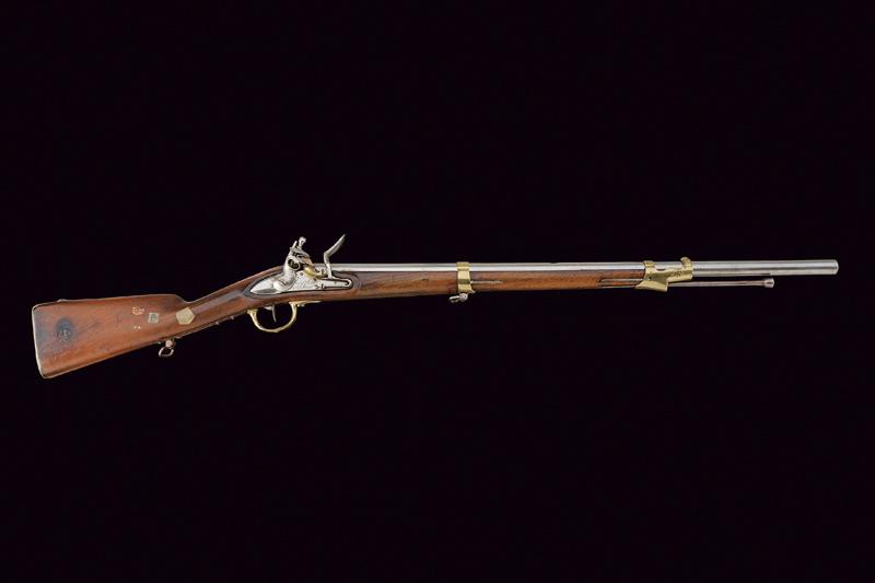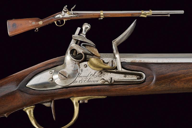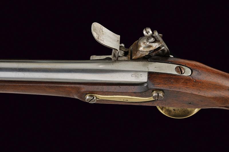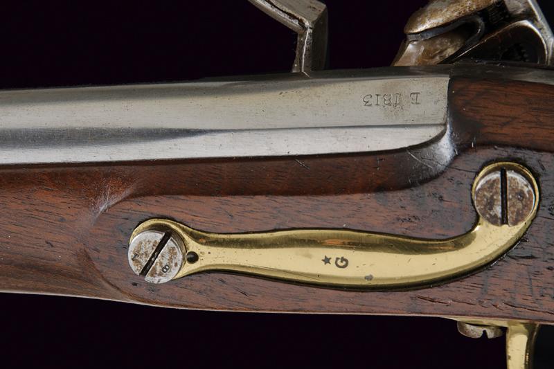 Fucile a pietra focaia, datazione: 1813 provenienza: St. Etienne, Canna tonda, liscia con base quadra marcata 'L 1813', cal. 18 mm; batteria marcata 'Manuf. Imp. de St. Etienne' e con punzone 'S' entro un rombo. Scodellino in ottone. Cassa in legno con fornimenti in ottone e bacchetta in ferro. lunghezza 113.5 cm.