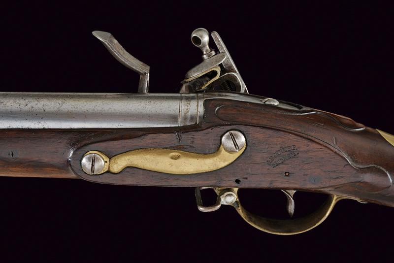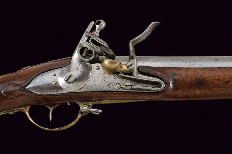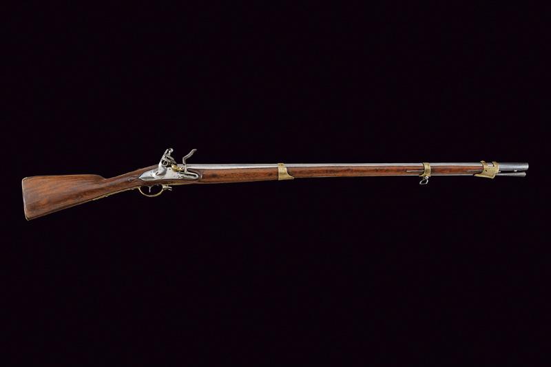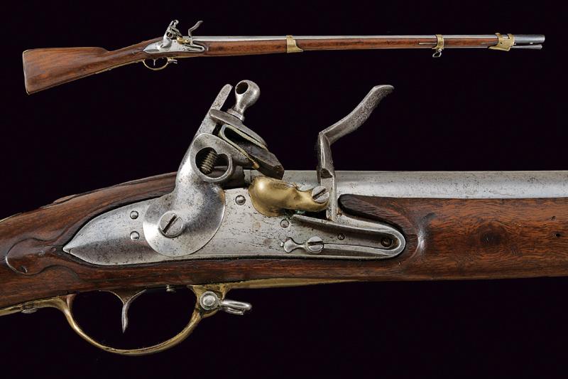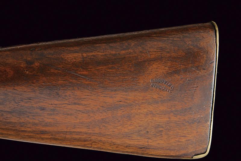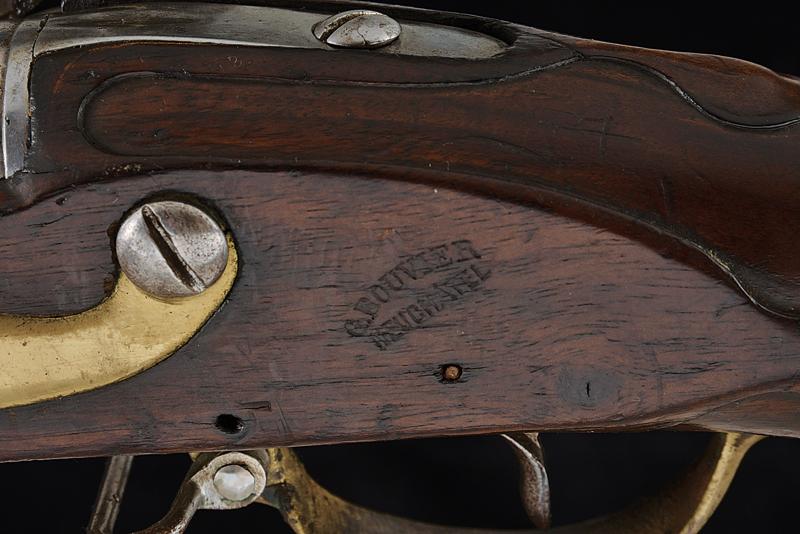 Fucile a pietra focaia Mod. 1777, datazione: Inizio del XIX Secolo provenienza: Svizzera, Canna tonda liscia, con dente d'innesto per baionetta, anellatura alla culatta, cal. 19 mm. Codolo con traguardo appena accennato. Batteria a cartella piatta con codetta tondeggiante, scodellino in ottone. Meccanica funzionante. Cassa lunga in legno, accanto alla contropiastra la marcatura 'G. BOUVIER NEUCHATEL'. Fornimenti in ottone, scudetto ellittico sul collo, il bocchino dotato di mirino e di gancetto in ferro. Bacchetta in ferro. lunghezza 143,5 cm.