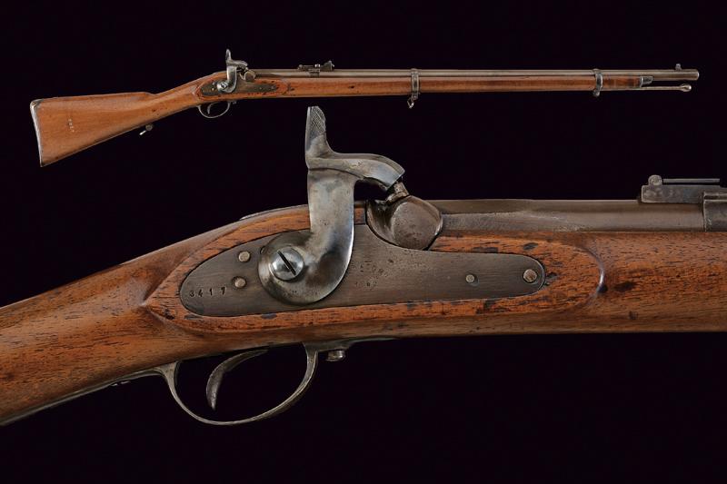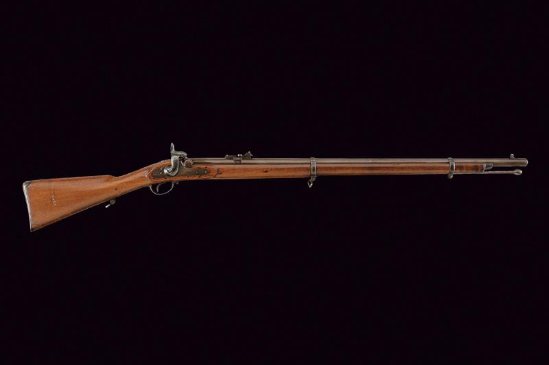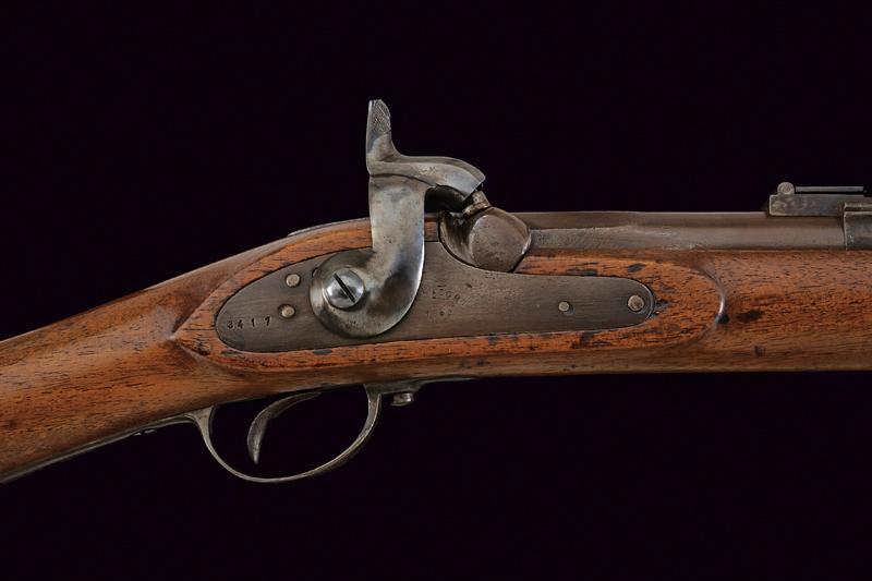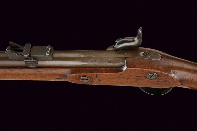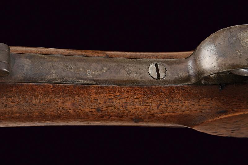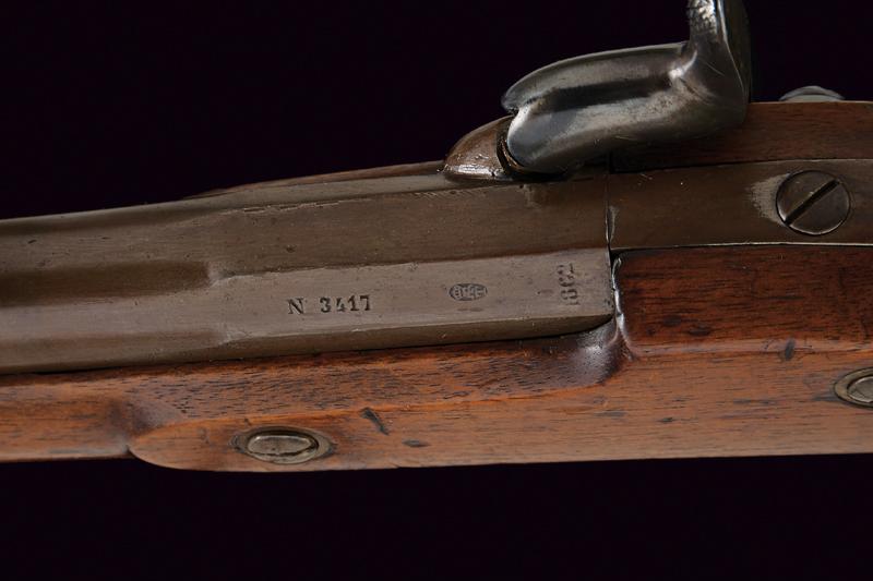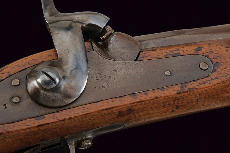 Fucile a luminello marcato Aldasoro, datazione: 1862 provenienza: America Meridionale, Canna tonda, rigata (anima pulita) con base quadra marcata con matricola '34xx', data '1862' e con un punzone 'ART' sotto corona, alzo variabile e mirino, cal. 15 mm; batteria a molla in avanti marcata 'ALDASORO', e con stessa data e matricola. Cassa intera con fornimenti e bacchetta in ferro. Mono-matricola. lunghezza 123 cm.
