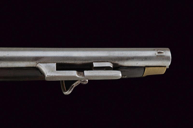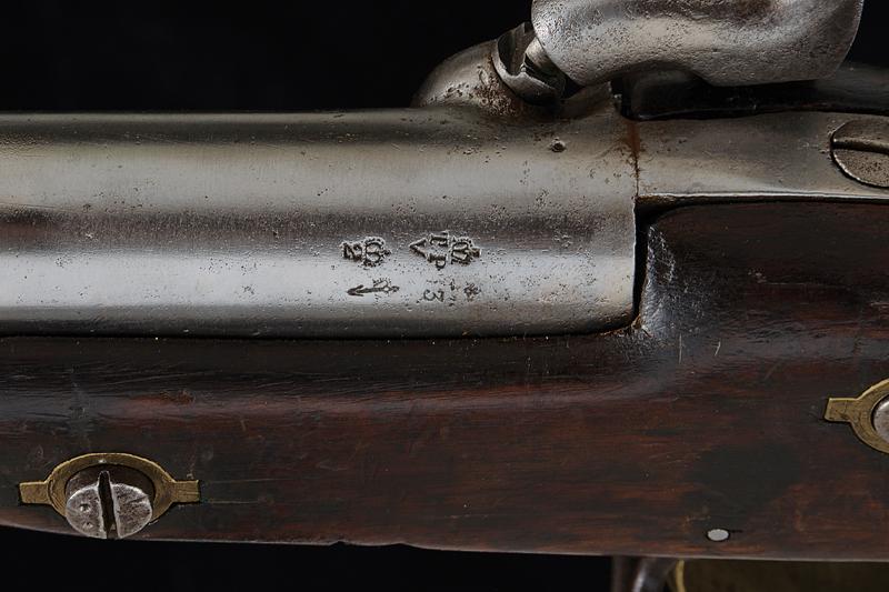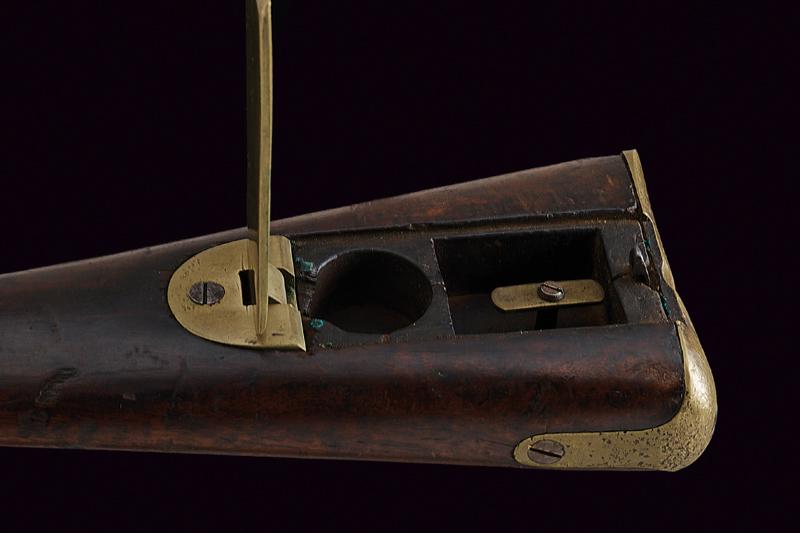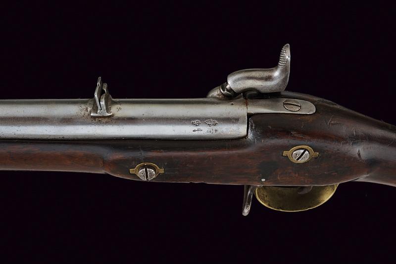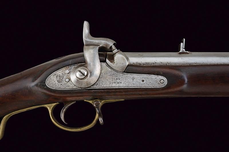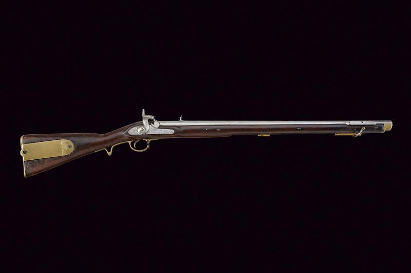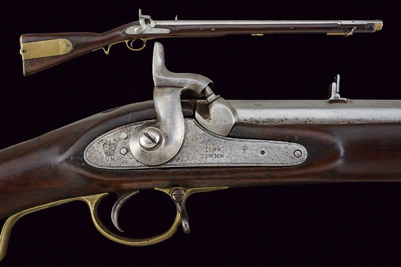Fucile a luminello Brunswick 'secondo modello', datazione: Terzo quarto del XIX Secolo provenienza: Regno Unito, Canna tonda con resti di rigatura per palla cinturata (pitting e vari segni d'uso all'interno), dotata di mirino, con alzo a due fogliette di cui una abbattibile, recante alla base resti di punzoni britannici, fra i quali la Broad Arrow, cal. 20,5 mm. Batteria a molla in avanti delineata, con resti di monogramma 'VR' sormontato da corona e con resti di dicitura '1859 TOWER'. Meccanica funzionante, due scatti. Cassa intera in legno con qualche crepa. Fornimenti in ottone. Grande patchbox con coperchio in ottone. Bacchetta mancante. Guida d'innesto per baionetta. lunghezza 116 cm.