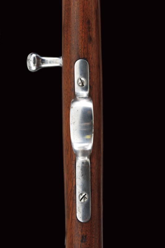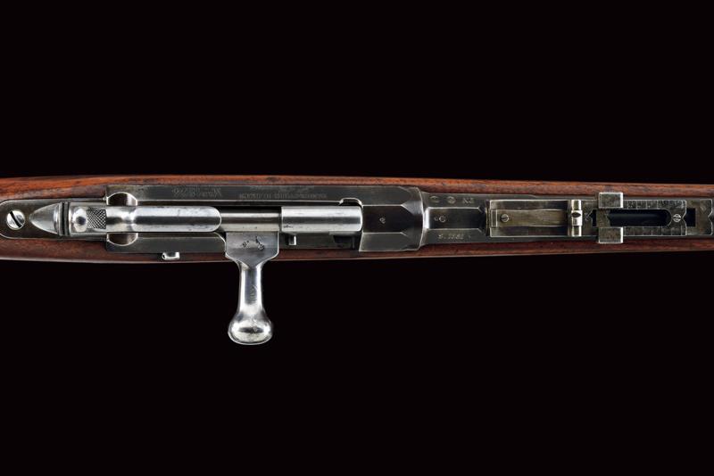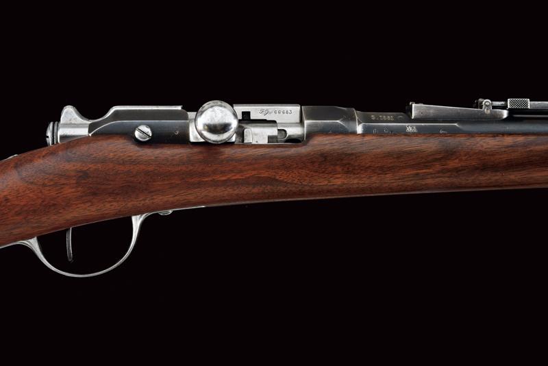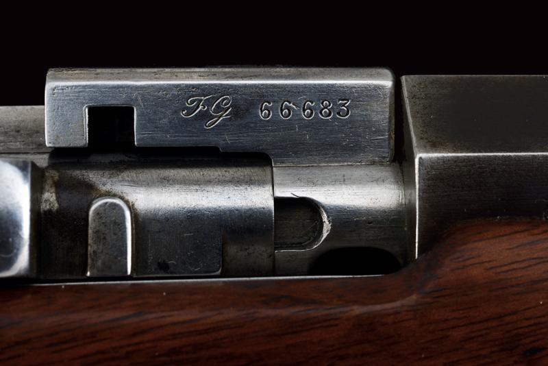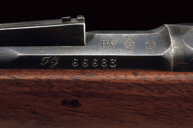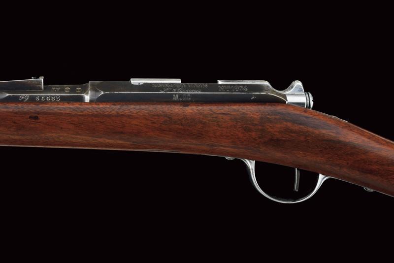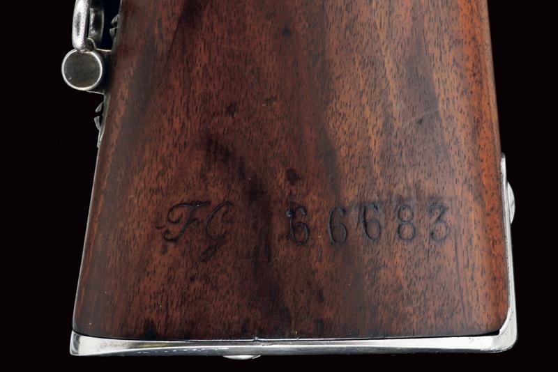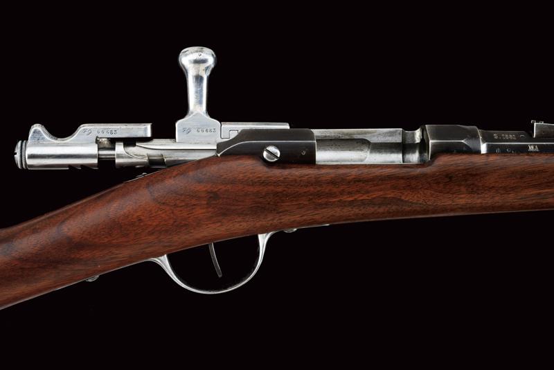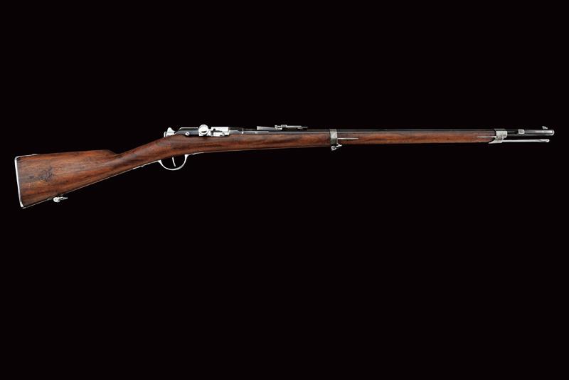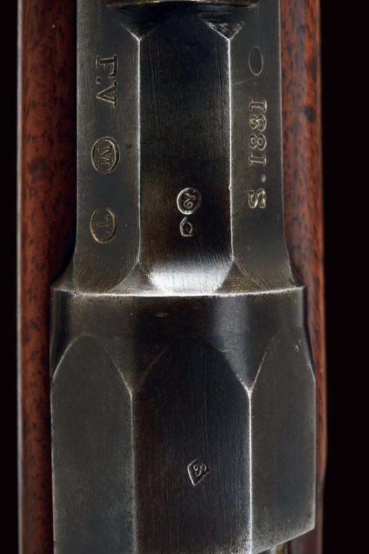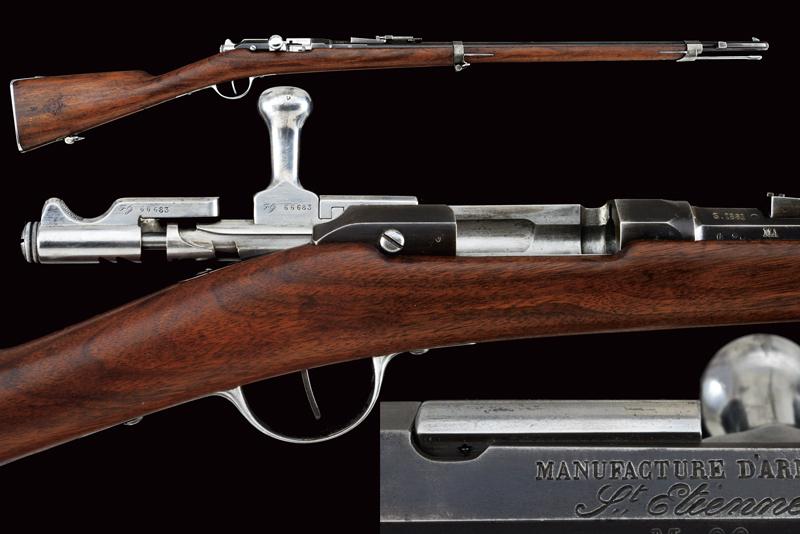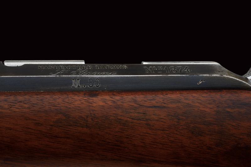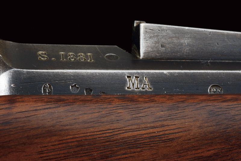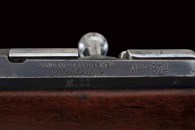 Fucile Gras Mod. 1874/80 a retrocarica, datazione: 1881 provenienza: St. Etienne, Canna rigata dotata di mirino, alzo abbattibile e guida d'innesto per baionetta, marcata alla base 'MT, 'T', 'MA', data ' S. 1881', matricola '666xx' 'FG' in corsivo e con vari altri punzoni, cal. 12 mm. Otturatore girevole-scorrevole funzionante con stessa matricola e punzoni, con marcatura di St. Etienne, 'M.LE 1874' e 'M80' su un lato. Cassa intera in legno marcata con matricola coeva e 'FG' in corsivo (come anche sull'innesto della baionetta), oltre a un timbro 'JANVIER 1882 MA'. Fornimenti e bacchetta in ferro parzialmente muniti di punzoni. In queste ottime condizioni molto raro. lunghezza 130 cm.