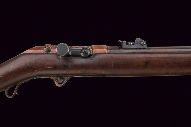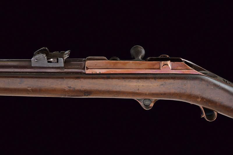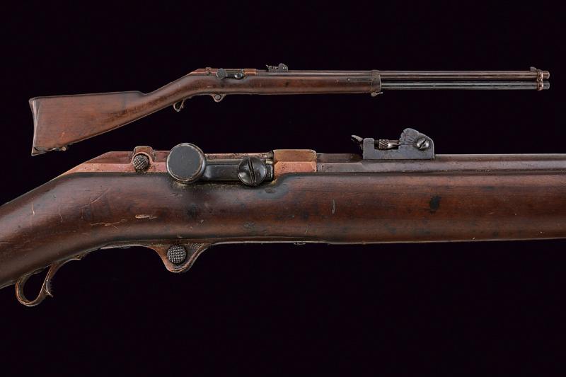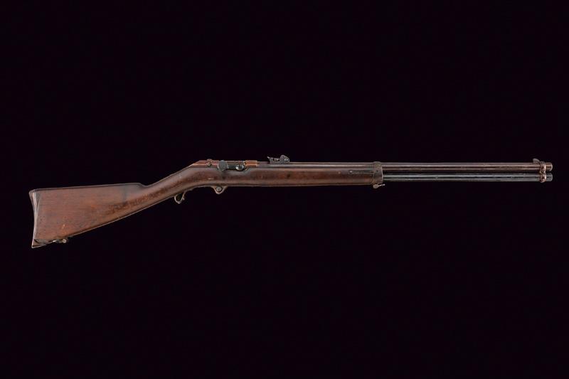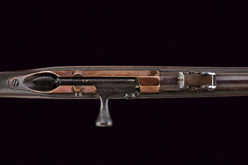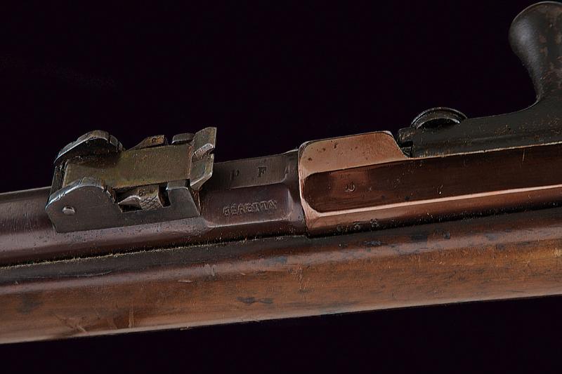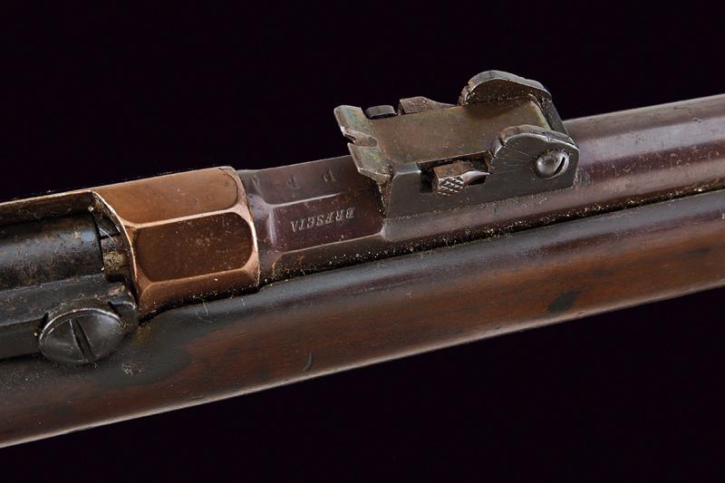 Rarissimo Fucile sperimentale con sistema Pieri della Beretta, datazione: 1880 circa provenienza: Brescia, Canna tonda con base ottagonale marcata 'BERETTA', 'PF' e 'BRESCIA', dotata di alzo regolabile e mirino, matricola laterale '.38' (la prima cifra poco leggibile), cal. 10,4 x 47 R Vetterli italiano, sotto la canna lungo serbatoio tubolare; otturatore a percussione centrale con grilletto posteriore; cassa in legno (piccole mancanze), fornimenti in ferro. Meccanica funzionante. Il fucile sistema Pieri, prodotto dalla Beretta di Brescia (anche da Glisenti) in quantità limitatissima fu presentato al concorso del Regio Esercito per la sostituzione del Carcano mod. 1867. Venne distribuito in pochissimi esemplari per la valutazione assieme ad altri modelli italiani e stranieri nel 1870. Dal concorso risultò vincente il Vetterli nella versione monocolpo. lunghezza 105 cm.