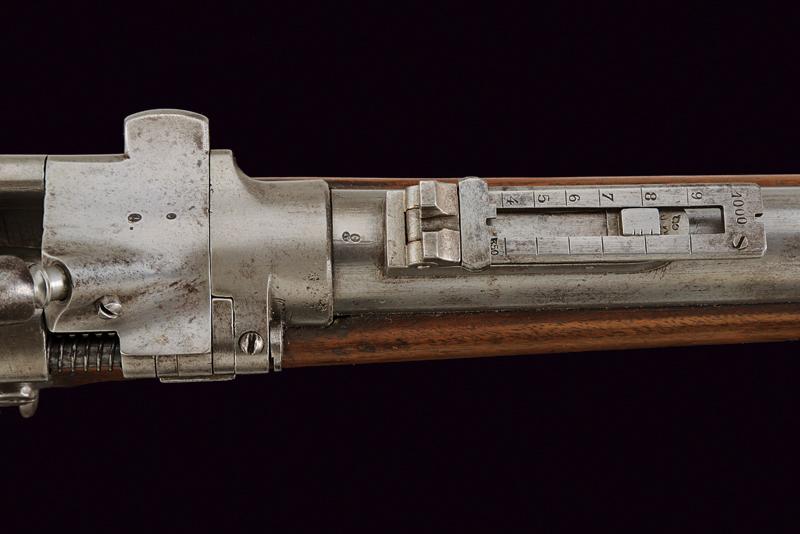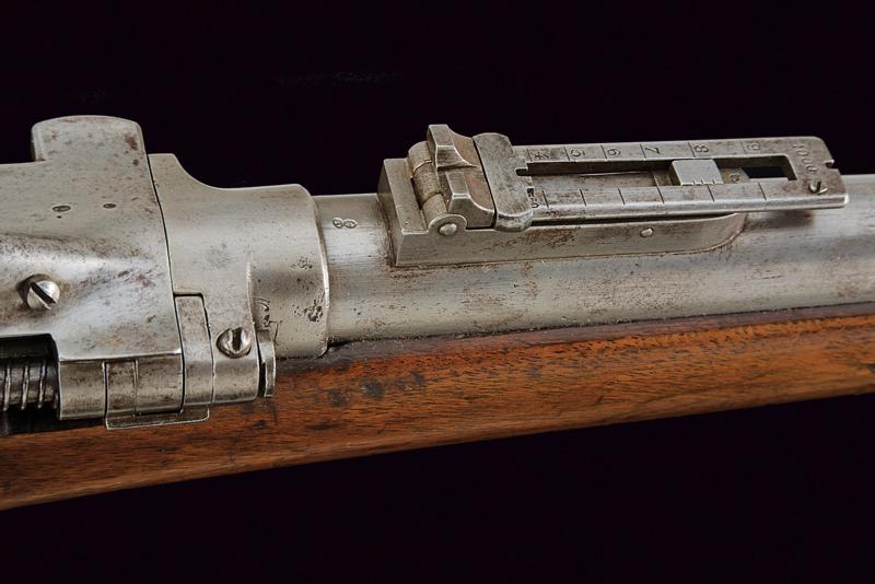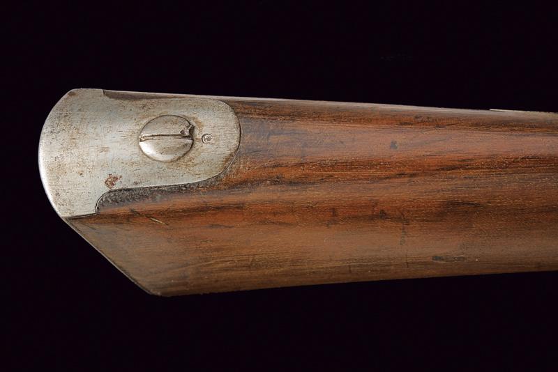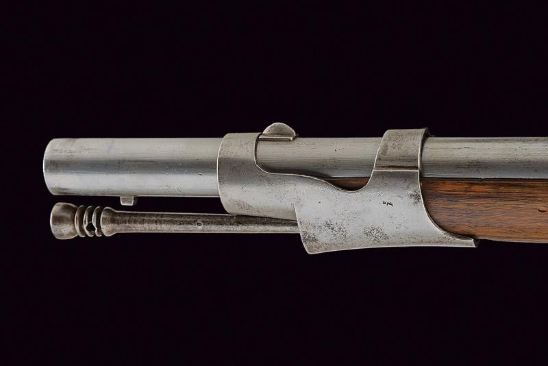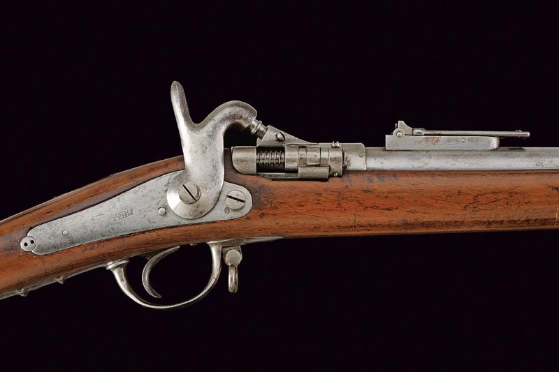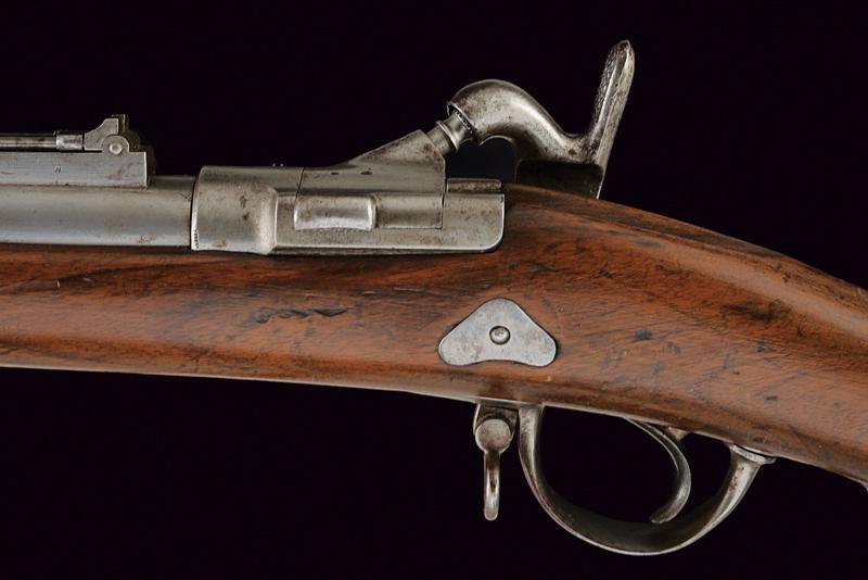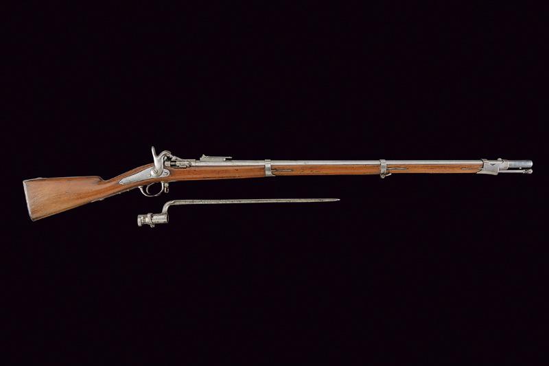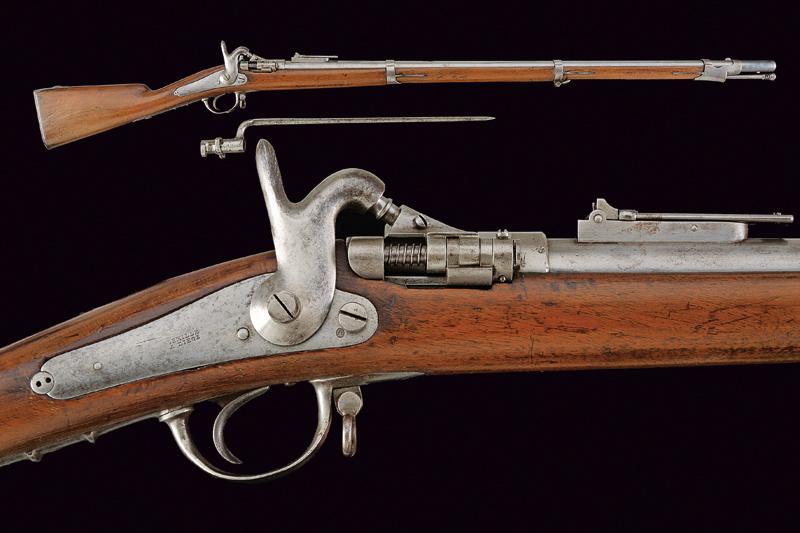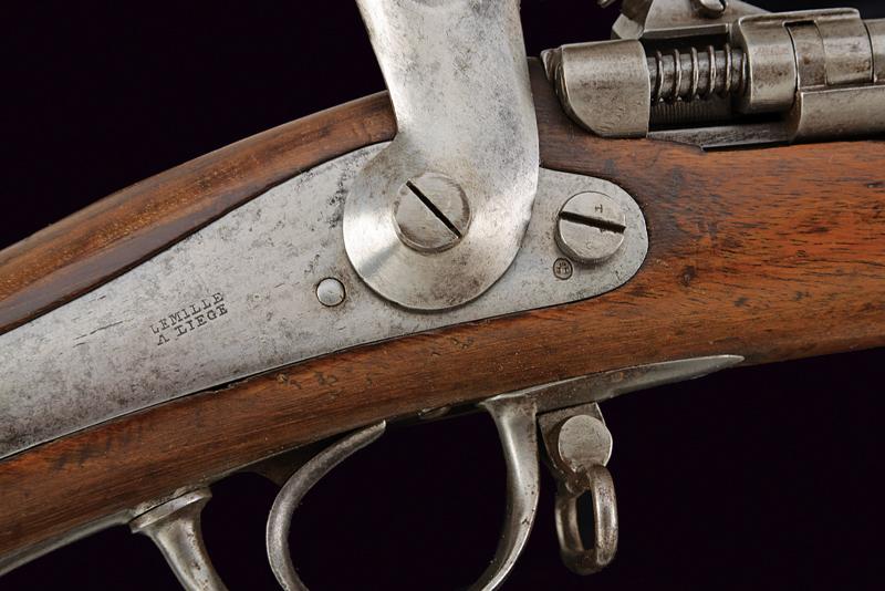 Raro fucile Mod. 1867 Snider con baionetta, datazione: Terzo quarto del XIX Secolo provenienza: Belgio, Canna tonda, rigata, dotata di alzo abbattibile e regolabile, mirino e dente d'innesto per baionetta, cal. 17,9 mm. Otturatore di tipo snider con punzone "L" sormontato da stella. Batteria a molla indietro marcata "LEMILLE A LIEGE" e con marchio "JL" entro un cerchio. Cassa in legno recante timbro e numeri sulla pala. Fornimenti in ferro con punzoni. La bacchetta con numerazione coeva alla cassa. Baionetta a ghiera con lama di sezione cruciforme (lungh. 55,3 cm, intaccature.) Meccanica funzionante. Fucili di questo tipo erano in uso nello Stato Pontificio per equipaggiare il corpo di volontari della riserva detti Squadriglie. lunghezza 142,4 cm.