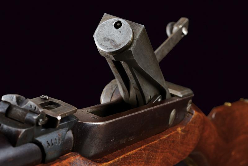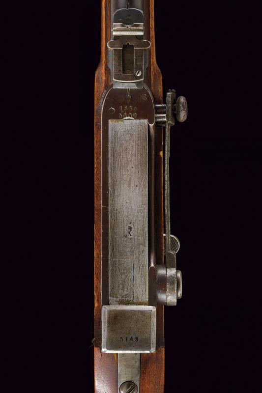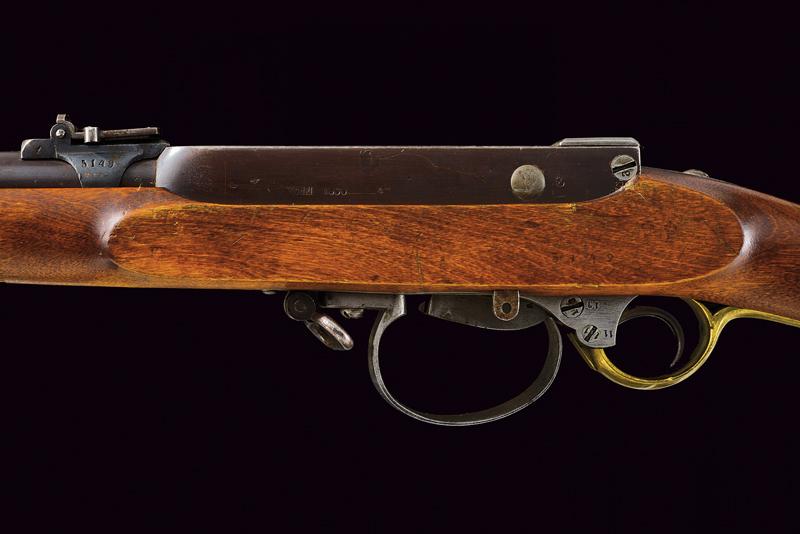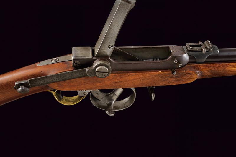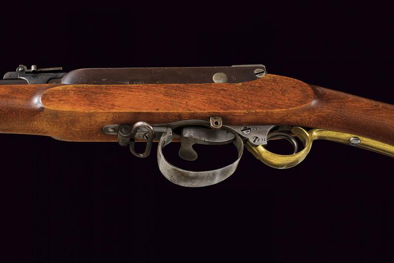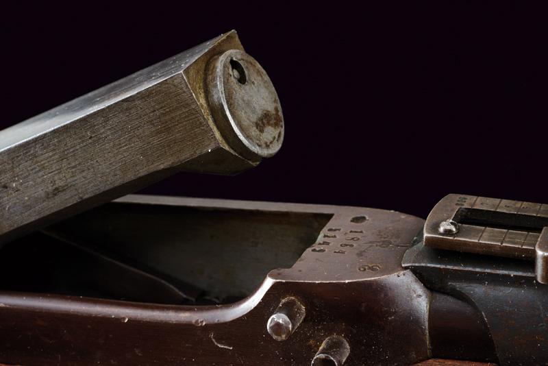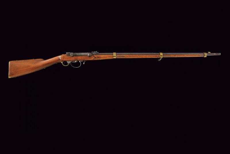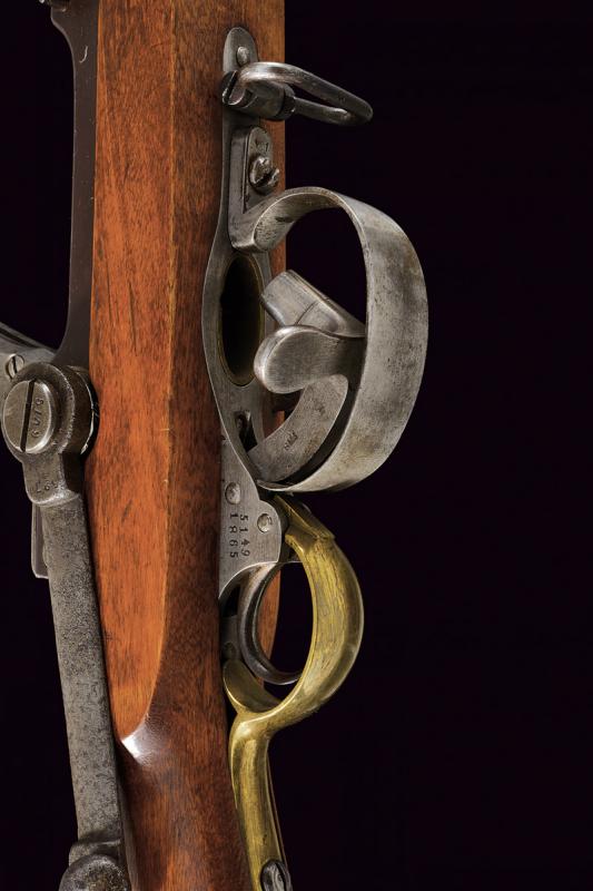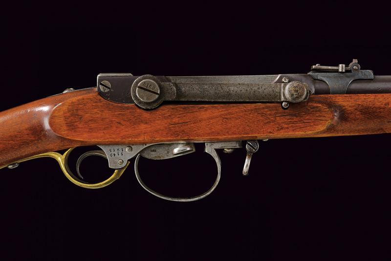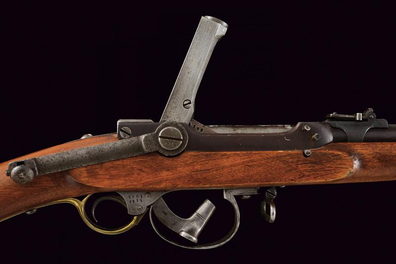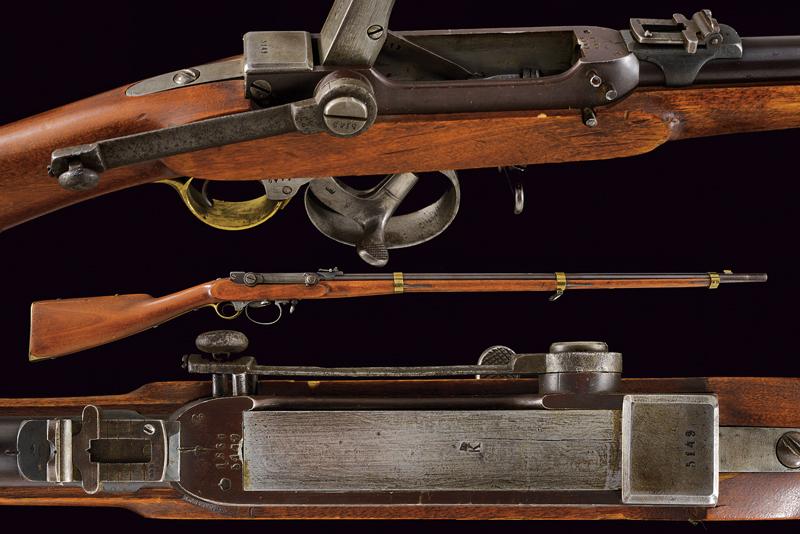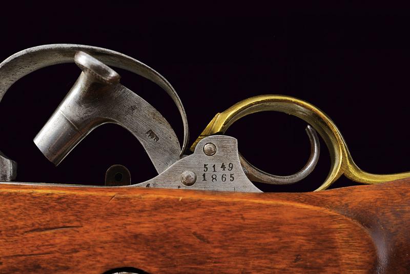 Fucile a retrocarica 'Kammerlader' mod. 1860, datazione: 1864 provenienza: Norvegia, Canna tonda, rigata, con alzo variabile, mirino e attacco per la baionetta, cal. 11.7 mm in volata; il castello marcato 'MODEL 1860', data '1864', matr. '5149' (monomatricola) e con altri punzoni. Cane nella parte inferiore con grilletto datato '1865'. Meccanismo a percussione anulare funzionante. Cassa intera in legno con fornimenti in ottone e ponticello in ferro. Bacchetta mancante. Molto raro. lunghezza 141.5 cm.