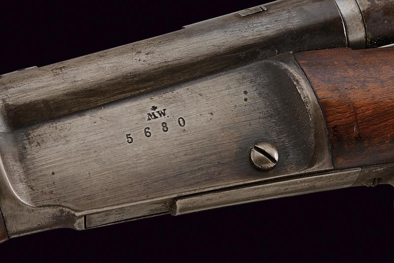 Fucile Vetterli Mod. 1871 Stutzer, datazione: 1881 - 1889 circa provenienza: Svizzera, Canna tonda rigata, con culatta ottagonale, dotata di mirino e di alzo regolabile, recante punzoni 'MW', 'R' e 'W' sotto croce elvetica ed altri marchi. Anima e rigatura in buono stato. Cal. 10,4 mm. Otturatore girevole-scorrevole funzionante. Castello con marcatura 'MW' (Montier Werkstätte a Berna) sotto croce elvetica. Grilletto funzionante e stecher da rivedere. Calcio ed astina lisci in legno, con timbri ben visibili. Fornimenti e bacchetta in ferro. Carrello, castello e canna tutti con matricola coeva '56xx'. Completa di cinghia. lunghezza 126 cm.