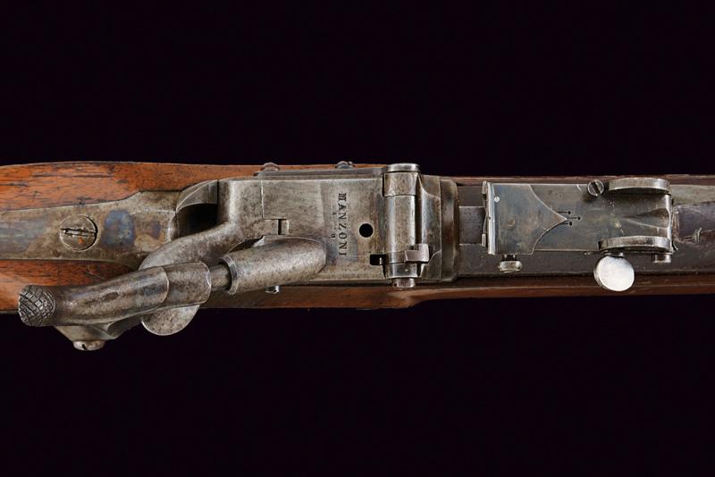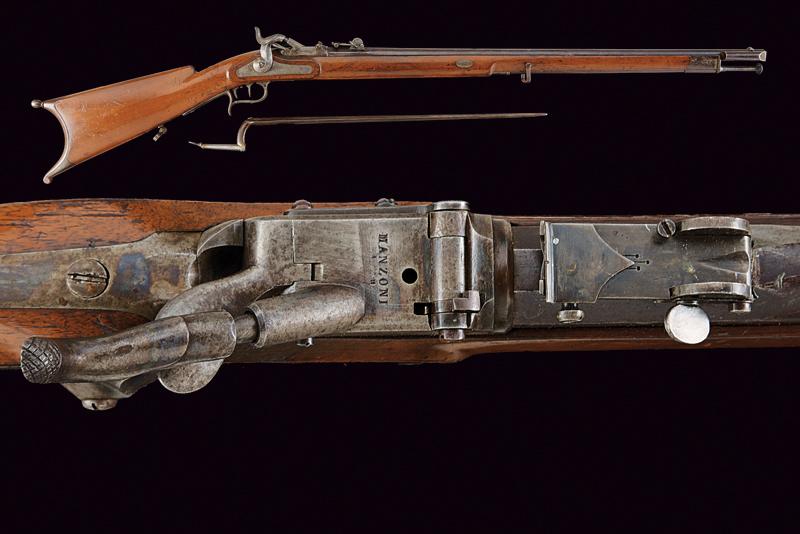 Fucile Milbank-Amsler a retrocarica Mod. 1851/63 con baionetta, datazione: Terzo quarto del XIX Secolo provenienza: Svizzera, Canna tonda rigata dotata di mirino, alzo regolabile, culatta ottagonale con punzoni poco leggibili. cal. 10.8 mm. Otturatore ribaltabile con punzone 'B' sotto croce elvetica e 'MANZONI'. Batteria a molla in avanti con bordo delineato chiaro. Meccanica funzionante. Cassa lunga in legno. Fornimenti in ferro. Bacchetta in ferro. Stecher ben funzionante. Completa di baionetta. lunghezza 126.5 cm.