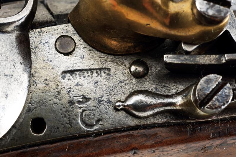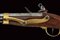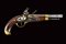 Pistola da cavalleria Mod. 1815 a pietra focaia, datazione: primo quarto del XIX Sec. provenienza: Spagna, Canna liscia a due ordini, ottagonale e tonda, leggermente strombata in volata, cal. 18 mm. Batteria con resti di marcatura 'ALABER' e tracce di un altro timbro. Meccanica funzionante. Cassa a tre quarti in legno, qualche crepa. Fornimenti in ottone. Bacchetta in ferro. Coccia con passante. lunghezza 37 cm.
