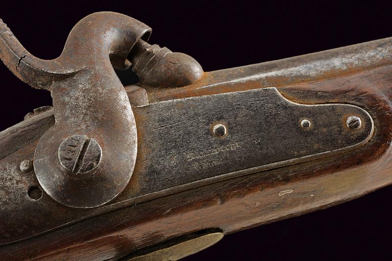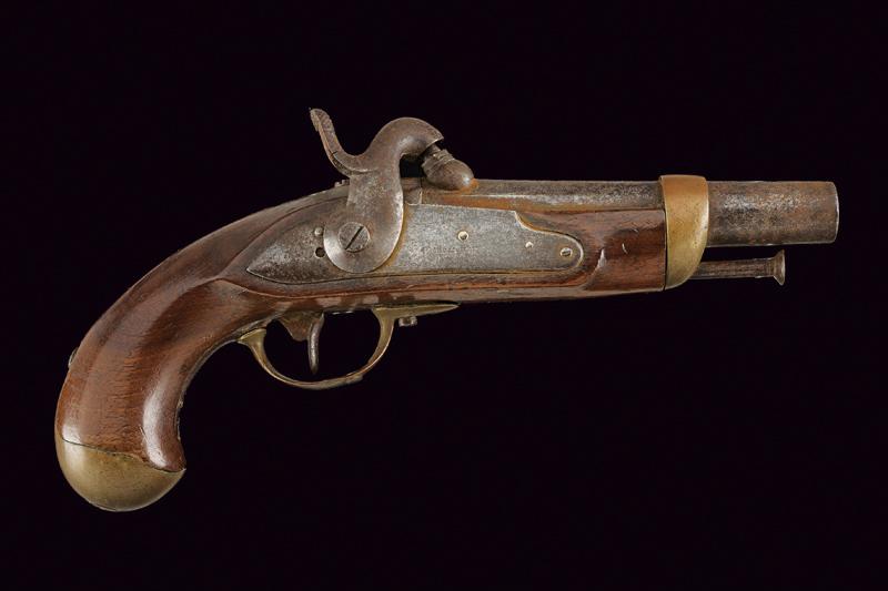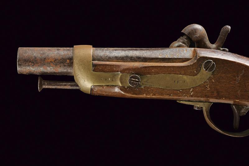 Pistola a luminello di Mazzocchi, datazione: 1861 provenienza: Stato Pontificio, Canna liscia a due ordini datata '1861', 'C. 15 2', matricola '1313' e con punzoni a chiavi, cal. 15.5 mm; batteria a molla in avanti marcata 'F.lli Mazzocchi Roma'; cassa in legno con fornimenti in ottone marcati tutti '1313' e con bacchetta in ferro. lunghezza 25.5 cm.