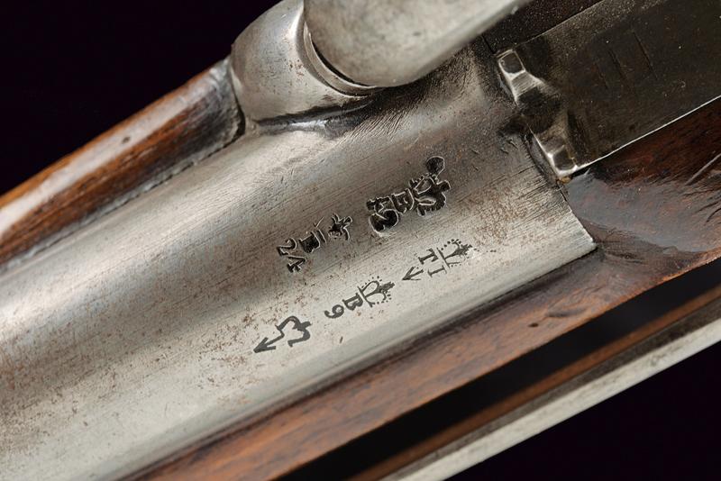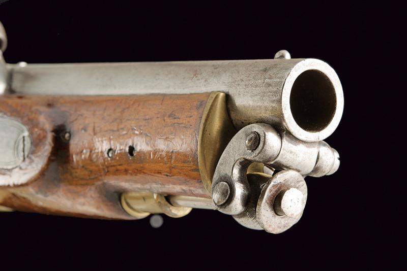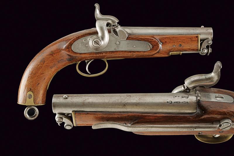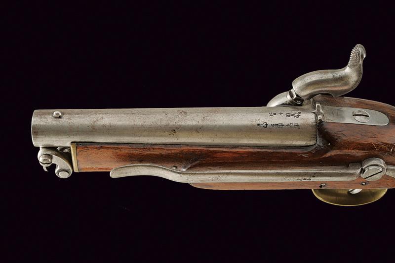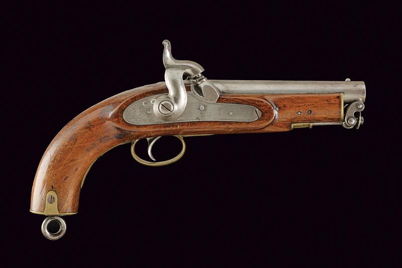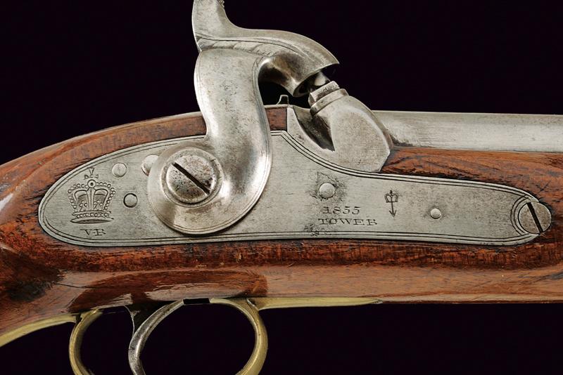 Pistola a luminello Tower 'Sea Service', datazione: Metà del XIX Secolo provenienza: Regno Unito, Canna cilindrica liscia, dotata di mirino, con vari punzoni britannici e la Broad Arrow, cal. 14,4 mm. Codolo con alzo fisso. Cartella datata '1855' e con corona sormontante 'V.R.'. Meccanica ben funzionante. Cassa intera in legno. Fornimenti in ottone. Gancio da cintura in ferro punzonato. Marcatura 'S. PRESCOTT' sul legno. Tipica bacchetta a snodo. lunghezza 28,5 cm.