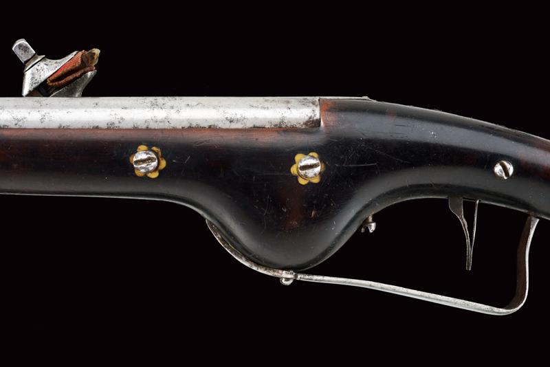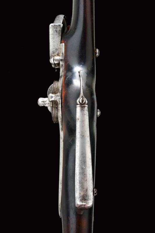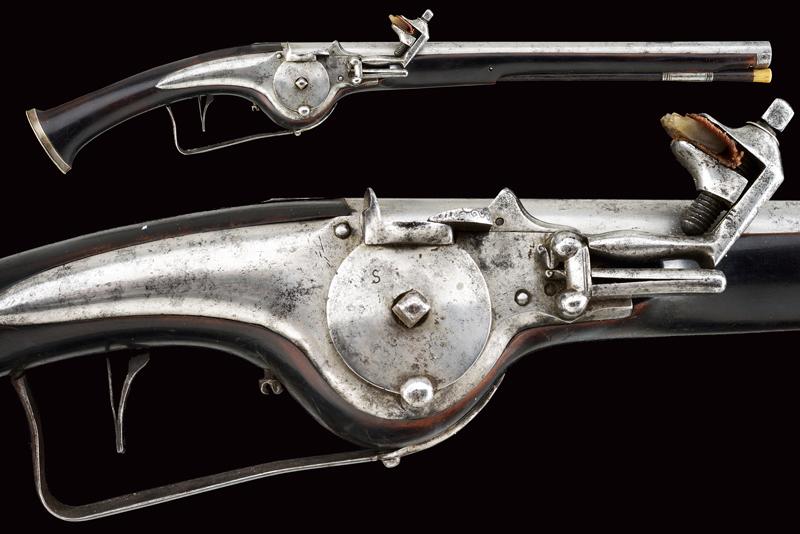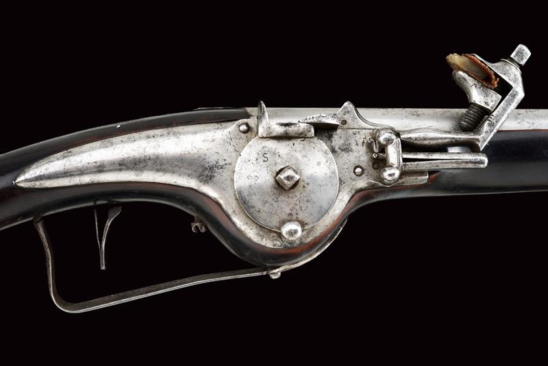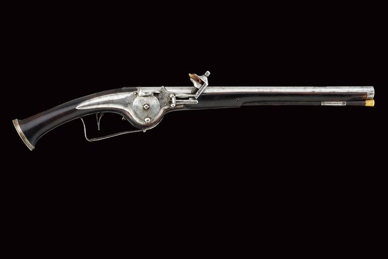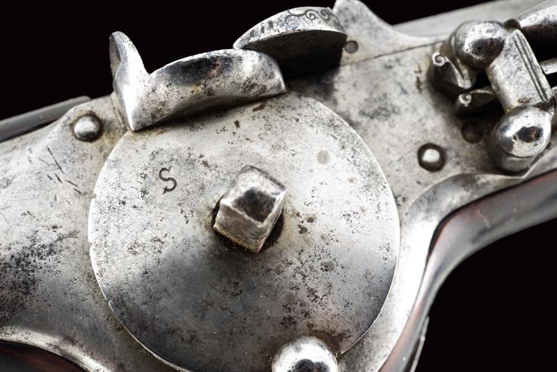 Pistola militare a ruota, datazione: Prima metà del XVII Secolo provenienza: Germania, Canna tonda liscia, piastra con cartella bombata, cassa in legno scuro con rosette in osso alle viti di fissaggio, fornimenti lisci, fondello dell'impugnatura in argento recante inciso al centro uno scudo con le insegne del 'Santo Sepolcro', bacchetta con battipalla in osso. lunghezza 57 cm.