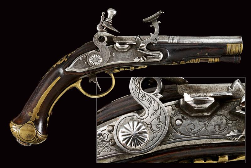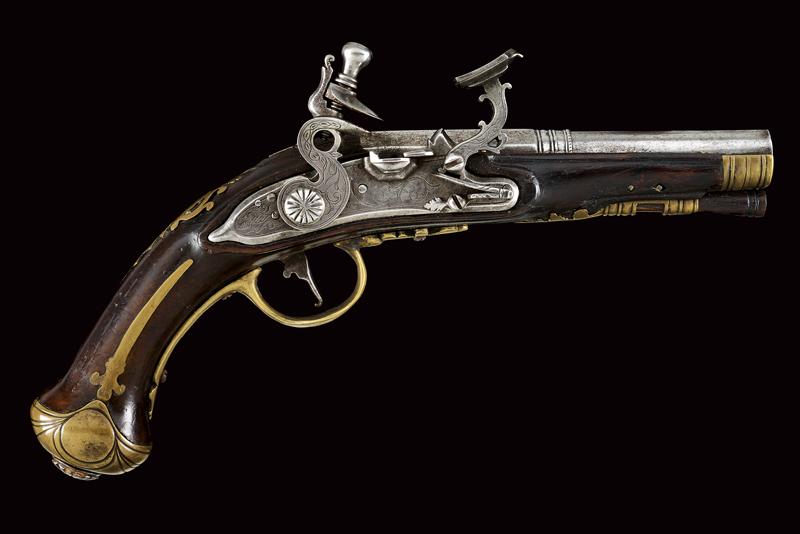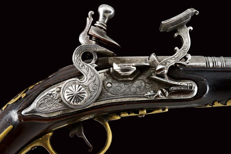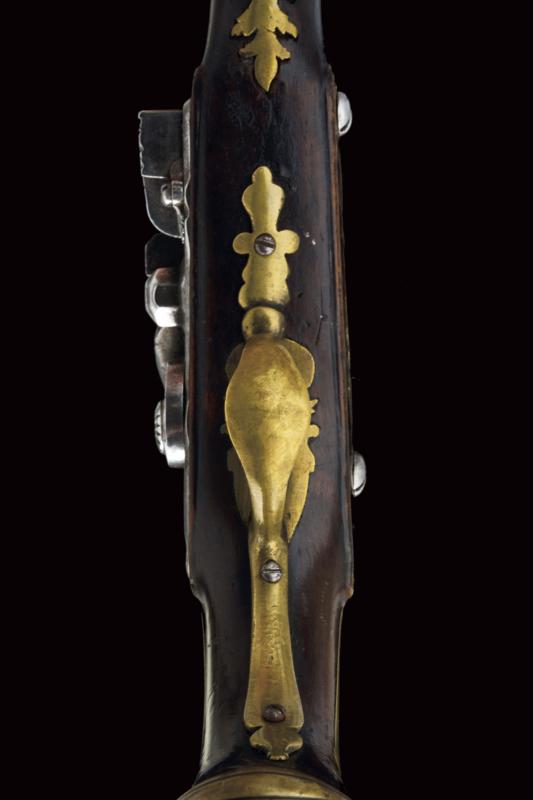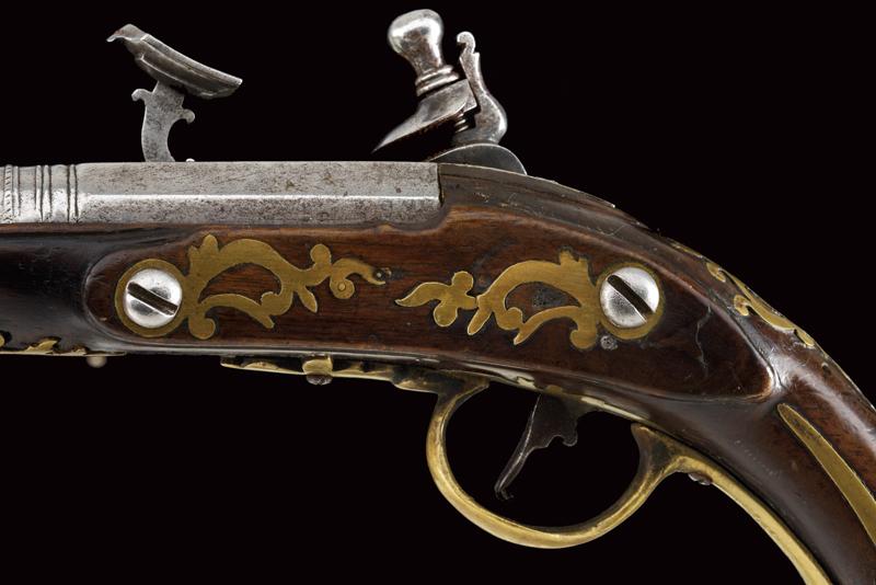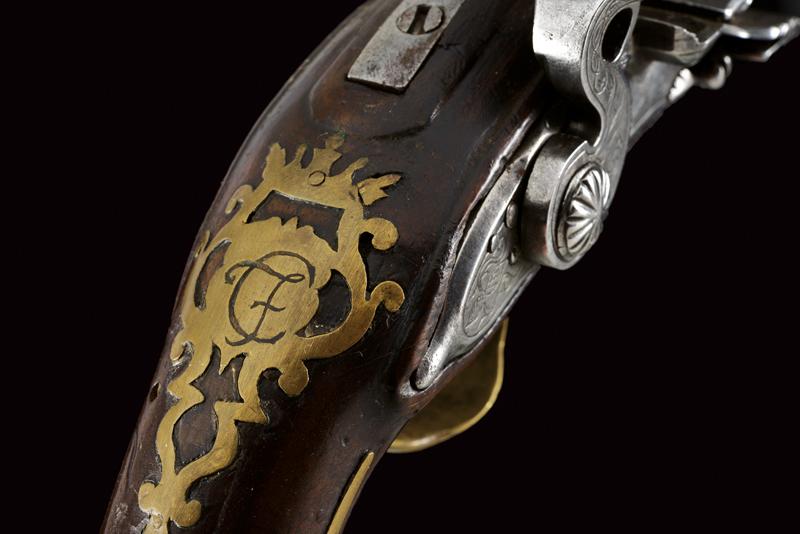 Pistola da viaggio alla fiorentina, datazione: XVIII Secolo provenienza: Area Tosco-Emiliana, Canna liscia a due ordini, ottagonale e tonda, con anellature al cambio, cal. 10,7 mm. Batteria a cartella piatta con bordi scantonati e incisioni a racemi. Meccanica funzionante, scorrimento del copriscodellino leggermente difficoltoso. Cassa intera in legno con fornimenti in ottone. Lo scudetto dorsale coronato, liscio e con monogramma 'CF'. La coccia delineata, la contropiastra parzialmente traforata. Bacchetta in legno. lunghezza 21,5 cm.