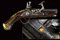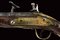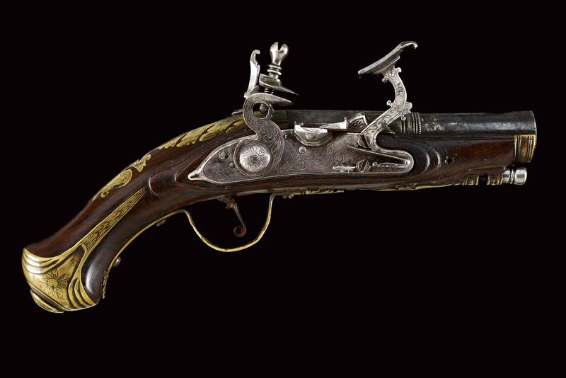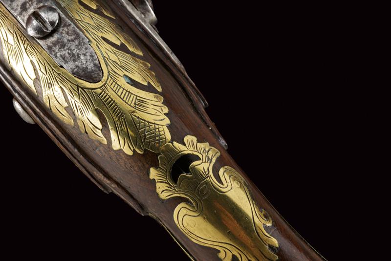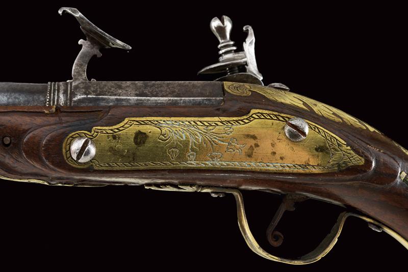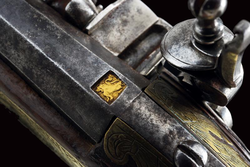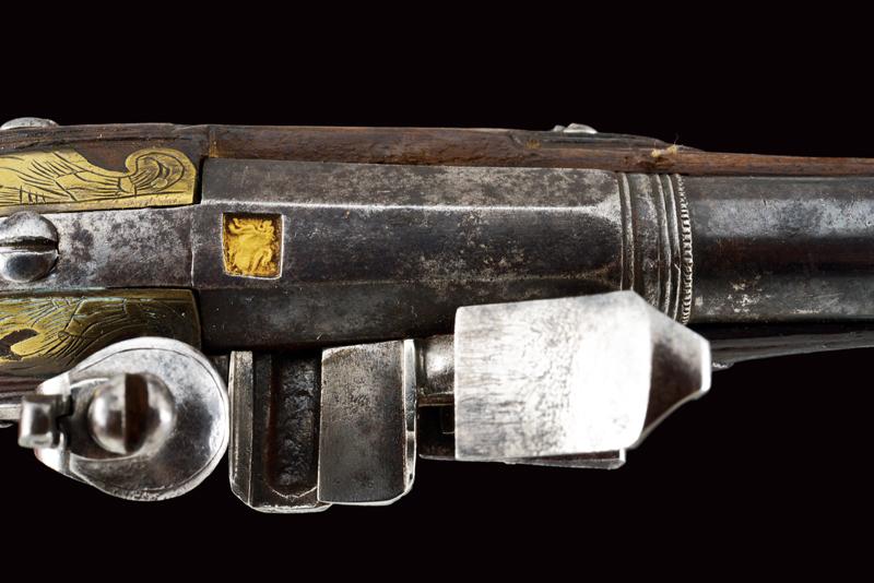 Pistola da viaggio alla fiorentina, datazione: XVIII Secolo provenienza: Area Tosco-Emiliana, Canna liscia a due ordini, ottagonale e tonda, con anellature al cambio, cal. 13,4 mm. Al dorso un punzone rimesso in oro effigiante un leone passante. Batteria a cartella piatta con bordi scantonati e incisioni a racemi. Meccanica da rivedere. Cassa intera in legno con fornimenti in ottone. Attorno al codolo della canna una placca incisa a foglie e collegata allo scudetto dorsale. La coccia incisa a fiori, anche il ponticello a fiori, la contropiastra incisa en suite. Bacchetta in legno con cavastracci e battipalla in ferro. lunghezza 19,7 cm.
